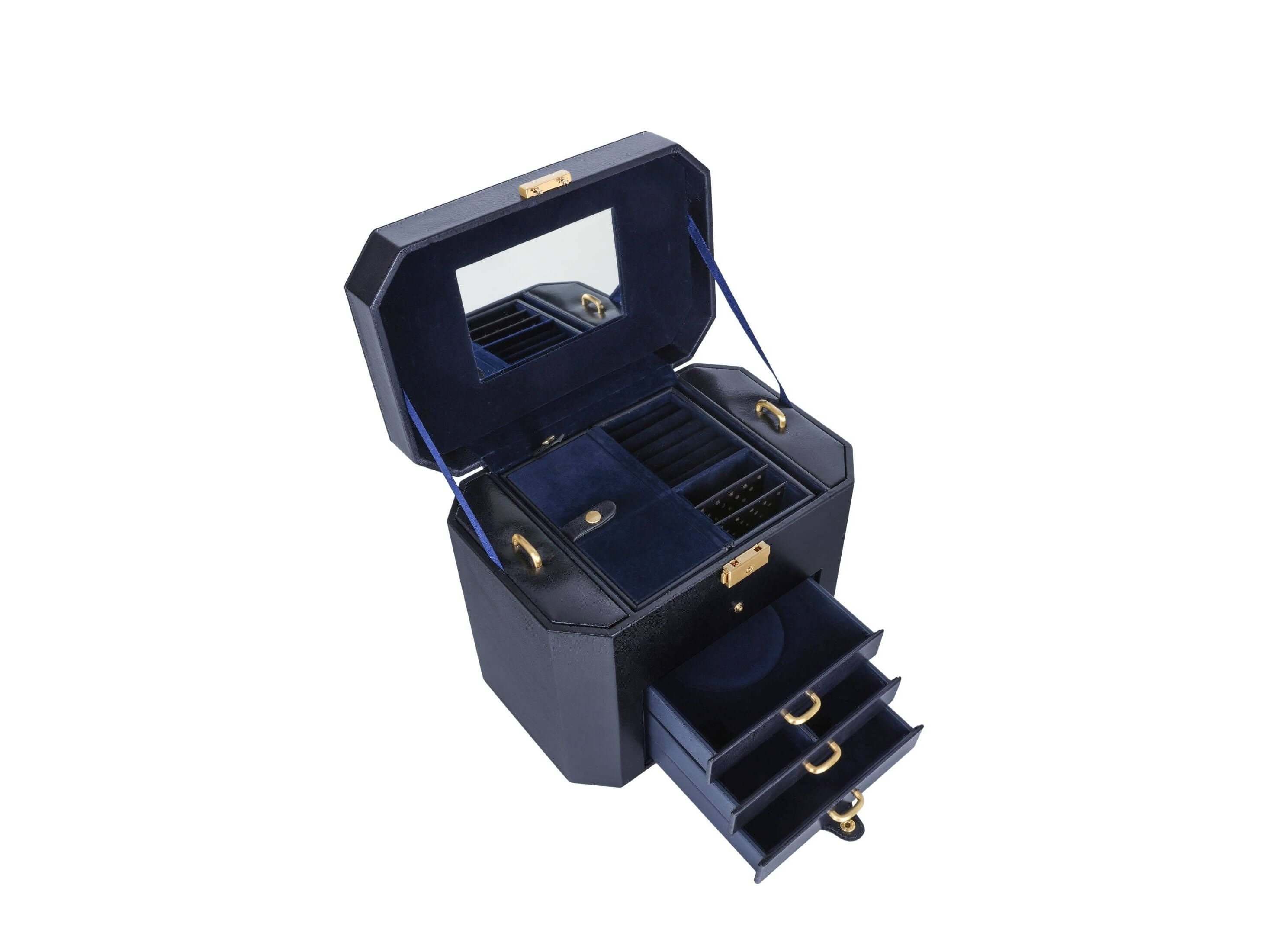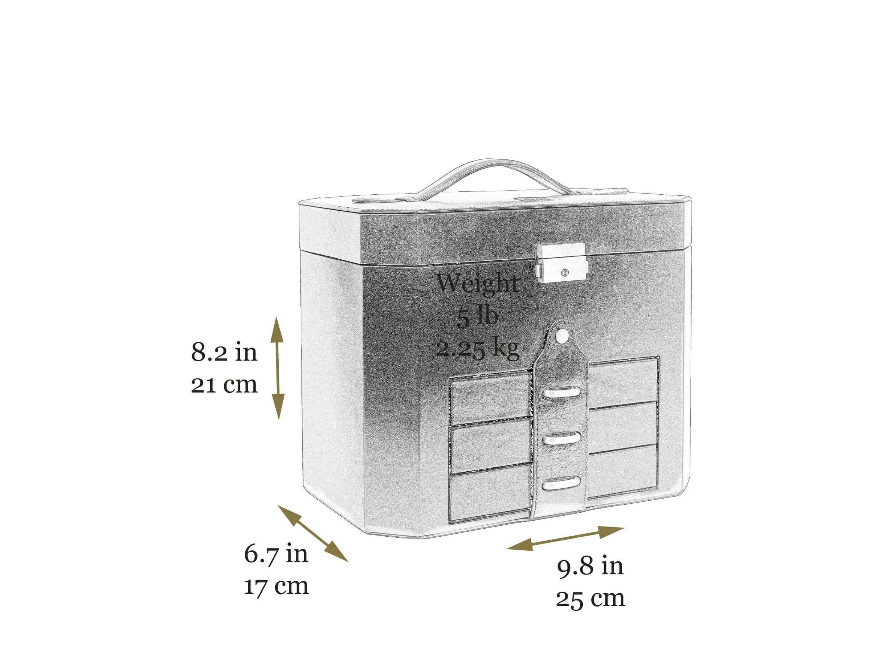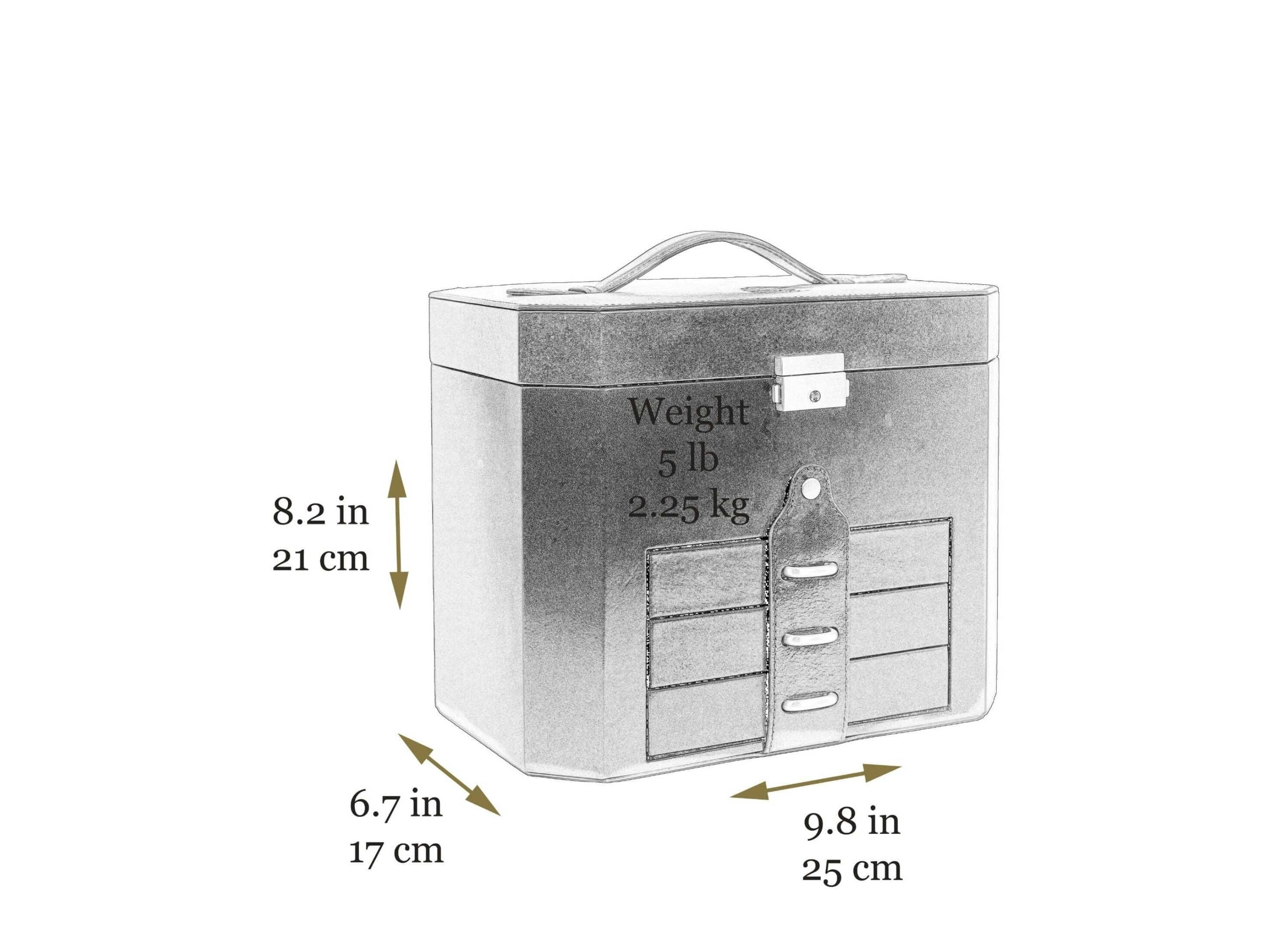 Préservez vos trésors avec élégance. Cette grande boîte à bijoux en cuir A Handful of Dust allie fonctionnalité et raffinement : trois tiroirs intelligemment aménagés, compartiments dédiés aux colliers, bagues et boucles d'oreilles, et doublure en velours luxueux. La poignée ergonomique facilite le transport, tandis que la serrure sécurise vos précieux bijoux. Bonus : une mini boîte de voyage amovible pour vos déplacements. Design intemporel et construction robuste qui subliment votre coiffeuse ou chambre.