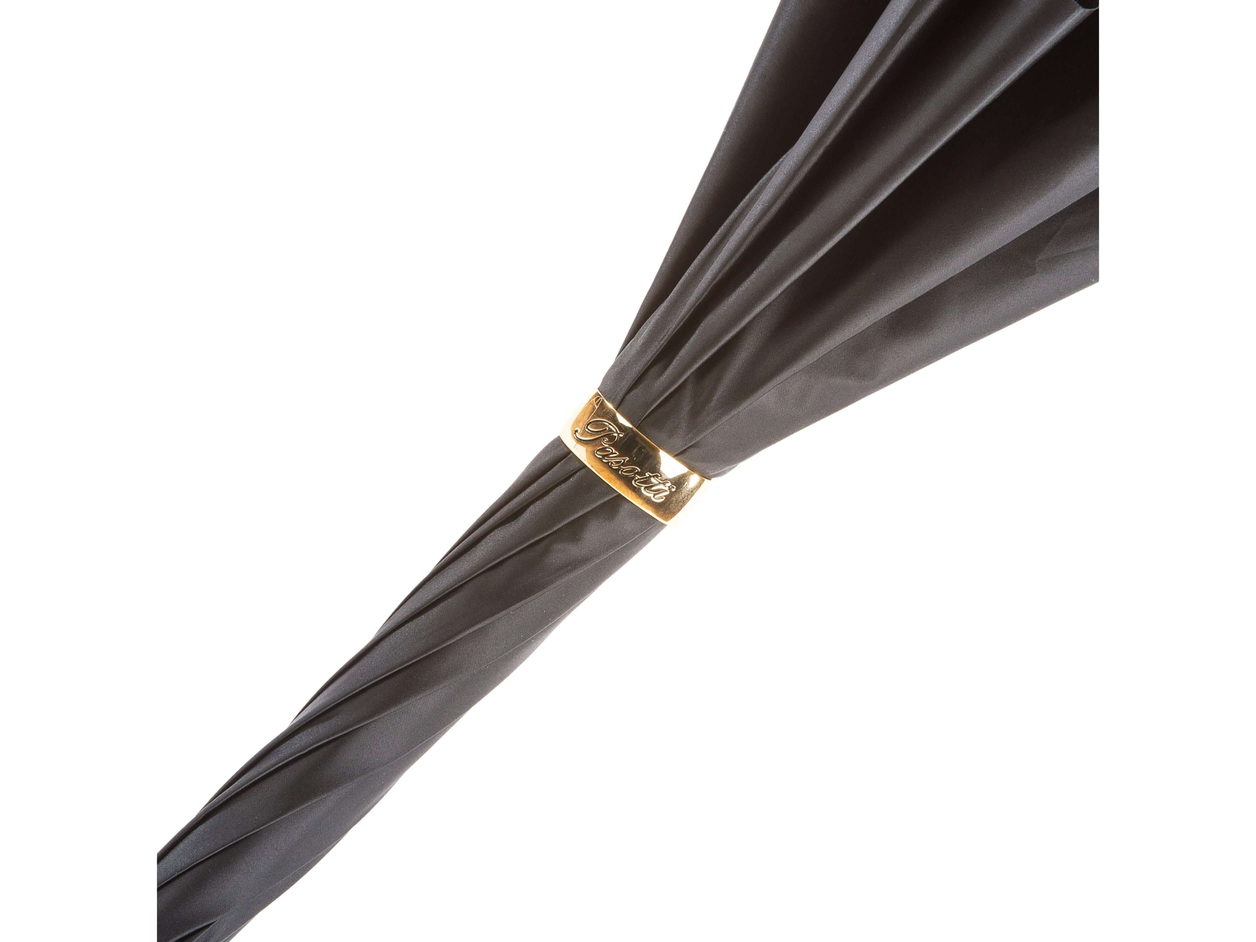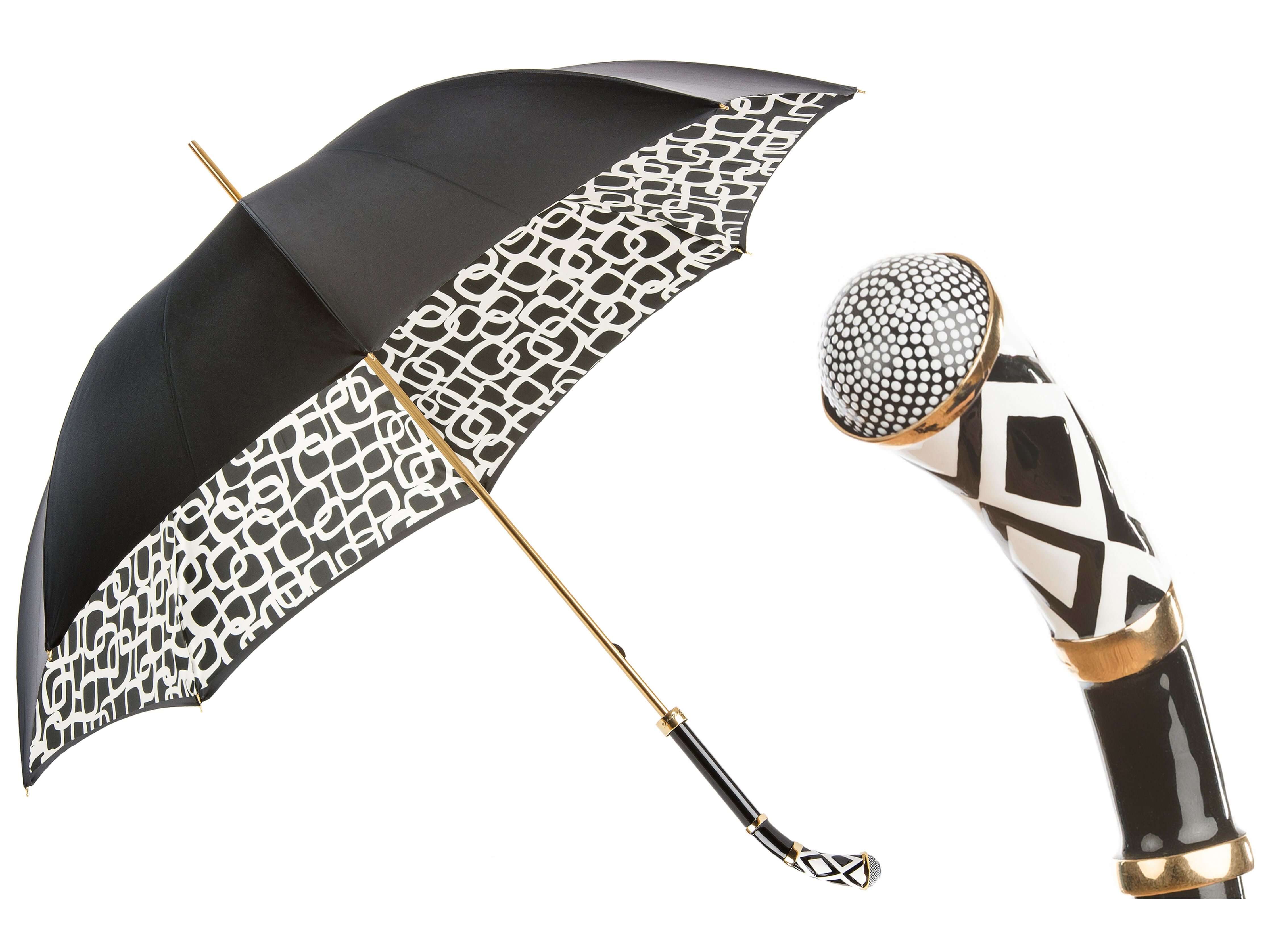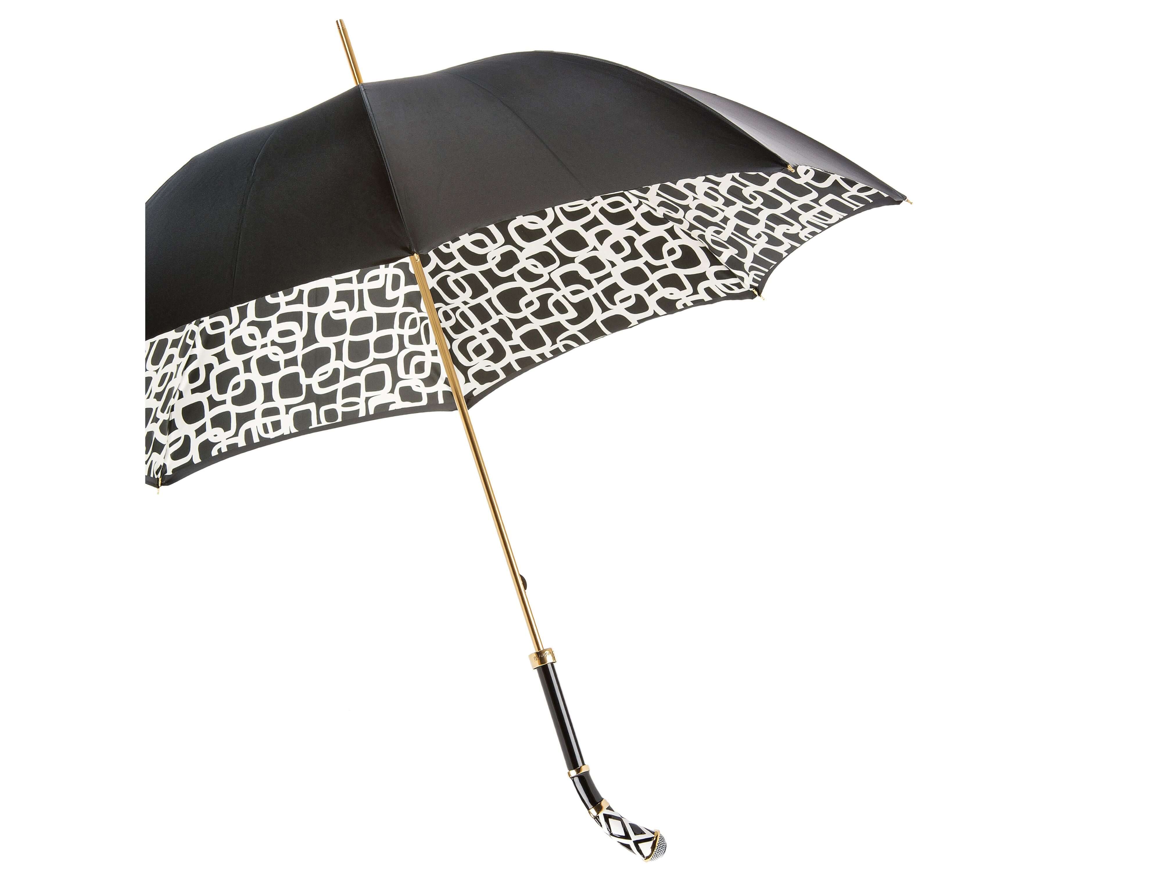 Parapluie double toile en satin noir élégant, finition platine et motifs losanges fins. Résistant et sophistiqué, idéal pour affronter la pluie avec style.