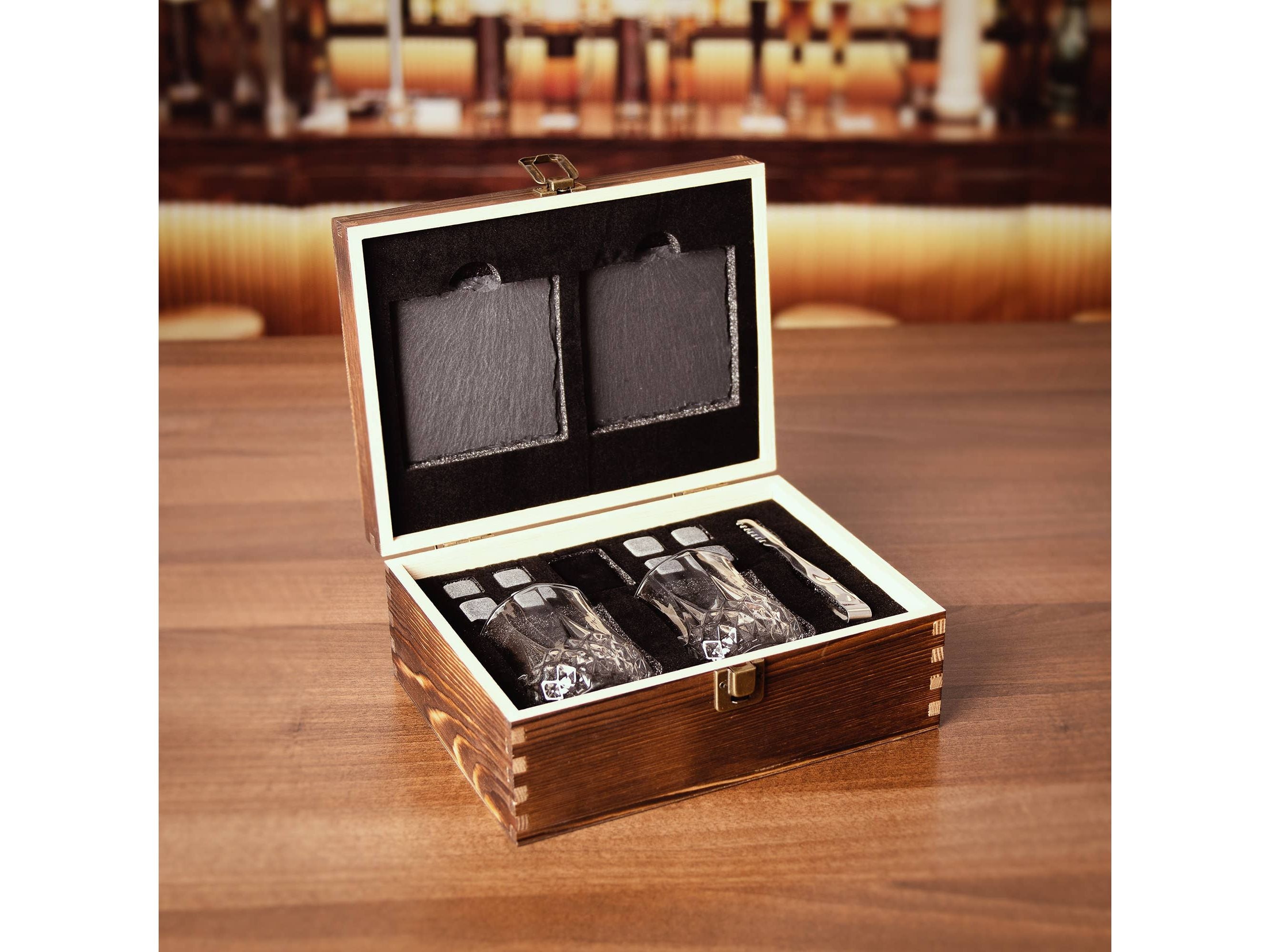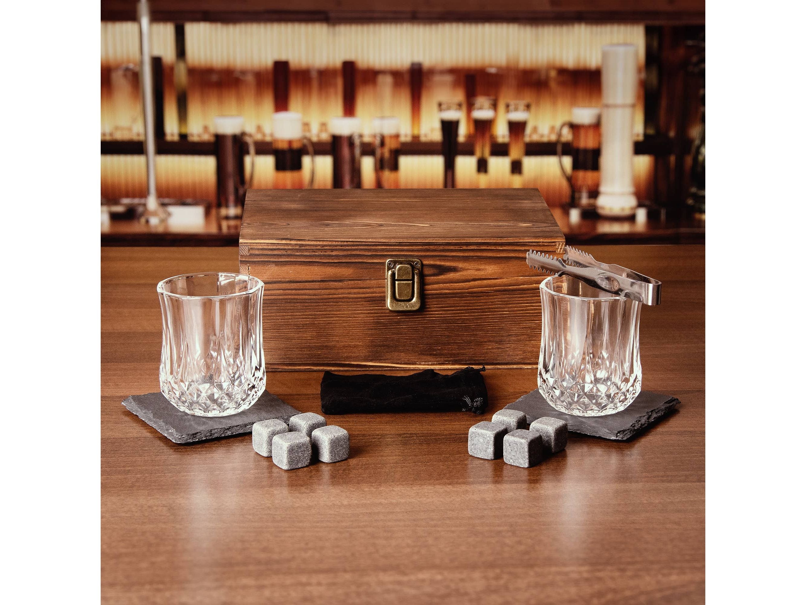 Découvrez l'art de déguster le whisky avec cet ensemble Bar Originale, conçu pour les amateurs exigeants. Composé de deux verres à whisky aux proportions généreuses, de deux sous-verres en ardoise naturelle et de huit pierres à whisky en granit, cet ensemble offre une expérience de dégustation raffinée sans dilution excessive. Les pinces pratiques facilitent la manipulation des pierres, tandis que la pochette de rangement assure la protection de vos accessoires. Présenté dans une élégante boîte en bois, cet ensemble constitue un cadeau de prestige idéal pour les connaisseurs. Chaque pierre de granit, étant un produit naturel, possède ses propres variations de teinte, garantissant l'unicité de votre ensemble.