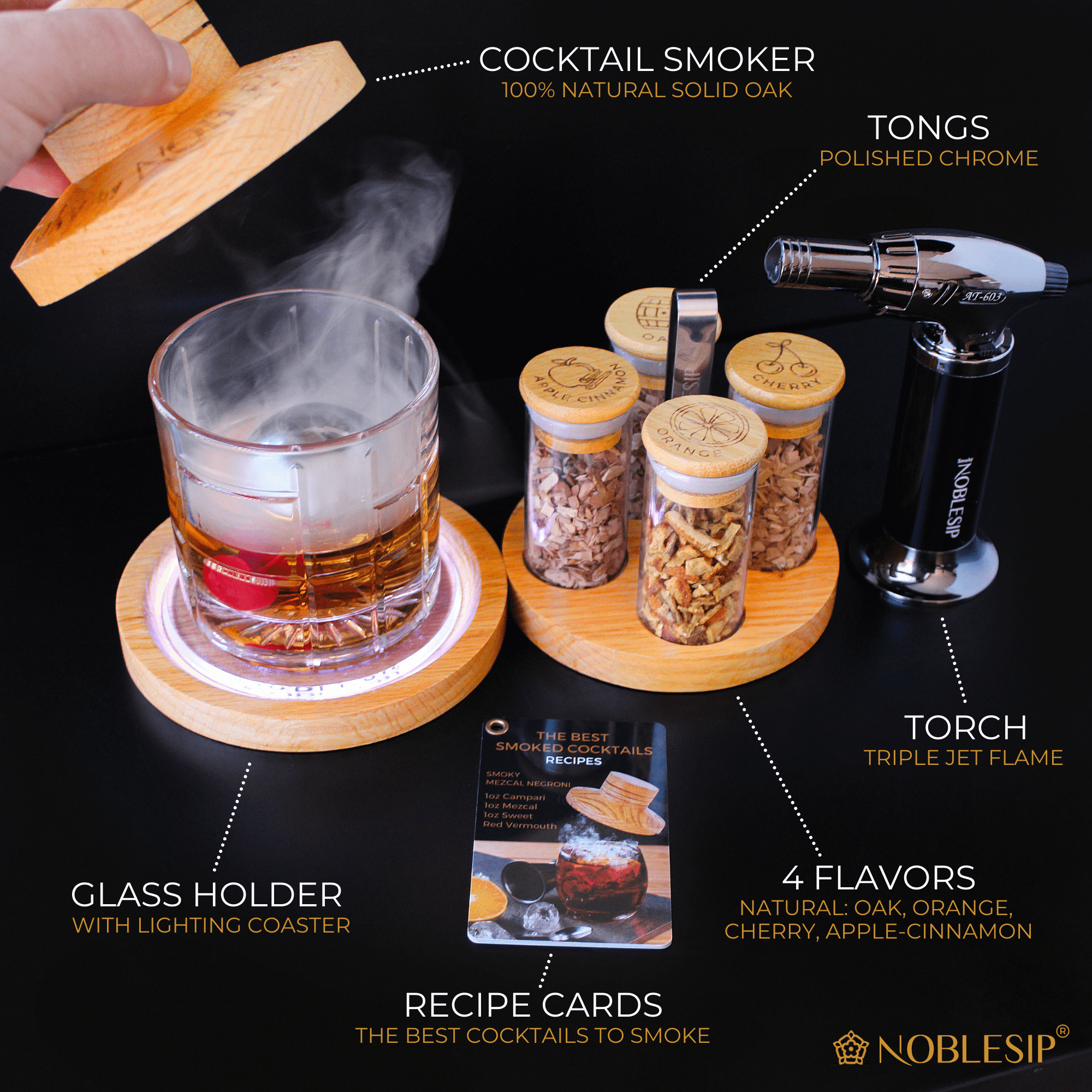 Transformez vos cocktails en expérience sensorielle avec le Kit Fumeur « Smoky Pro » de NOBLESIP. Ce coffret premium inclut un fumeur en chêne massif, un chalumeau fonctionnel et quatre essences de bois soigneusement sélectionnées—chêne, cerise, pomme-cannelle et orange—pour sublimer chaque gorgée. Conçu pour les amateurs exigeants et les bars à domicile, ce kit complet livre aussi des recettes de cocktails signature et des accessoires professionnels. Présenté dans une élégante boîte cadeau avec certificat de don, c'est le présent idéal pour les passionnés de whisky. Fabriqué aux États-Unis en bois de qualité supérieure, chaque achat soutient les banques alimentaires locales.