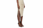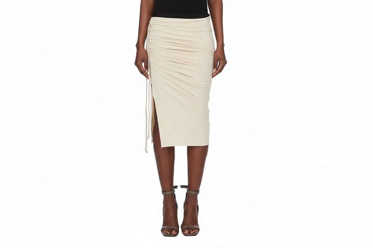 Jupe longueur genou en coton jersey biologique certifié GOTS. Taille élastiquée ajustée qui épouse les hanches avec un drapé naturel et des fronces rassemblées sur la couture de la cuisse droite. La fente latérale est ajustable via un cordon de serrage pour moduler la hauteur et intensifier le drapé selon vos préférences.
