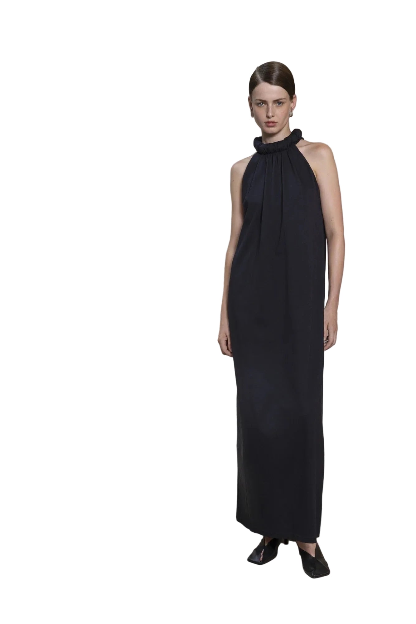 Robe longue élégante en noir, conçue pour une silhouette épurée et intemporelle. Coupe fluide qui épouse délicatement le corps, idéale pour les occasions formelles et les événements sophistiqués. Longueur au sol pour un effet dramatique et raffiné. Détails minimalistes qui mettent en avant la qualité du tissu et la finesse de la confection. Pièce polyvalente à associer avec des accessoires discrets pour un look de luxe moderne.