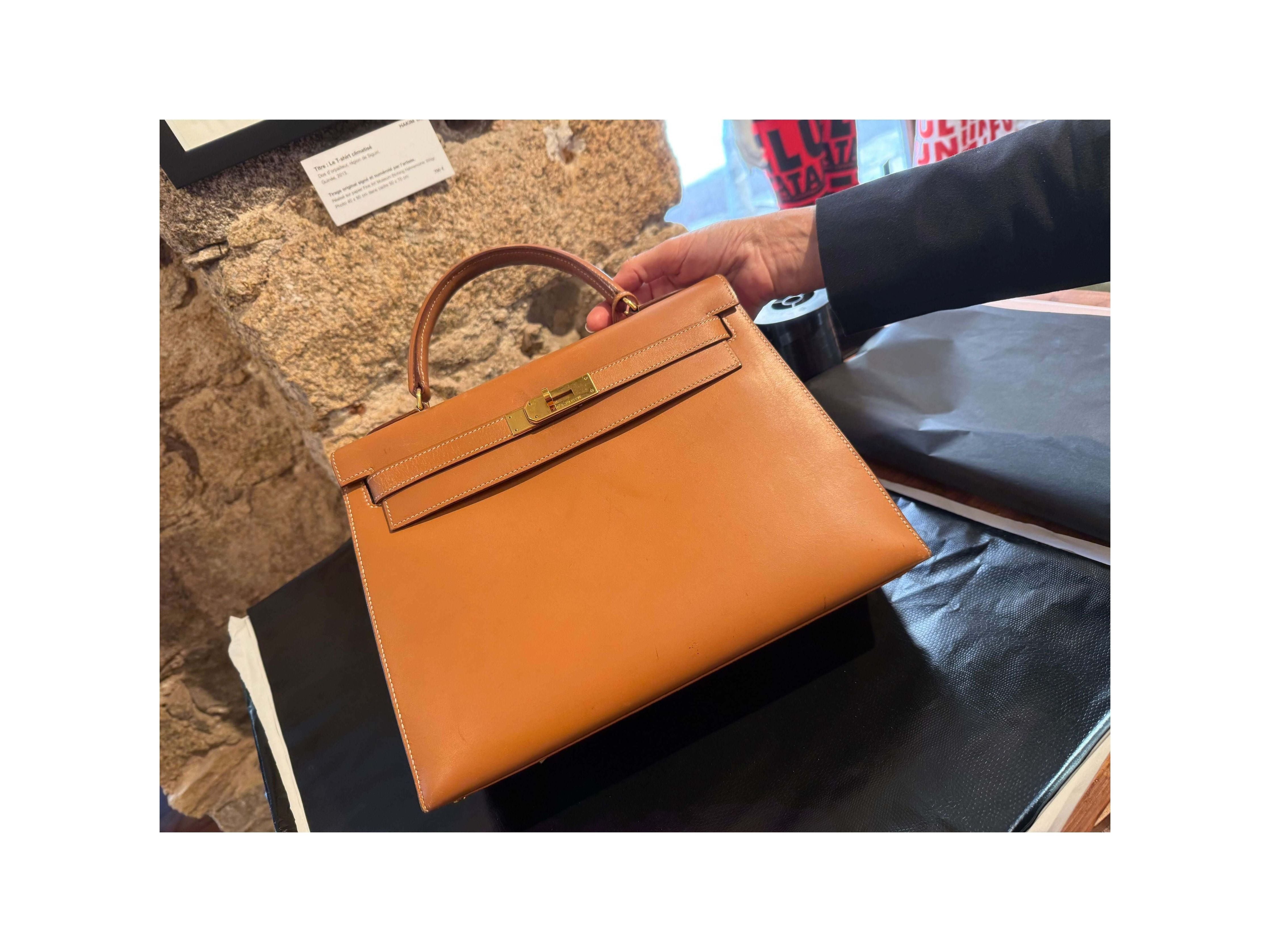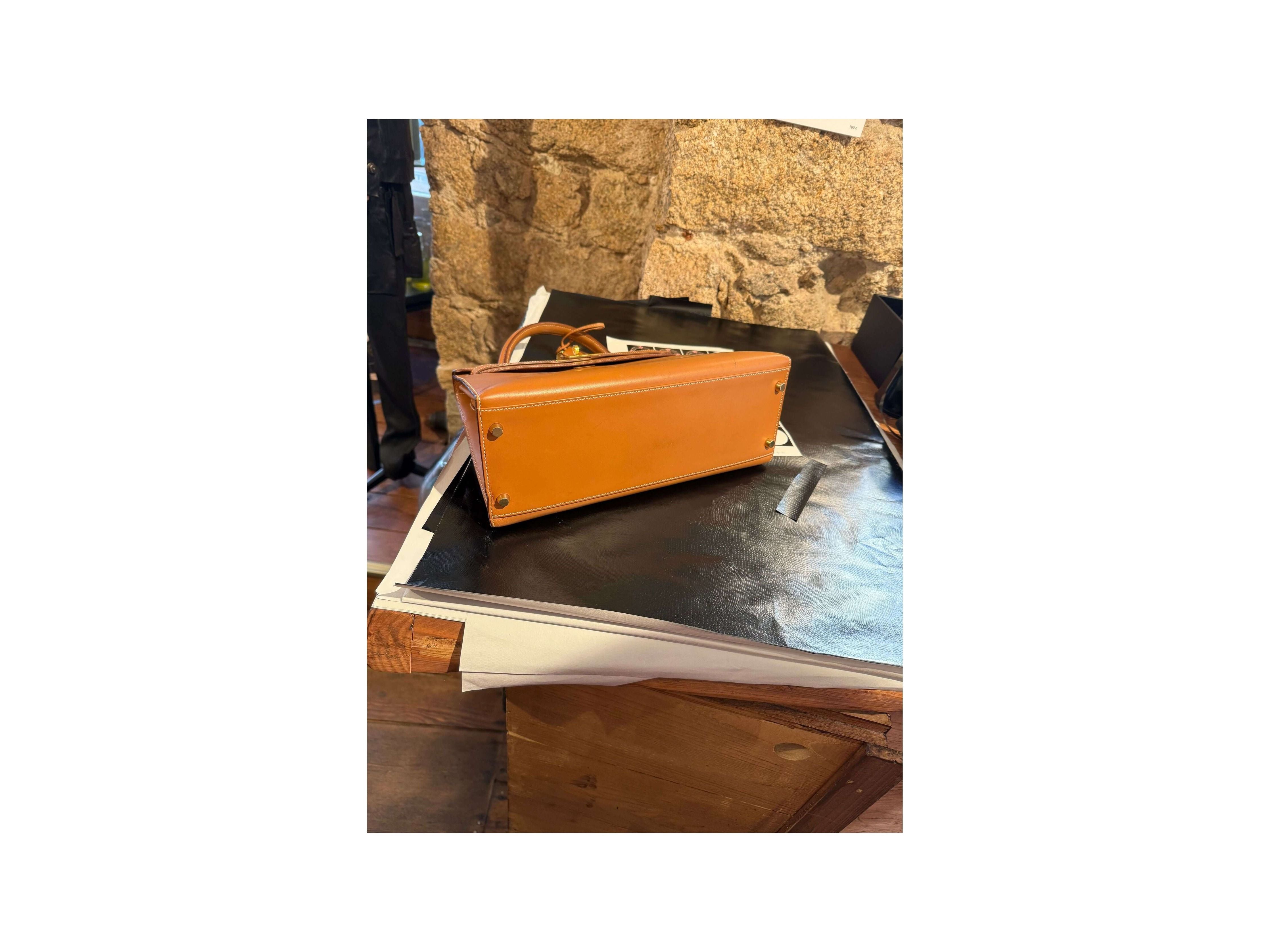 Sac Kelly sellier 32 vache naturelle surpiquée blanc, doublure en chèvre marron clair, bijouterie en métal doré
