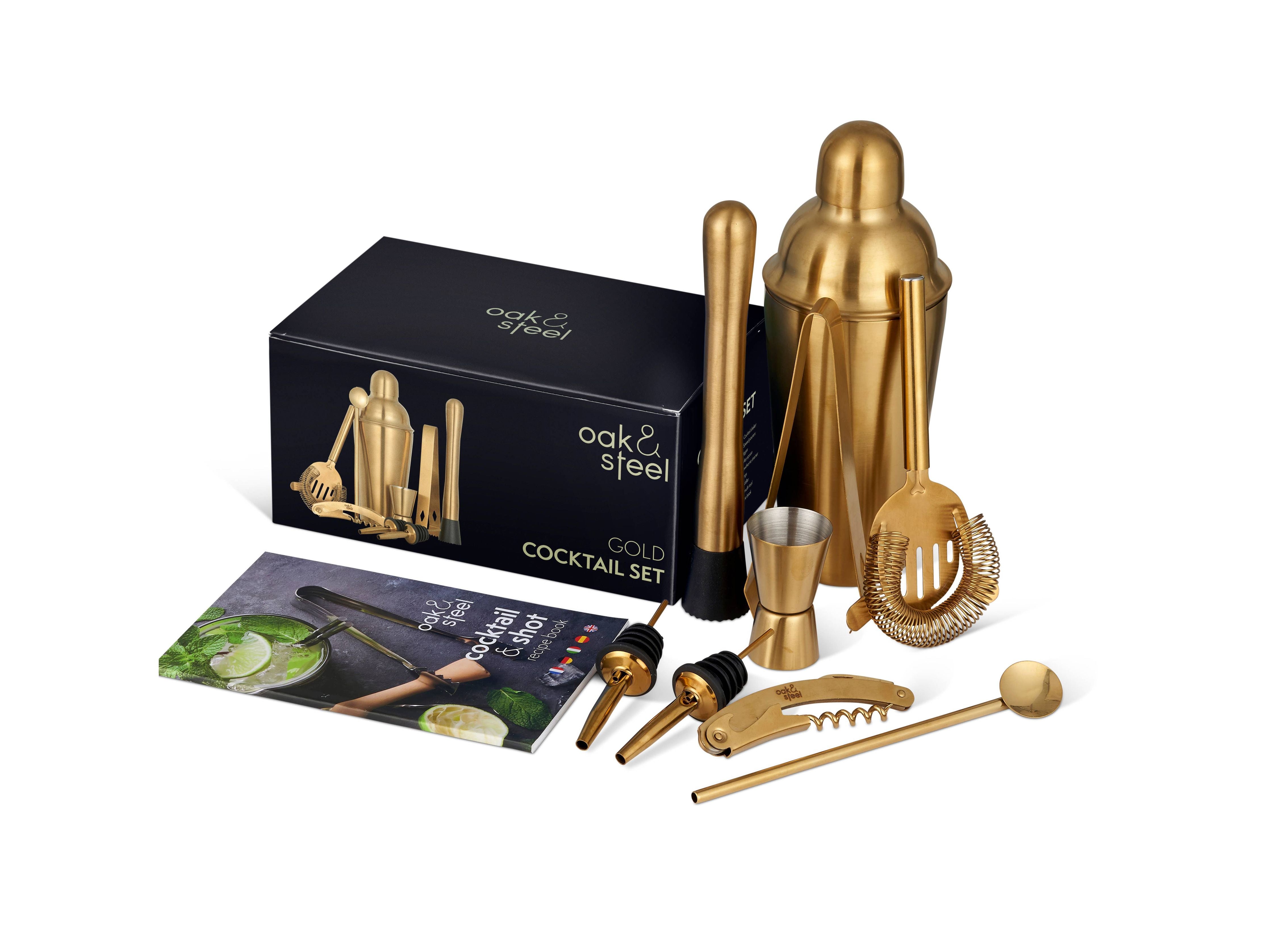 L'ensemble comprend : un shaker à cocktail, une passoire Hawthorne, un pilon, un outil multifonction pour bar, une cuillère Julep, un double doseur, 2 verseuses rapides, des pinces à glace, un livre de recettes, un coffret cadeau