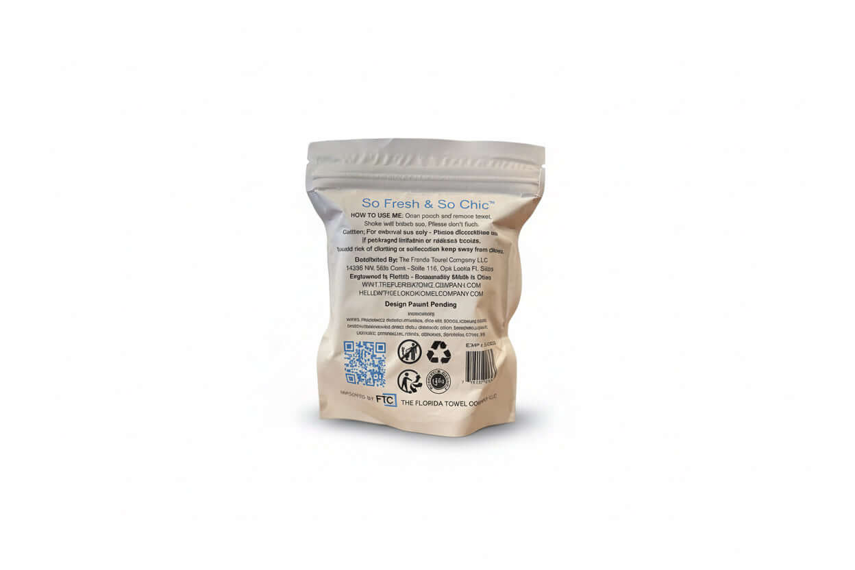 So Fresh & So Chic™ – Serviette Rafraîchissante COMMENT M'UTILISER : Ouvrez la pochette et retirez la serviette. Secouez bien avant utilisation. Ne pas jeter dans les toilettes. Mise en garde : Réservé à un usage externe uniquement – Cessez l'utilisation en cas d'irritation prolongée ou de rougeur. Pour éviter tout risque d'étouffement ou d'asphyxie, tenir éloigné des enfants. Distribué par : The Florida Towel Company LLC 14350 NW, 56th Court - Suite 116, Opa Locka FL 33054 Engineered en Floride – Fabriquée de manière responsable en Chine