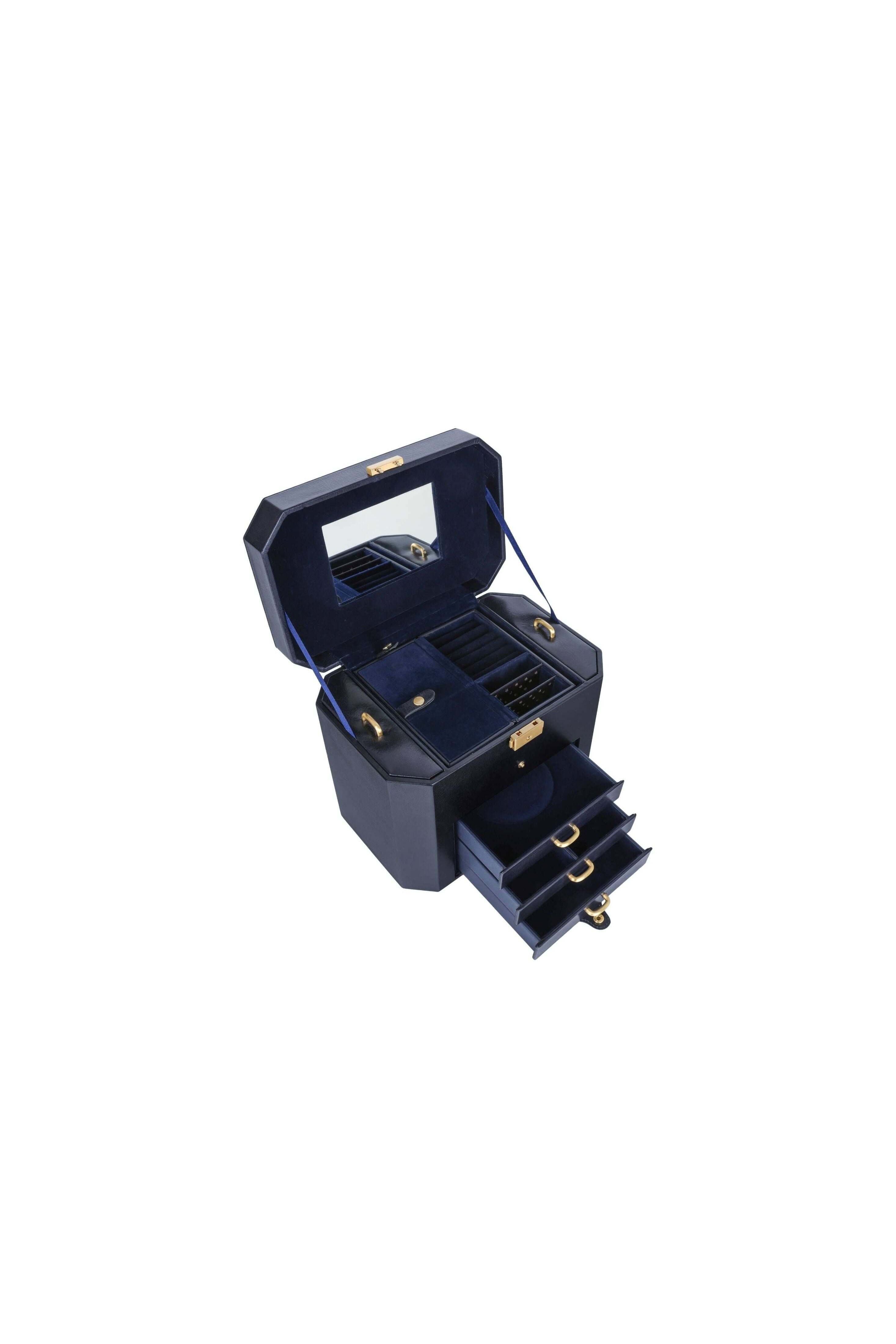 Preserve your treasures in style. This large leather jewelry box from A Handful of Dust combines functionality and refinement: three cleverly designed drawers, dedicated compartments for necklaces, rings, and earrings, and a luxurious velvet lining. The ergonomic handle makes it easy to carry, while the lock keeps your precious jewelry secure. Bonus: a removable mini travel case for when you're on the go. Timeless design and sturdy construction that will enhance your vanity or bedroom.