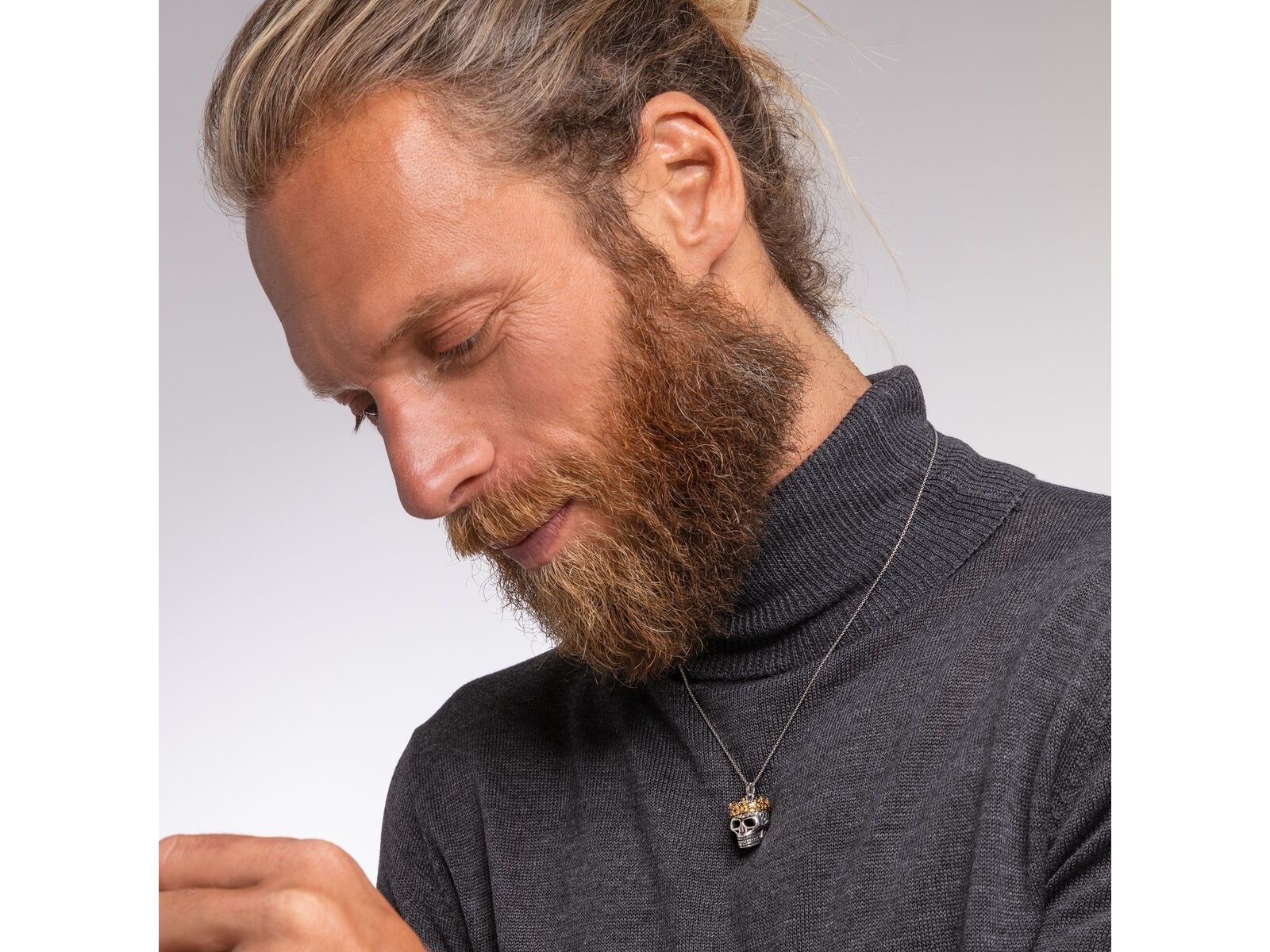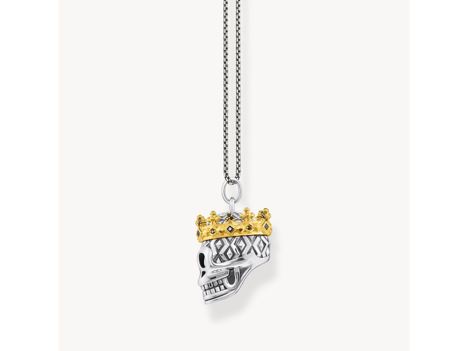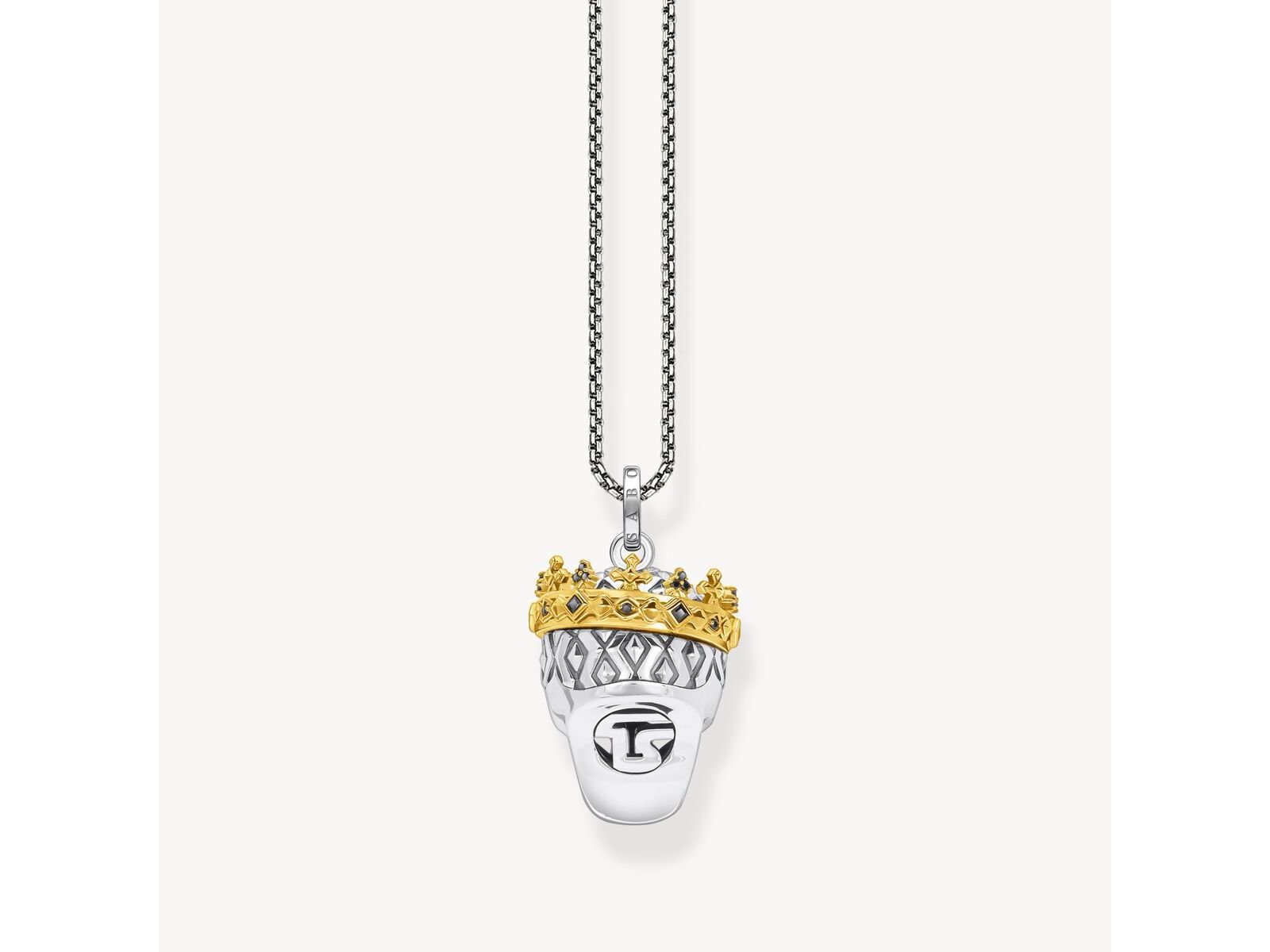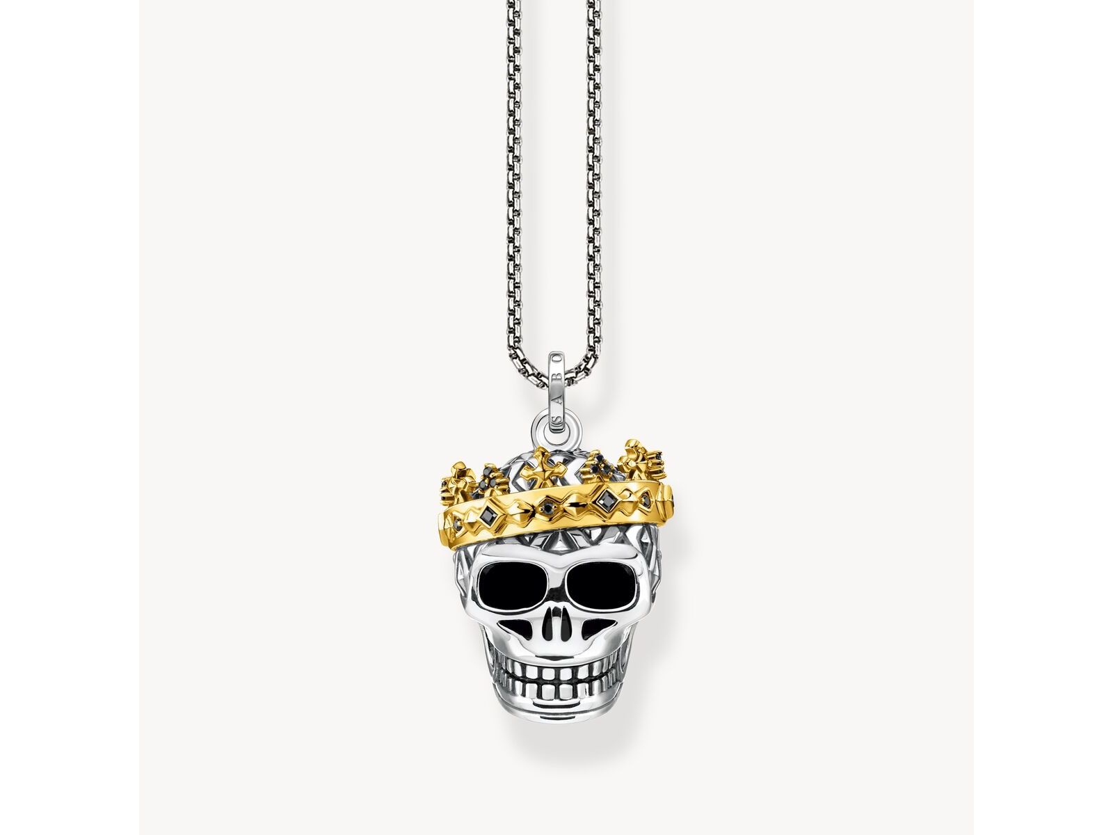 This blackened 925 sterling silver chain features a bold skull pendant, accented by an 18-carat yellow gold-plated crown adorned with shimmering black zirconia. A symbol of power and dignity, this iconic THOMAS SABO piece adds a graphic and sophisticated touch to your outfits. Perfect for elegantly expressing your unique style. Exclusively available online and in THOMAS SABO stores