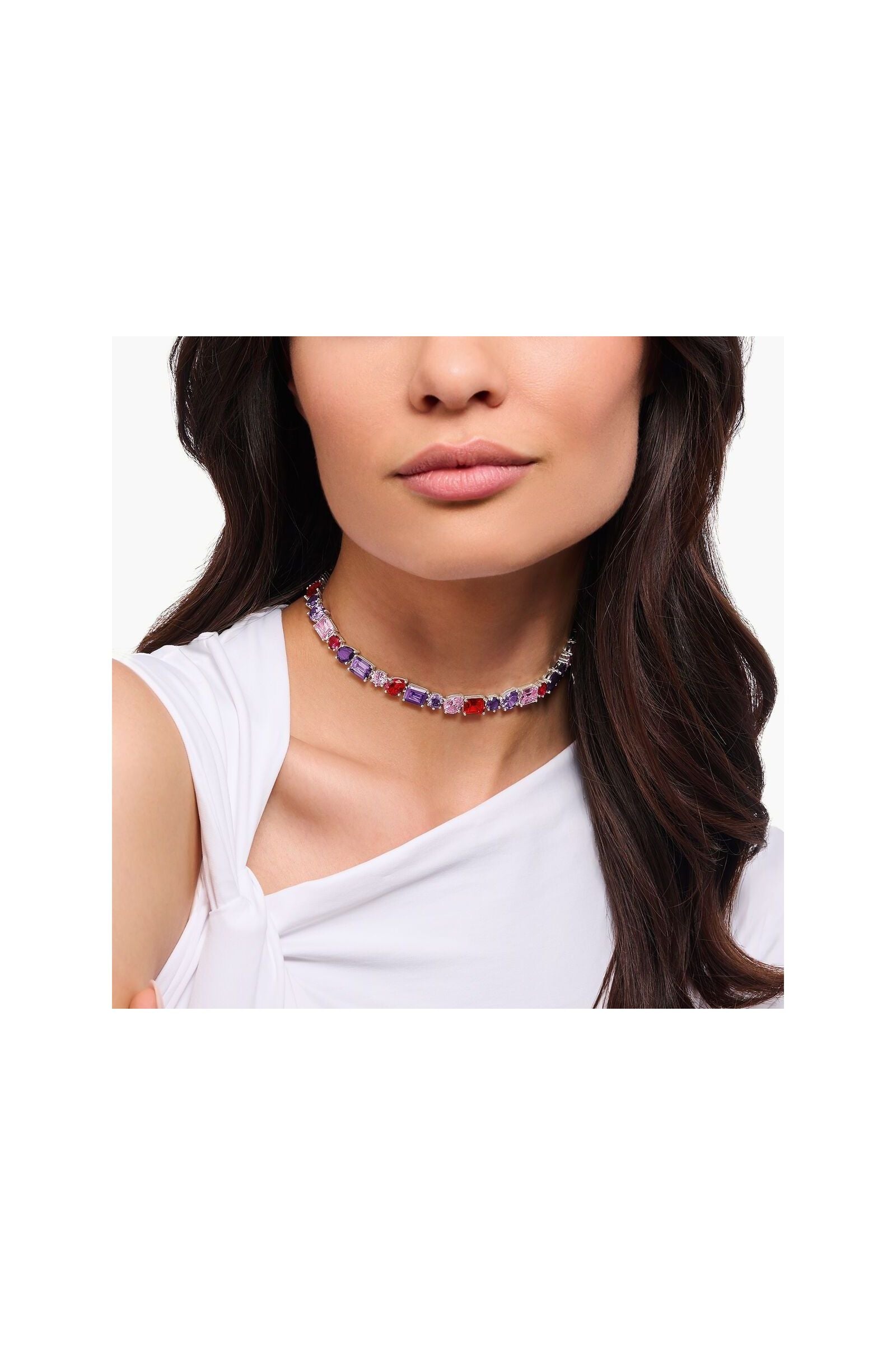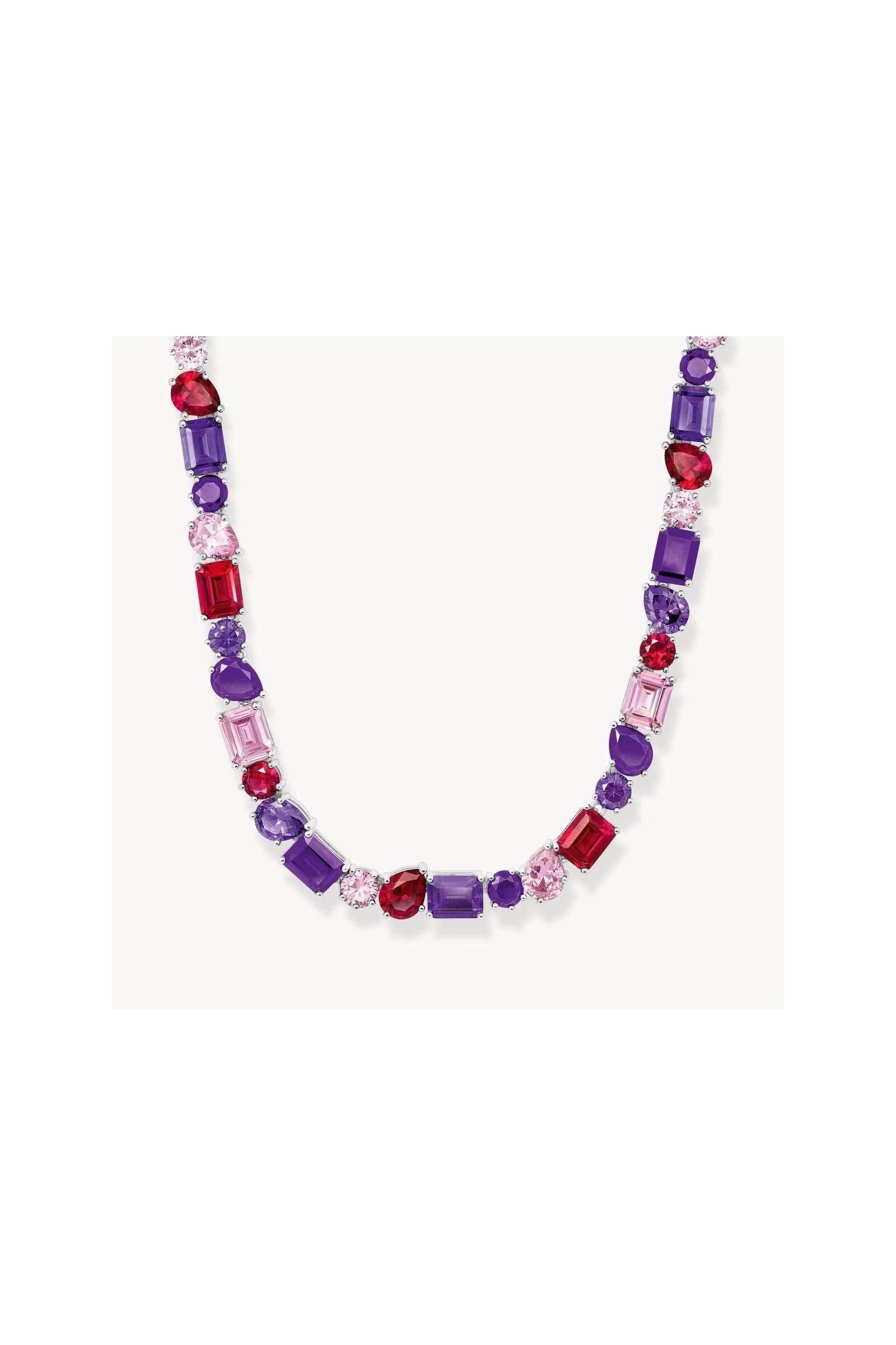 Découvrez l'élégance captivante de ce choker en argent sterling 925 recyclé, où 43 pierres multicolores – roses, rouges et violettes – dansent sous la lumière. Ses sertis à griffes ouverts révèlent chaque facette avec une brillance incomparable, tandis que les tailles variées (octogonale, ronde et goutte) créent une composition visuelle sophistiquée. Ajustable de 34 à 42 cm grâce à sa chaînette d'extension, ce bijou s'adapte à votre style, du port serré au plus fluide. Un pendentif orné complète l'ensemble. Parfait pour les occasions festives, il se marie magnifiquement avec une rivière et des boucles d'oreilles assorties pour une allure irrésistible.