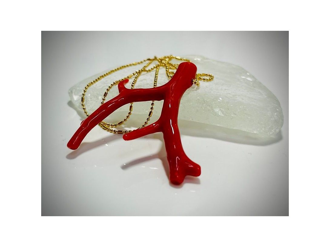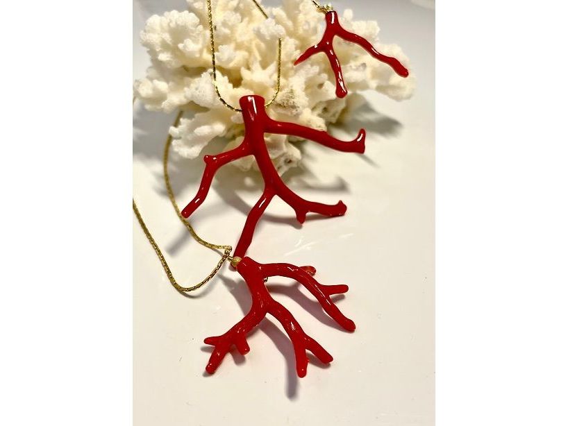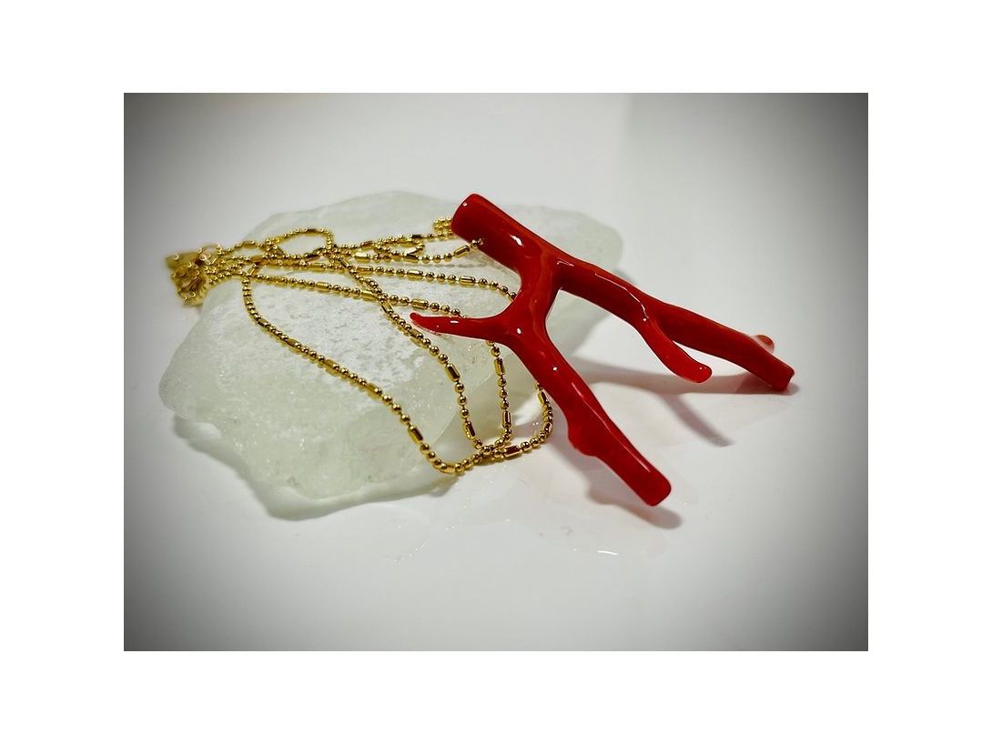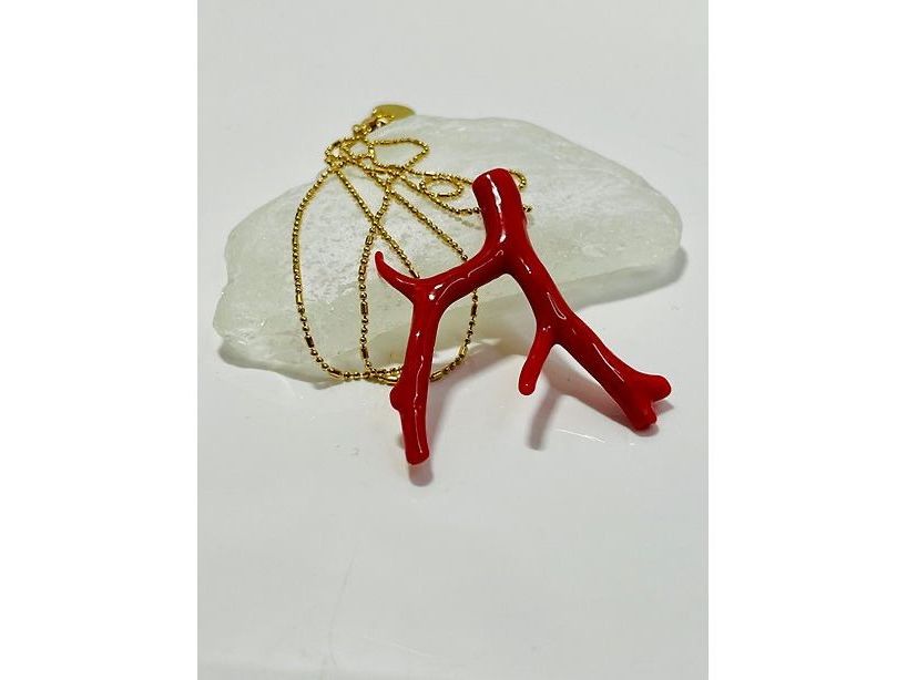 This Corsica 2 necklace showcases a medium branch of Mediterranean red coral, delicately mounted on a gold-plated cable with a 24-karat fine gold finish. Measuring approximately 4 cm by 3 cm, each unique branch reveals 2 to 3 natural ramifications. The 42 cm chain with a 5 cm extension ensures a perfect fit. Crafted near Paris by a professional gilder, this piece of jewelry showcases the mysterious world of precious and rare coral. Elegant on its own or stacked, it adds a noble and authentic touch to your style.