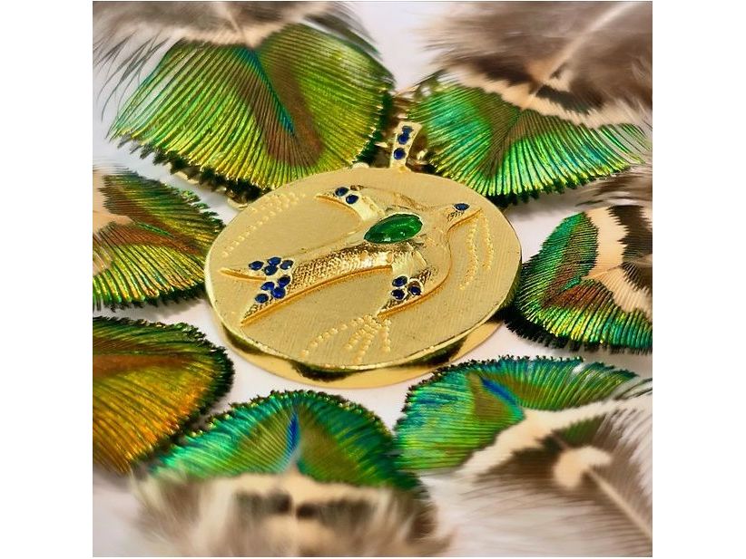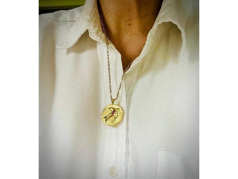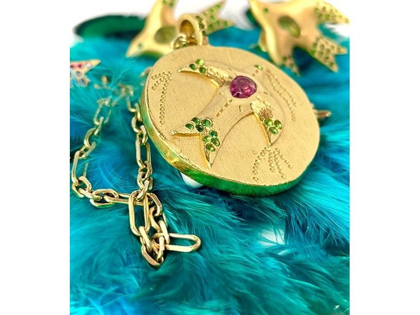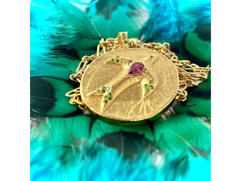 Discover the Acellu sautoir necklace, a refined tribute to Corsican nature. Each handcrafted piece showcases the graceful movement of birds with sparkling zirconia stones and a delicately engraved medallion in 18-carat fine gold. Available in several lengths, this sophisticated 2.6 cm diameter piece combines elegance and respect for the environment with its recycled gold and sustainable zirconia. An exceptional choice to enhance your style with authenticity and finesse.