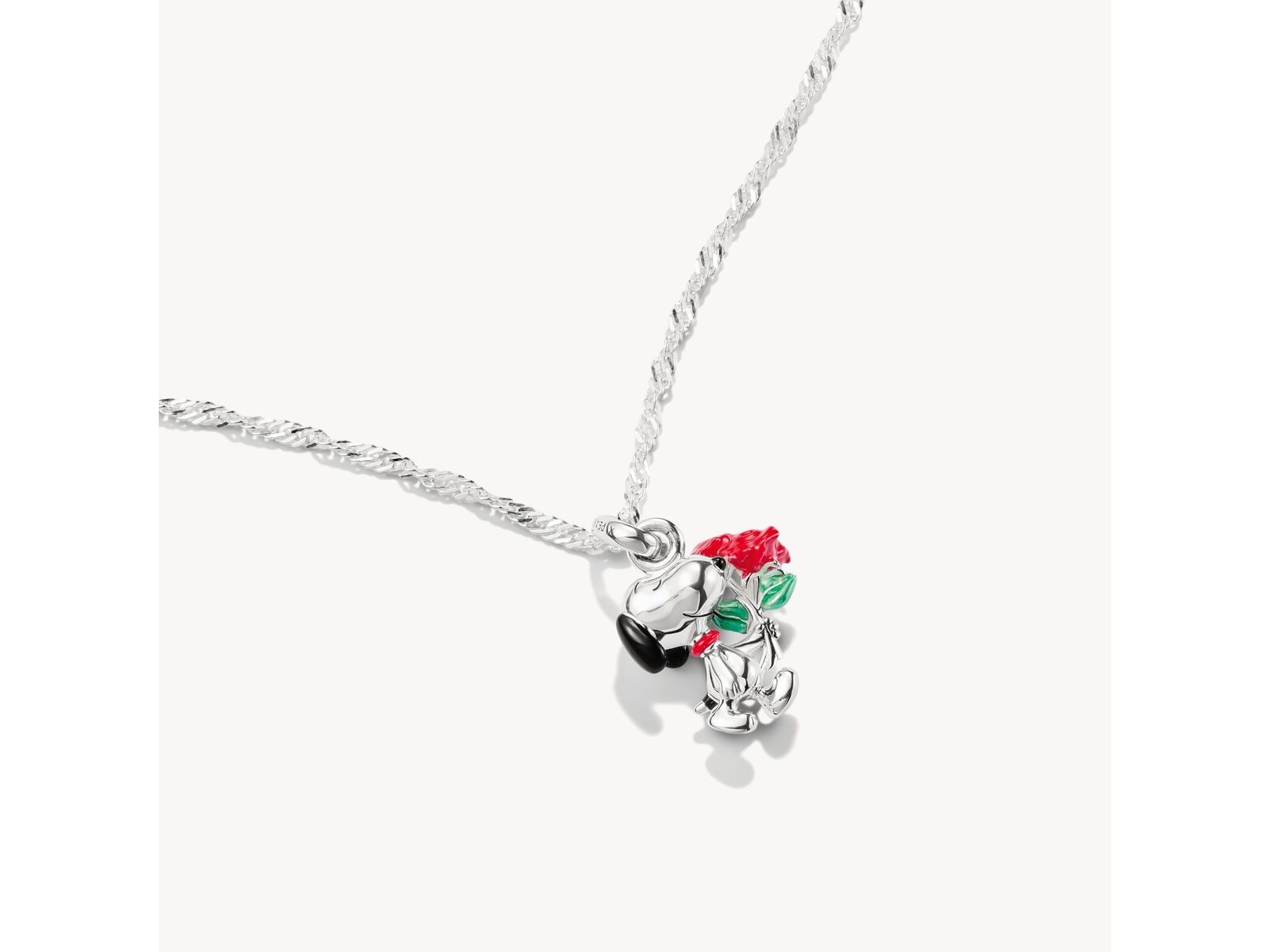 The Snoopy necklace pendant with roses, made of recycled 925 sterling silver with a blackened finish, reveals a delicate design enhanced with black, red, and green enamel. A symbol of love and friendship, this THOMAS SABO x Peanuts piece combines romance and finesse. Its fine chain allows it to be worn alone or layered, making this necklace a gift full of emotion and style.