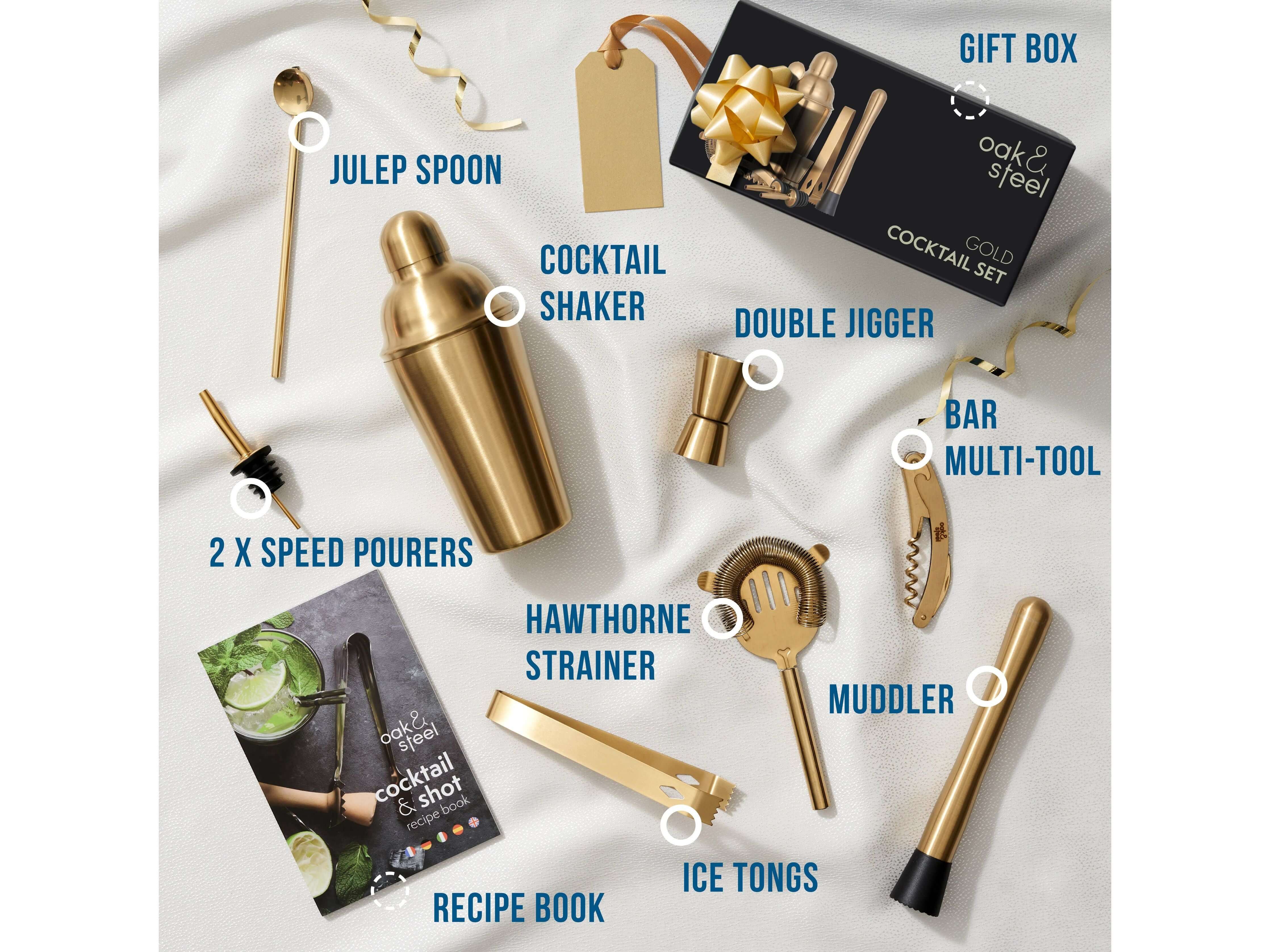 The set includes: a cocktail shaker, a Hawthorne strainer, a muddler, a multi-tool for the bar, a Julep spoon, a double jigger, 2 quick-release pourers, ice tongs, a recipe book, and a gift box.