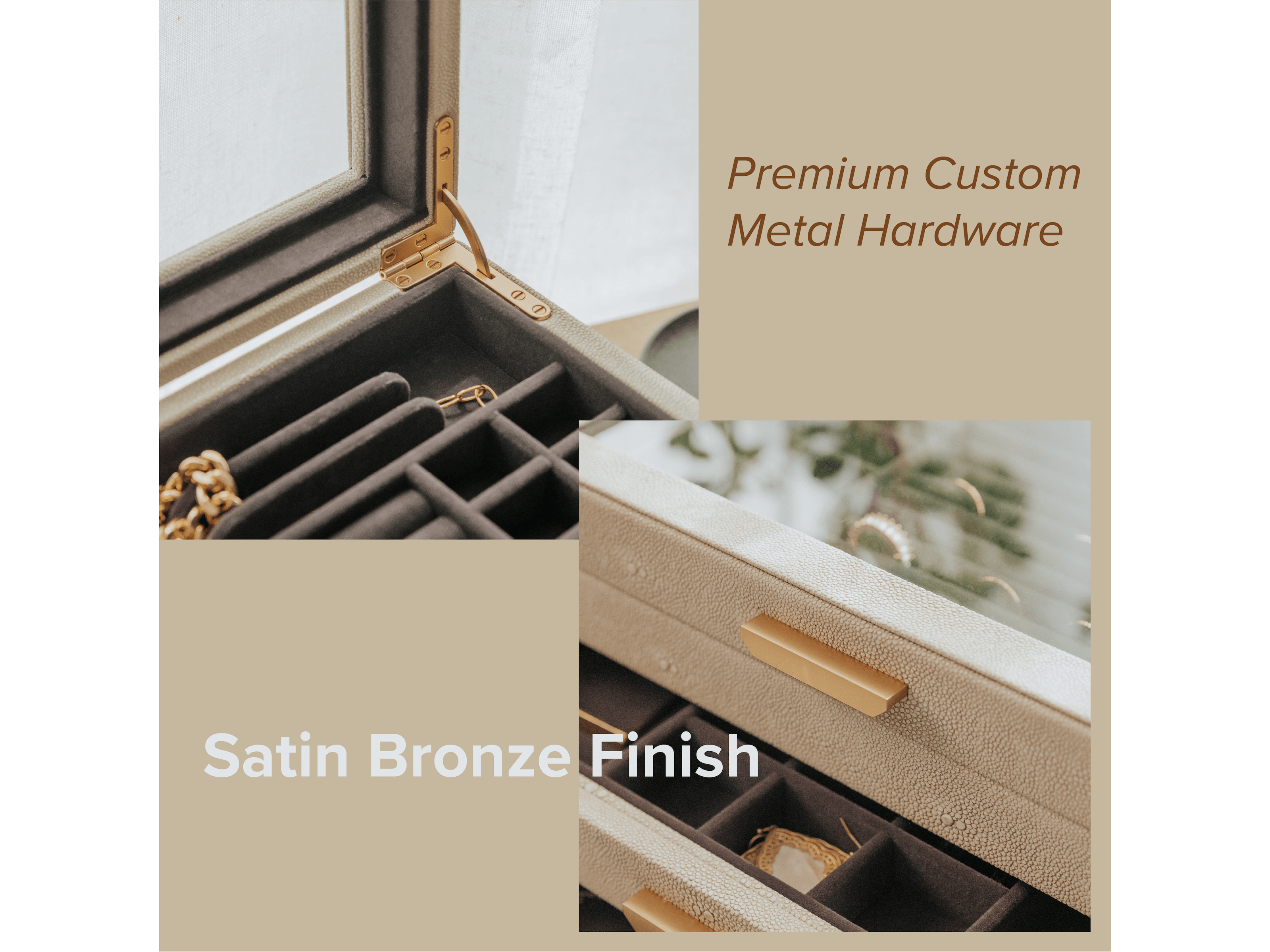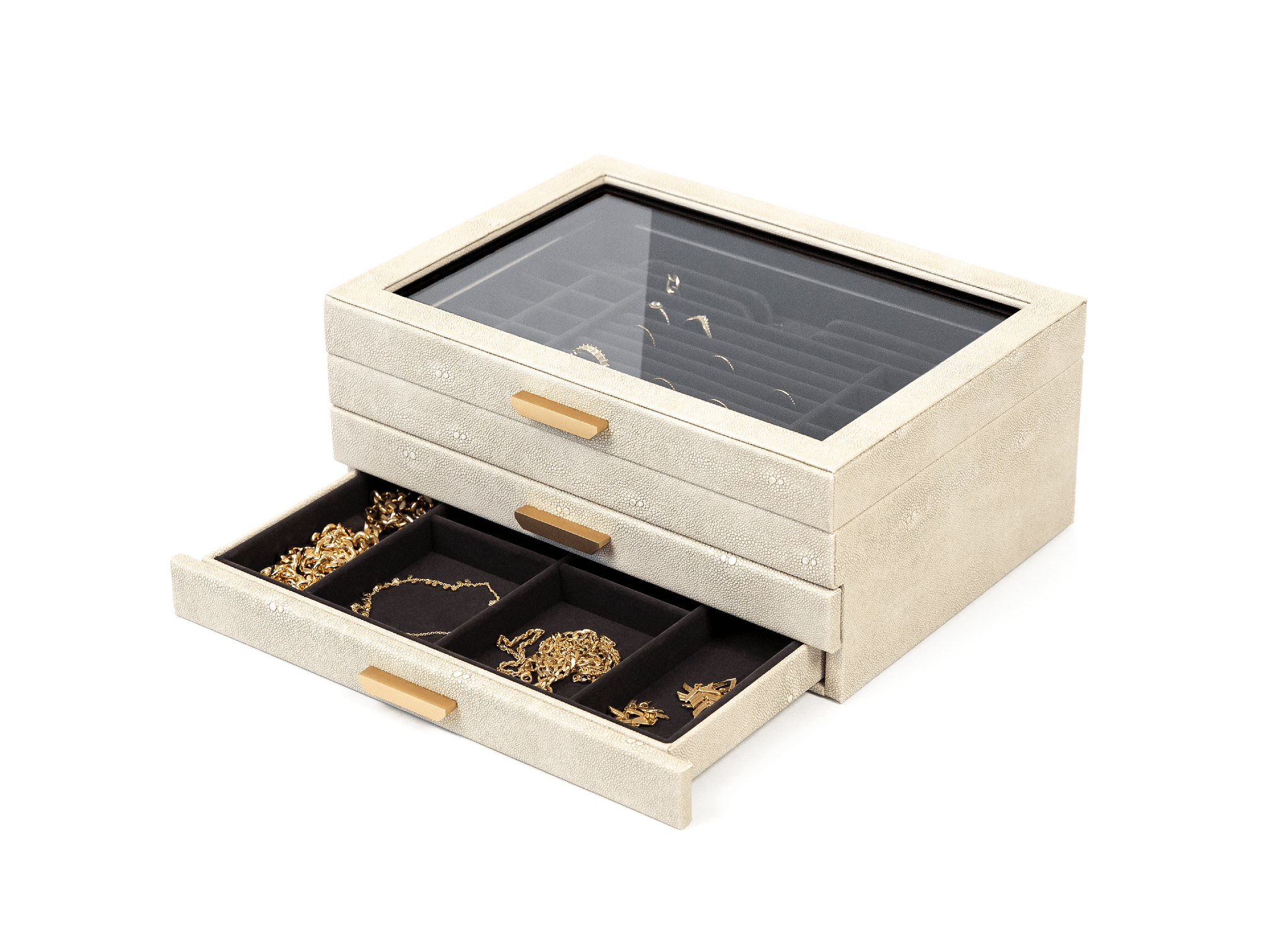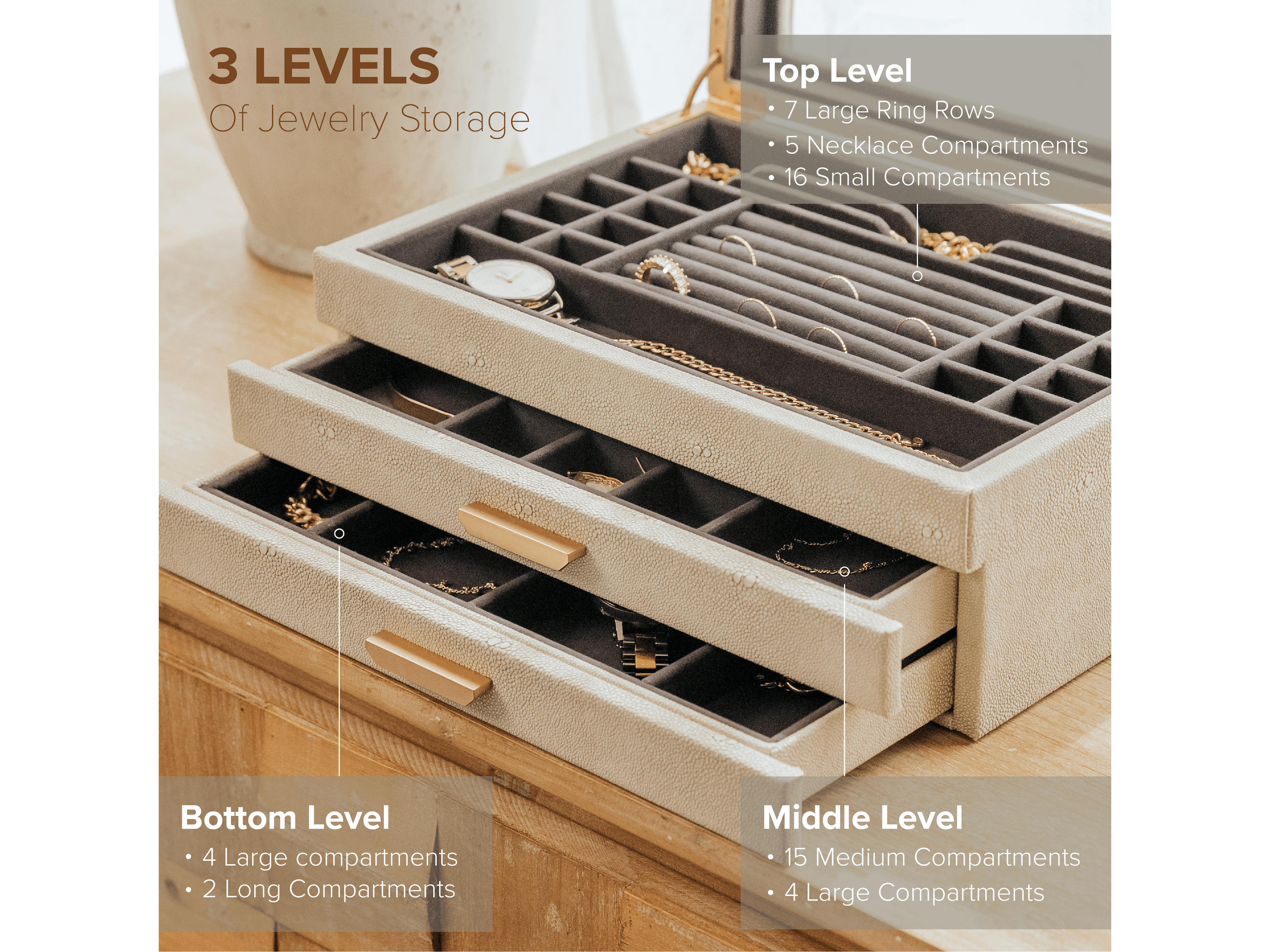 The Sasha jewelry box has a compartment for all your jewelry, so there's no need to pile it up for storage. The elegant exterior of this beautiful box is covered in a faux pebble texture, while the interior is lined with premium dark gray velvet plush and features custom-molded handles with a rich satin bronze finish, giving it a truly luxurious feel. The Sasha jewelry box holds an incredible amount of jewelry across three levels, each carefully designed to accommodate all sizes and styles. The different levels include 16 small, 15 medium, and 10 large compartments, 7 rows for rings, and 5 slots for necklaces. The unique slots on the top level provide a unique way to organize your necklaces so they won't get tangled.