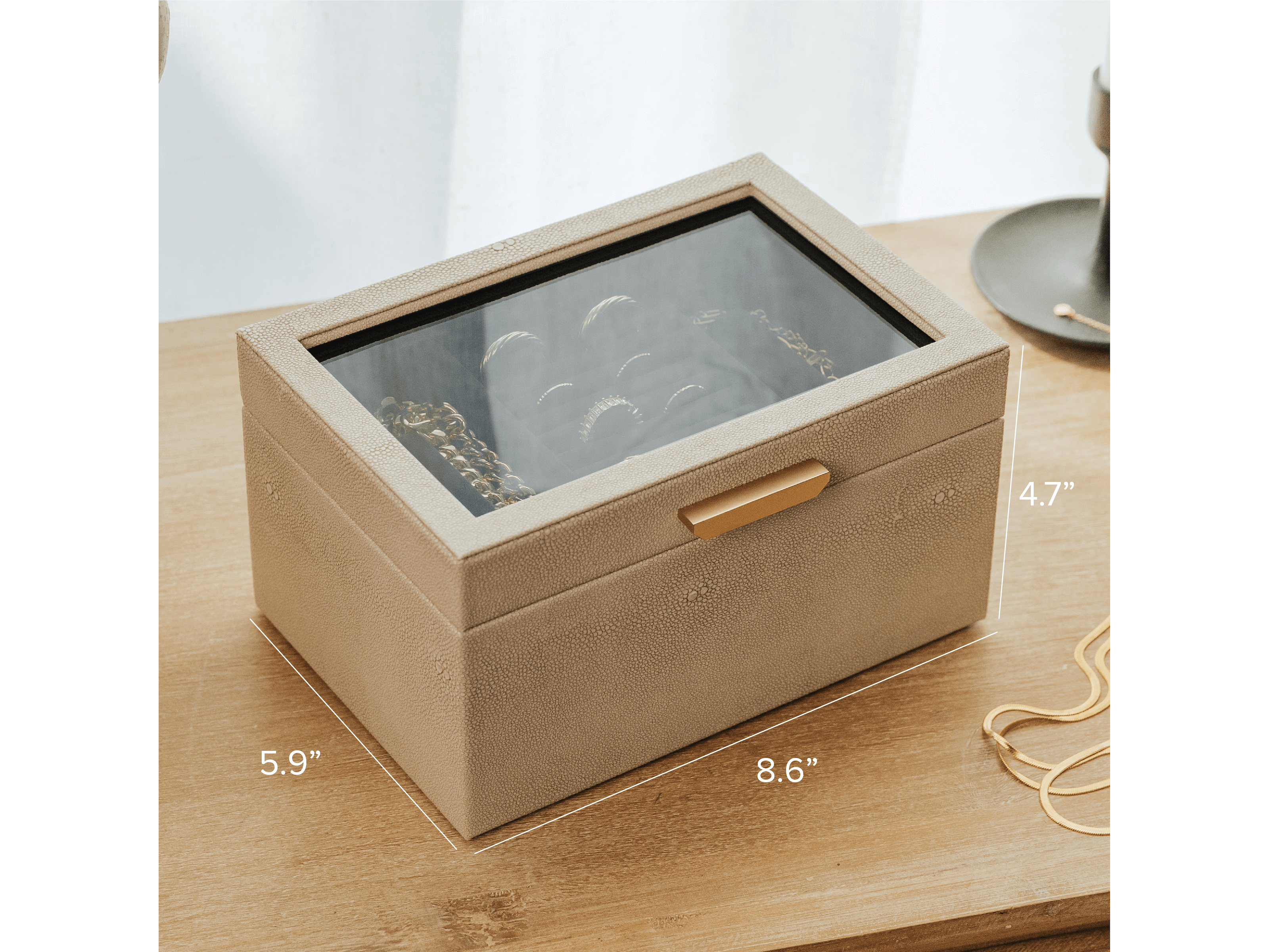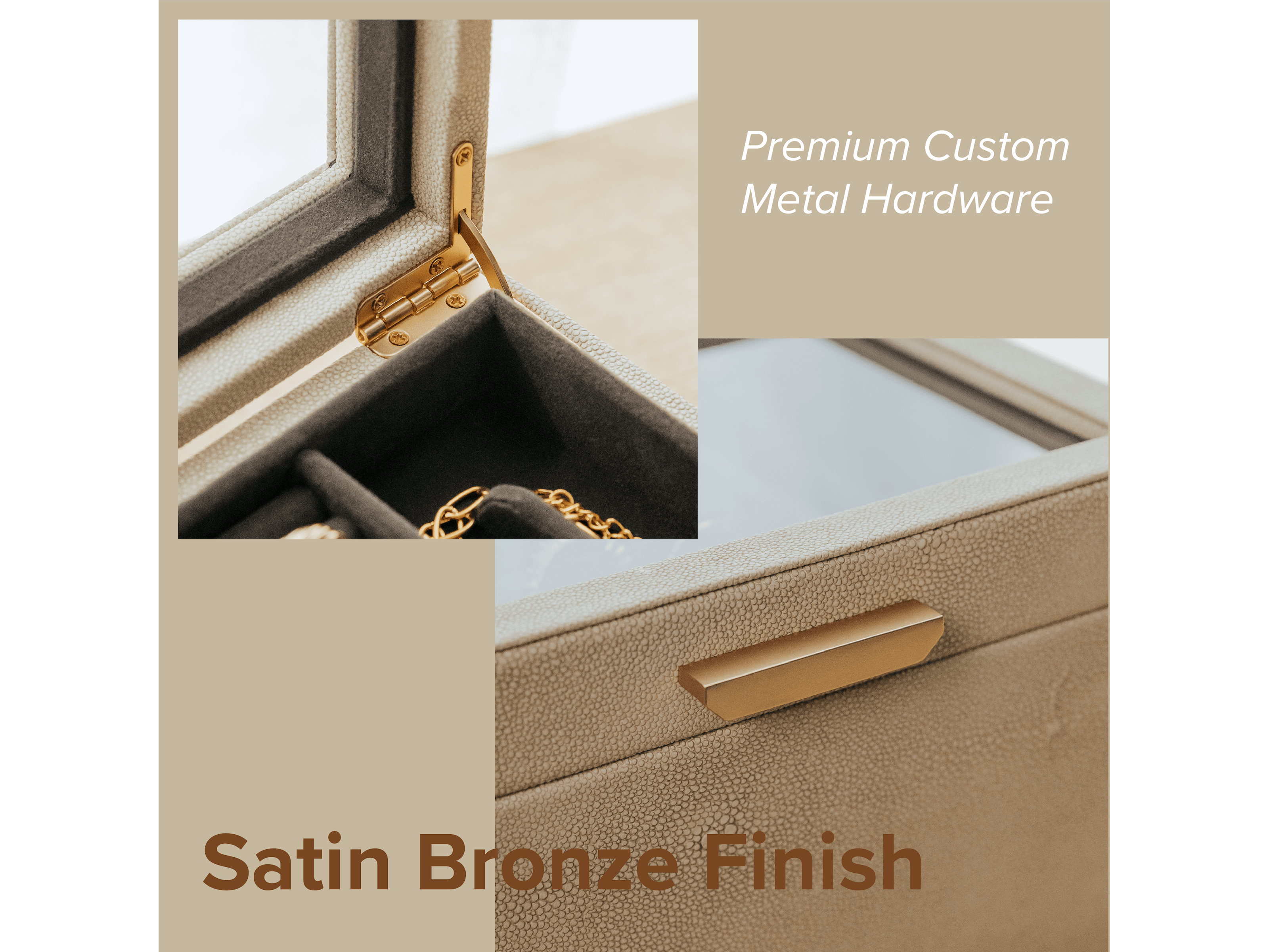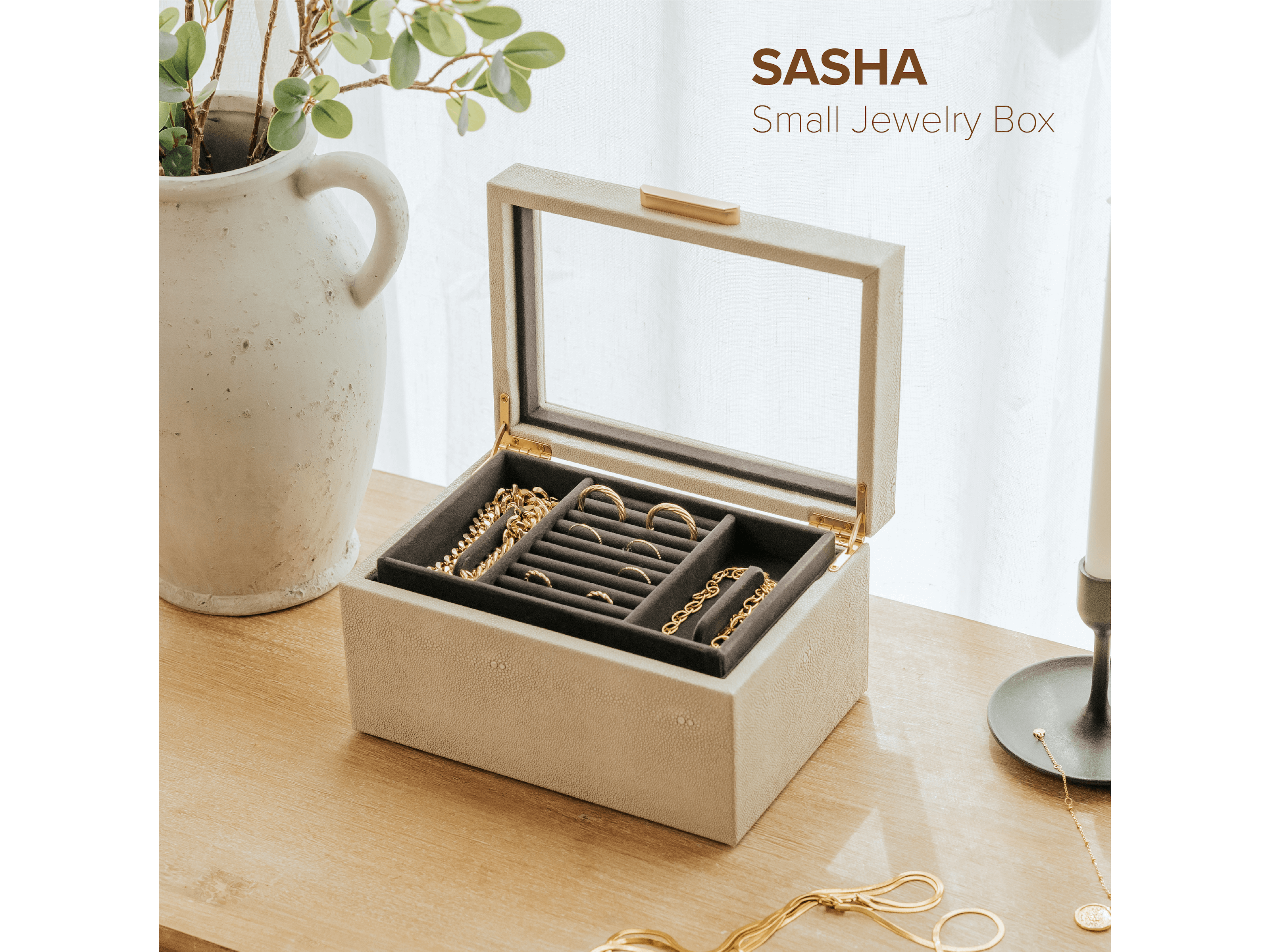 The small Sasha jewelry box is the perfect size for those with a modest amount of jewelry and limited space. The elegant exterior of this beautiful box is covered in a vegan pebble texture, while the interior is lined with premium dark gray velvet plush and features custom-molded handles with a rich satin bronze finish, giving it a truly luxurious feel. Despite its small size, this storage box can hold a surprising amount of jewelry across three levels. Each level has been carefully designed to accommodate all sizes and styles of jewelry. The unique slots on the top level offer a unique way to organize your necklaces so they don't get tangled.