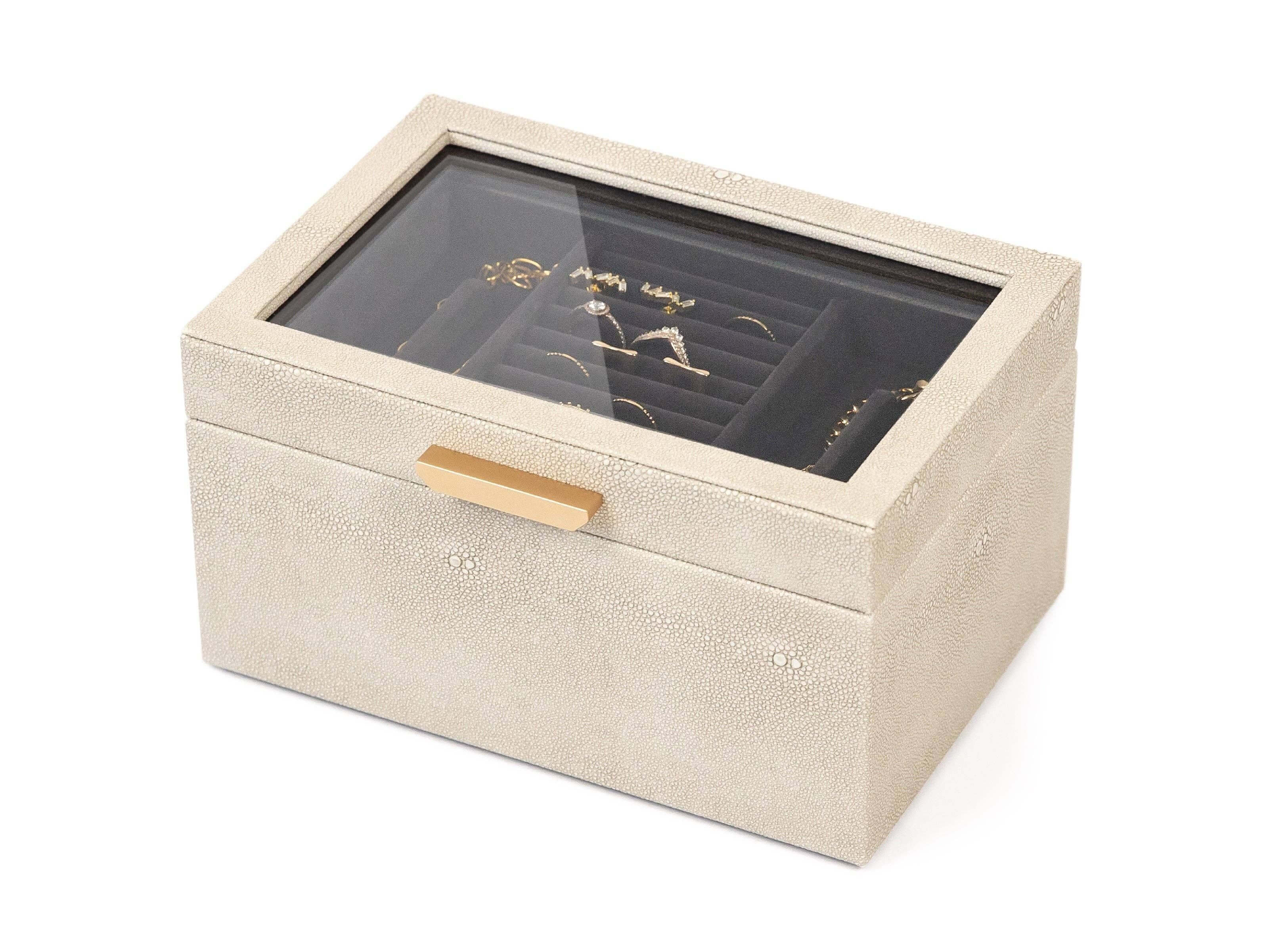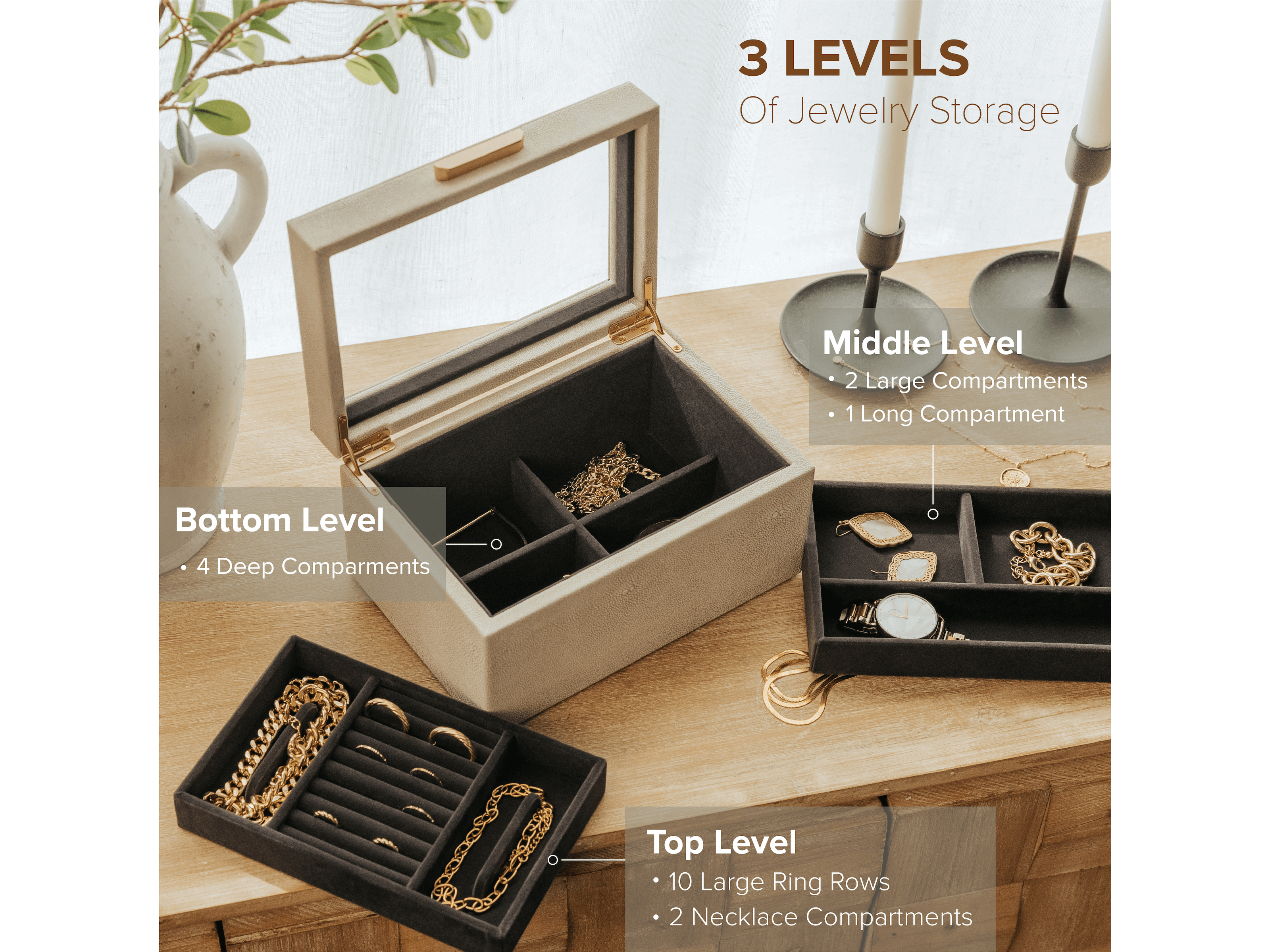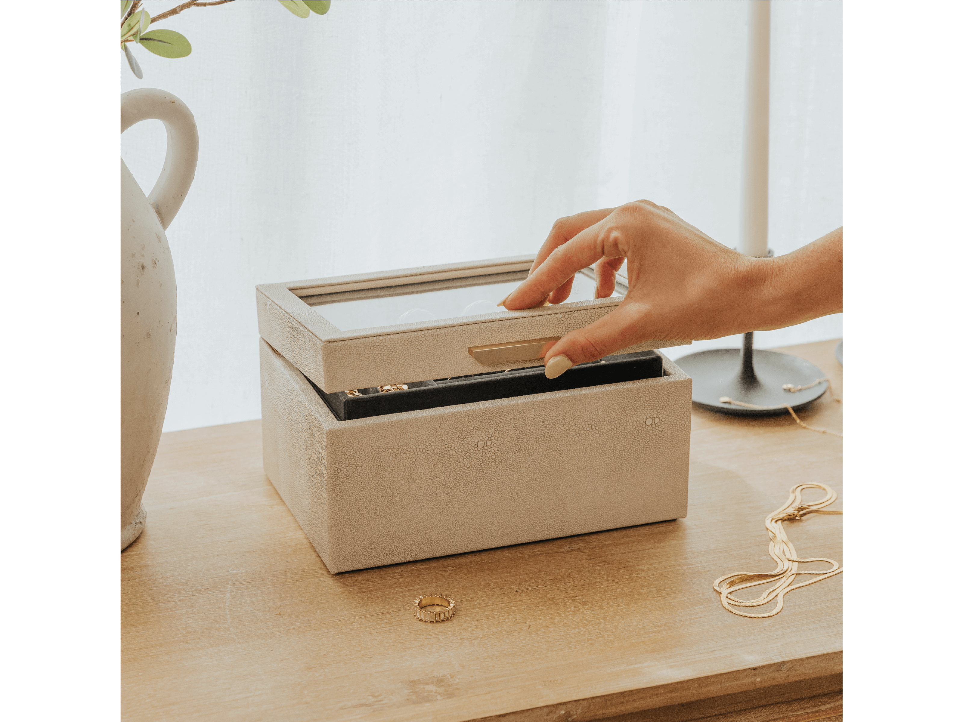The small Sasha jewelry box is the perfect size for those with a modest amount of jewelry and limited space. The elegant exterior of this beautiful box is covered in a vegan pebble texture, while the interior is lined with premium dark gray velvet plush and features custom-molded handles with a rich satin bronze finish, giving it a truly luxurious feel. Despite its small size, this storage box can hold a surprising amount of jewelry across three levels. Each level has been carefully designed to accommodate all sizes and styles of jewelry. The unique slots on the top level offer a unique way to organize your necklaces so they don't get tangled.