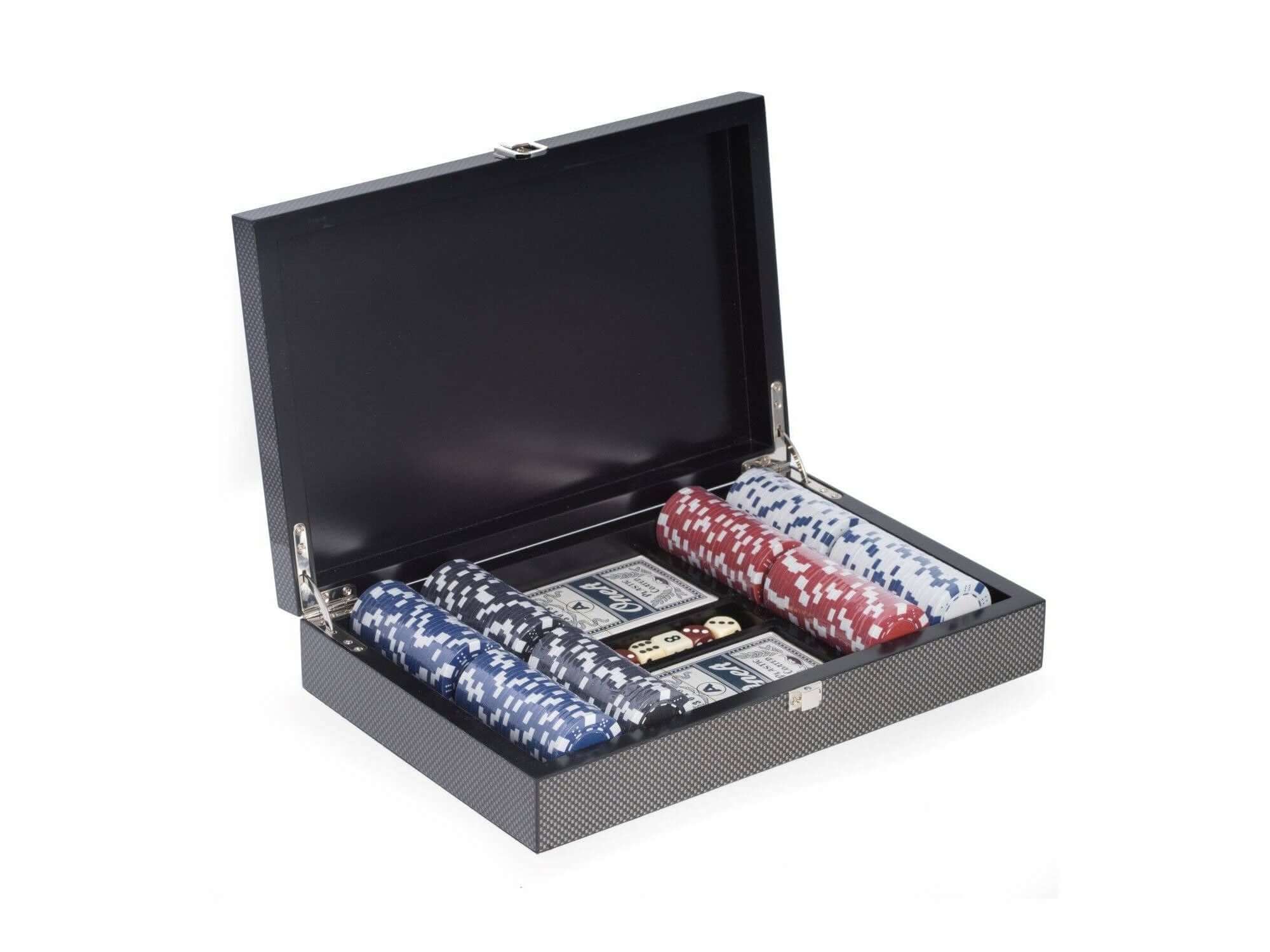 Poker set with 200 11.5-gram clay composite chips, two decks of playing cards, and 5 poker dice in a carbon fiber storage case with chrome hardware. Dimensions: 8" x 12.25" x 2.5" Weight: 8.05 lbs Color: Black and gray. Model # G556