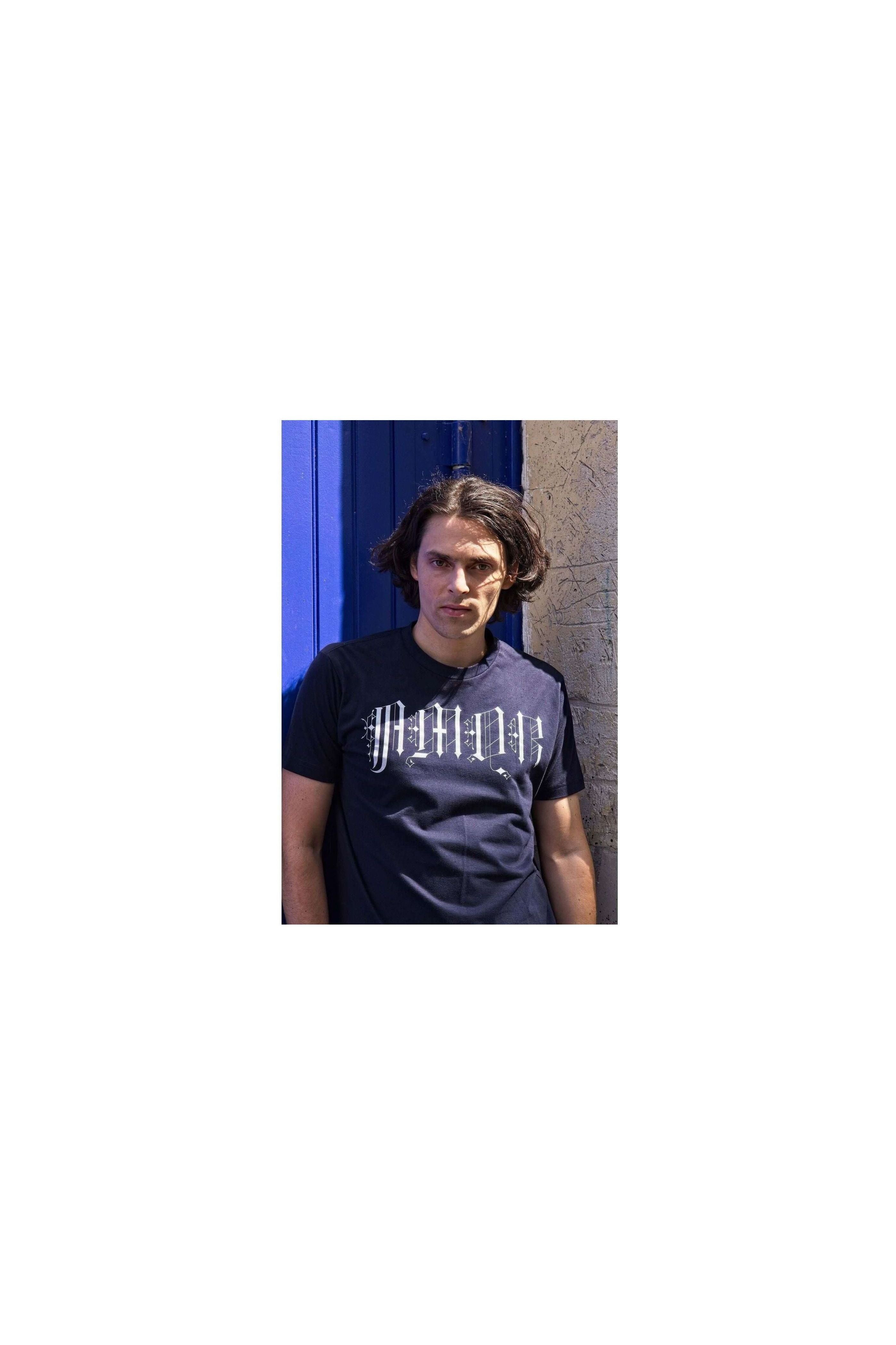 NAVY BLUE COTTON T-SHIRT WITH GOTHIC LETTERING PRINT