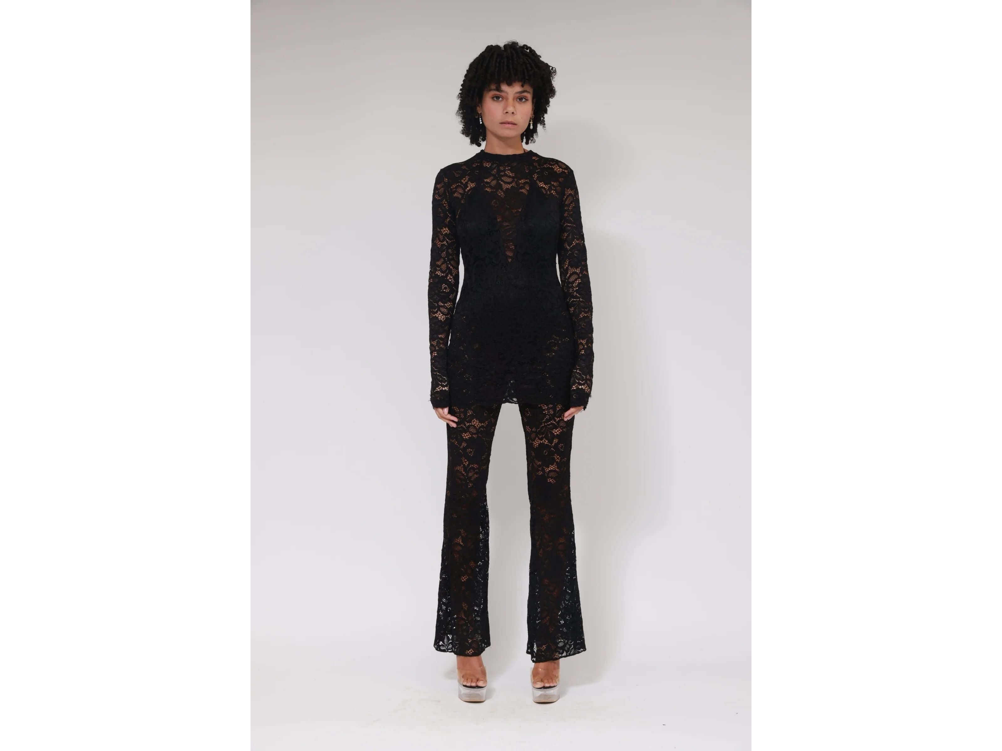 This long-sleeved lace T-shirt combines refinement and comfort. Its fine texture and delicate details highlight your natural elegance, perfect for adding a sophisticated touch to any outfit, from everyday wear to special occasions.