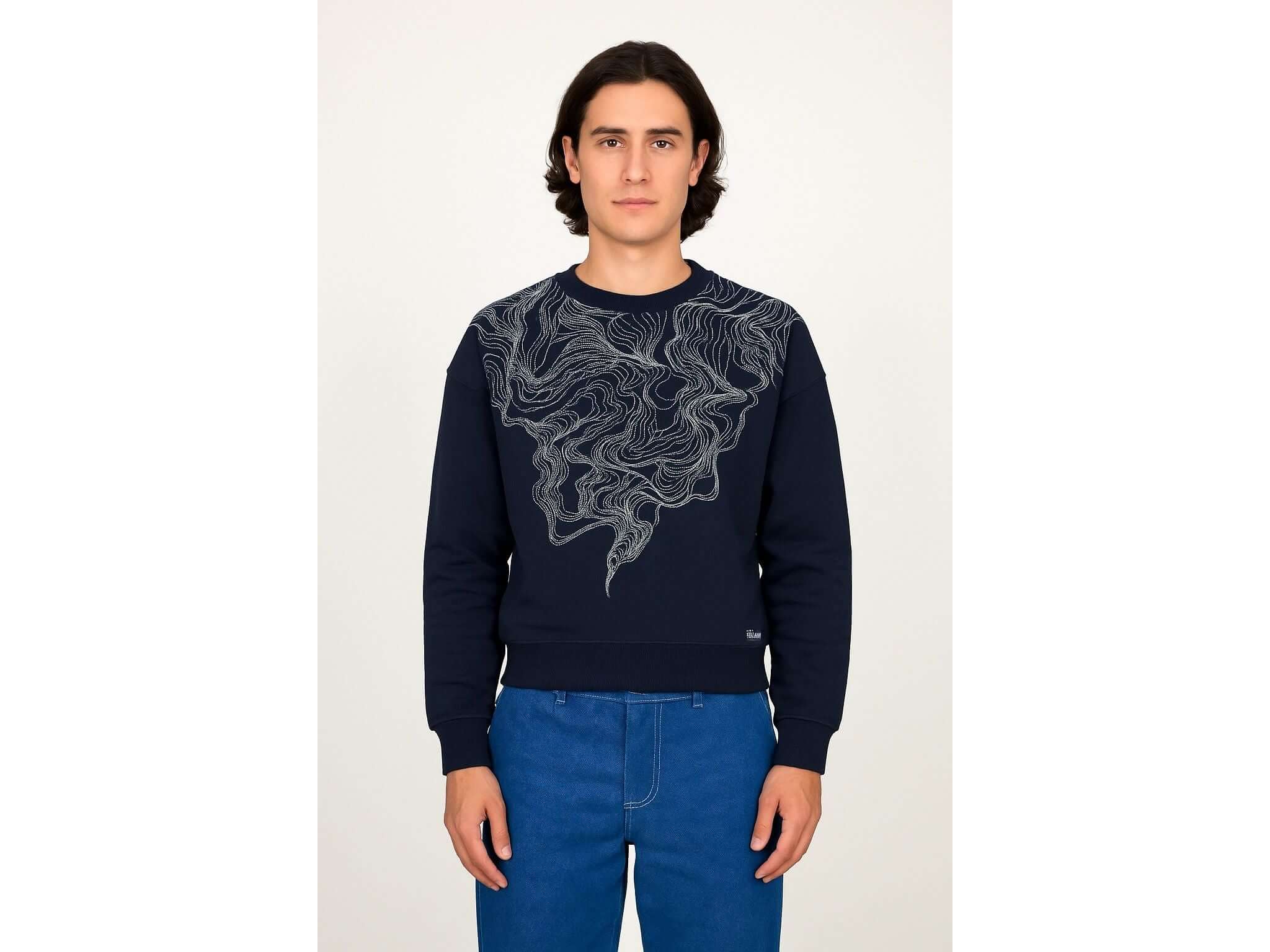 Discover this navy blue sweatshirt where poetry meets design. A delicate, precisely crafted smoky embroidery dances across the fabric in evanescent swirls that play with the light. This fluid, ethereal motif captures the essence of a suspended moment, transforming every wear into a subtle and modern style statement. The relaxed fit and generous sleeves offer comfort and freedom of movement, while the crew neck completes this timeless silhouette. A garment that elevates the fabric with a poetic lightness, perfect for those who seek authenticity in every detail.