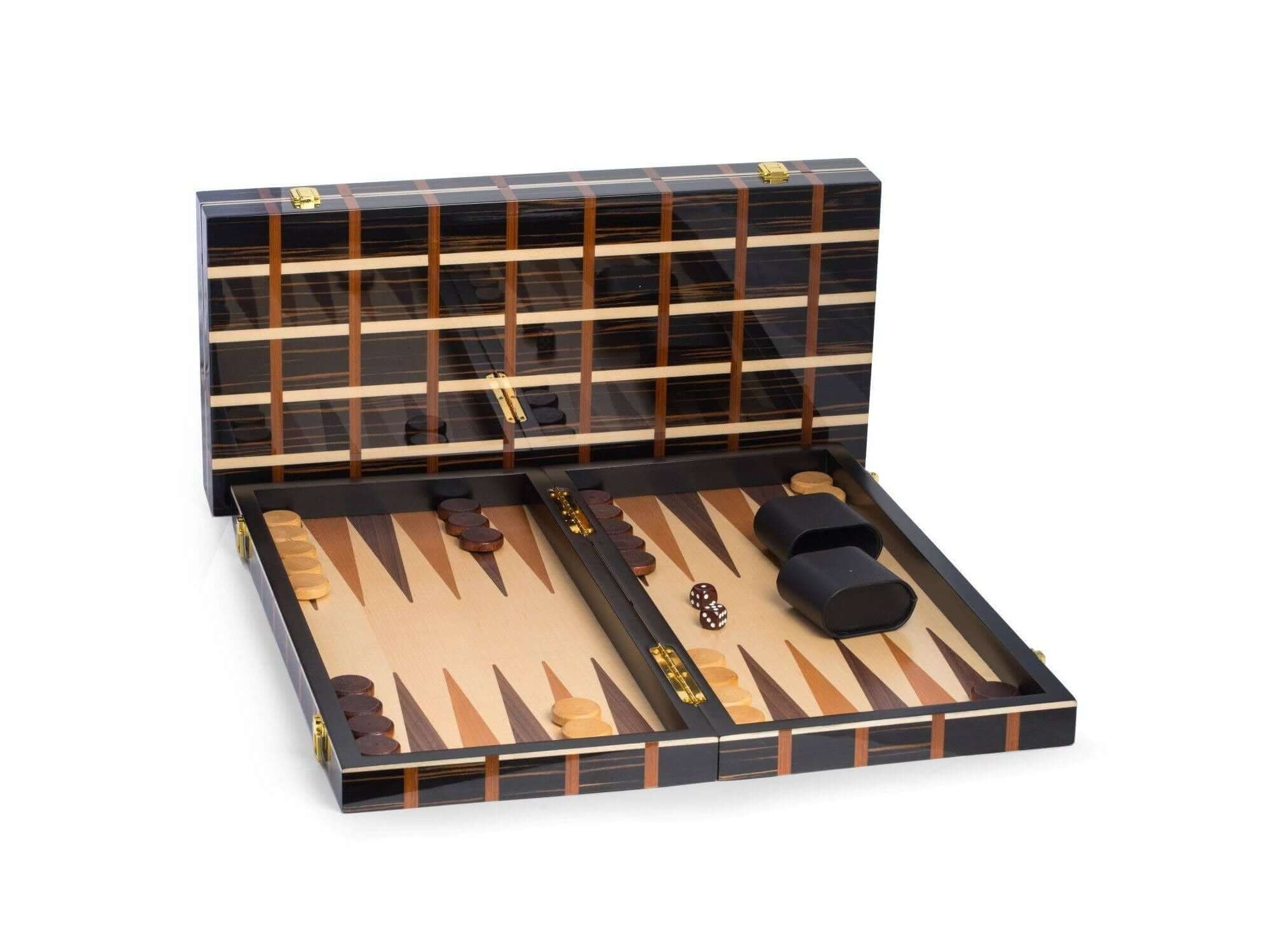 21" Art Deco Design Backgammon Set with Multi-Colored Wood Inlay and Brass Hardware. Dimension: 21" x 9.75" x 2.5". Weight: 5.7 lbs. Color: Black, Brown, and Tan. Model # G557L