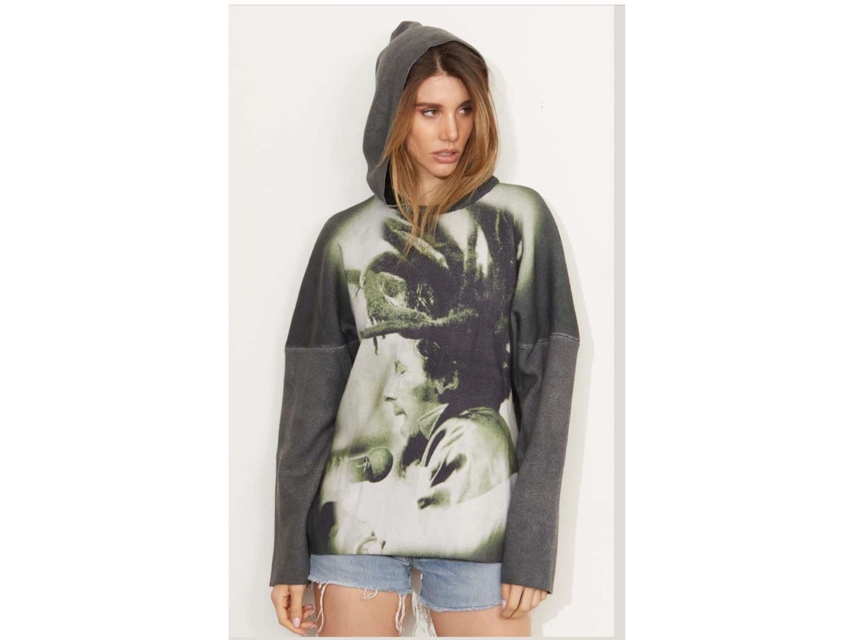 This reversible 100% cashmere hoodie combines softness and versatility. Its unique design featuring a rocker photo ensures style and comfort every day.