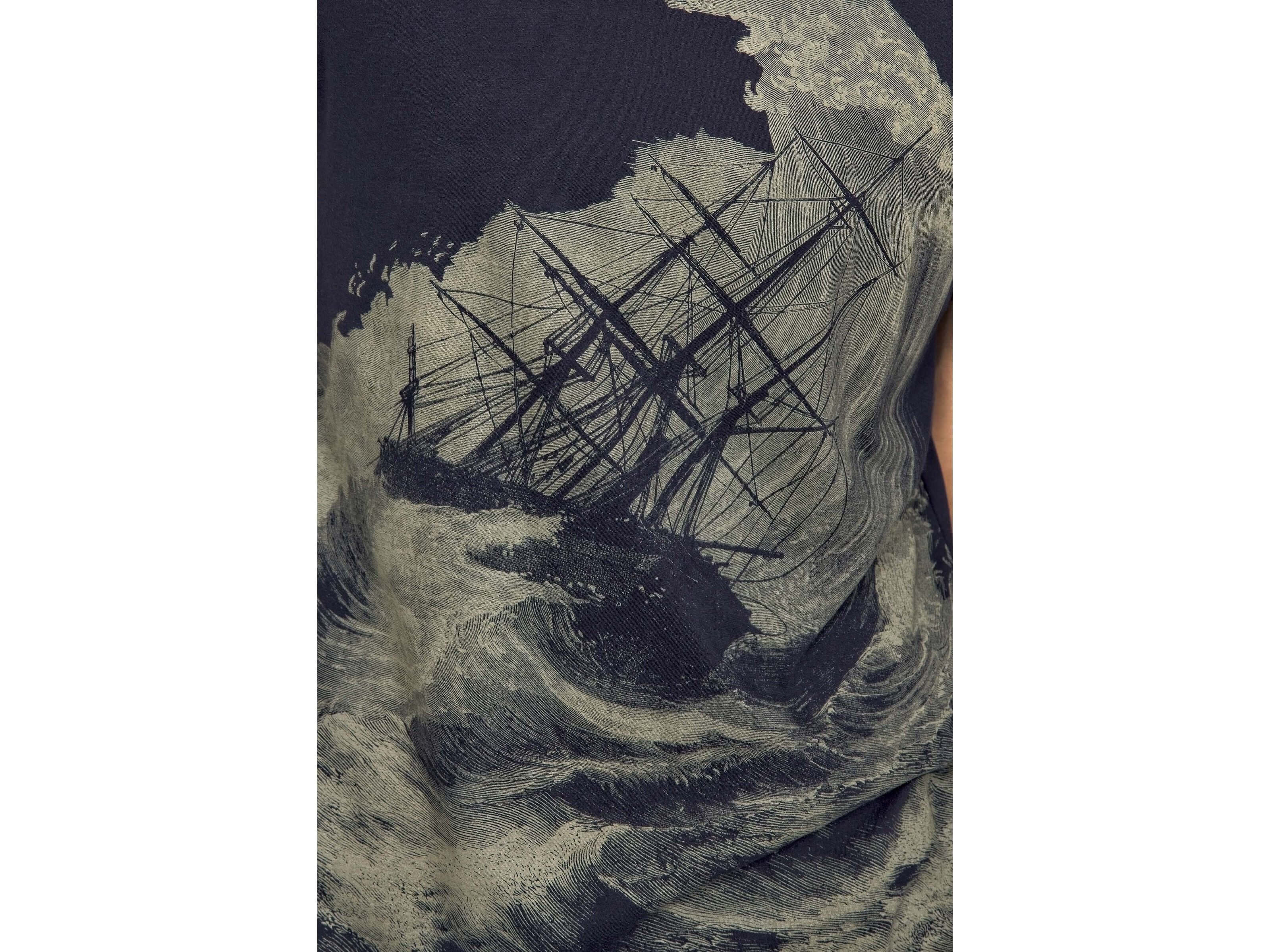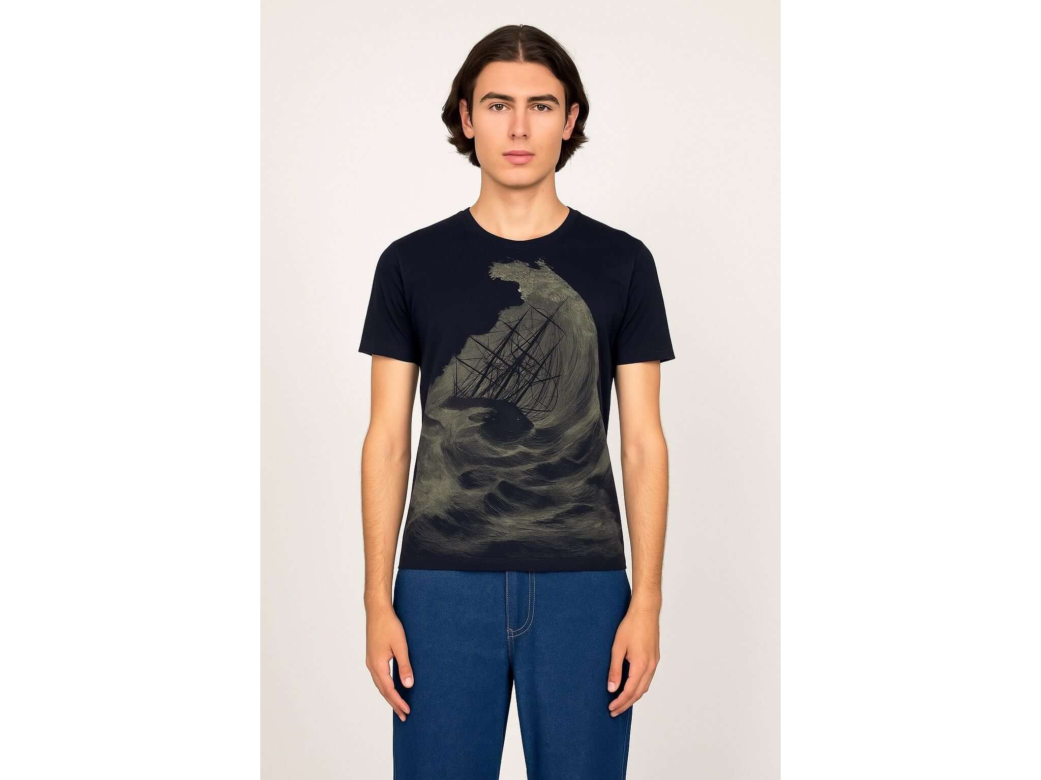 Querido Rescate Navy Blue T-Shirt. Discover this slim-fit cotton t-shirt, adorned with a captivating graphic that celebrates adventure and resilience. Inspired by the raw forces of nature, the design evokes a transformative journey where each wave represents life's challenges. The Misericiordia brand merges art and fashion, creating pieces that transcend mere clothing to become symbols of inspiration. Wear a creation that tells a story of courage and determination, while enjoying the comfort and quality of premium cotton. A must-have for those looking to express their adventurous spirit every day. ► The model is wearing size M and is 193cm tall