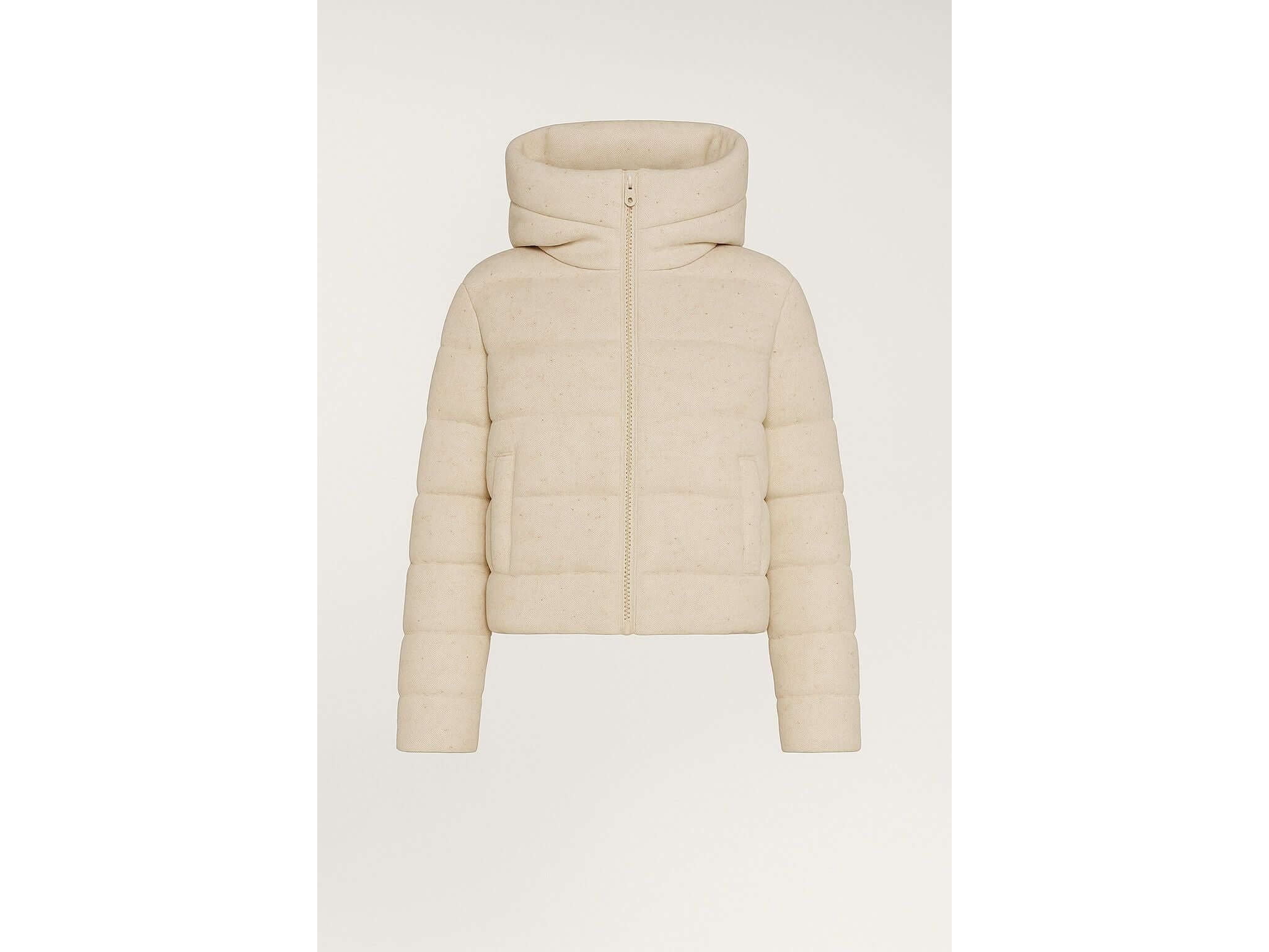 Discover the MUNROE BOUCLE Down Jacket, a masterpiece of sophistication and comfort. Crafted from herringbone twill wool, it is enhanced with acrylic, polyester, and silk threads that offer an ultra-soft texture and a luxurious feel. Certified natural down guarantees unparalleled warmth combined with remarkable lightness. With its integrated hood, black double-slider zipper, and side pockets, this piece perfectly embodies the balance between innovation and tradition of the Peuterey Première line. Short and timeless, it combines a raw yet refined feminine charm that transforms every silhouette.