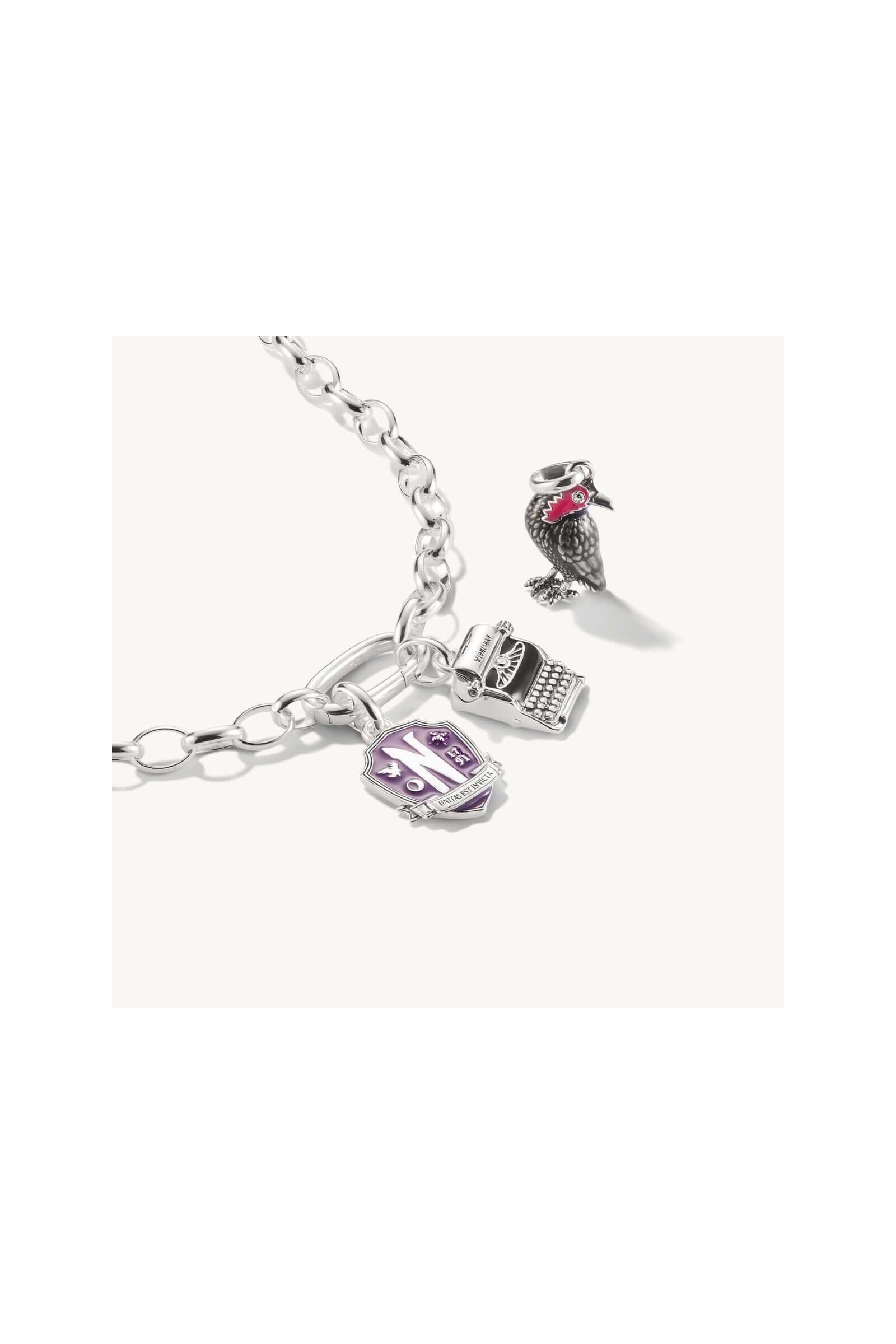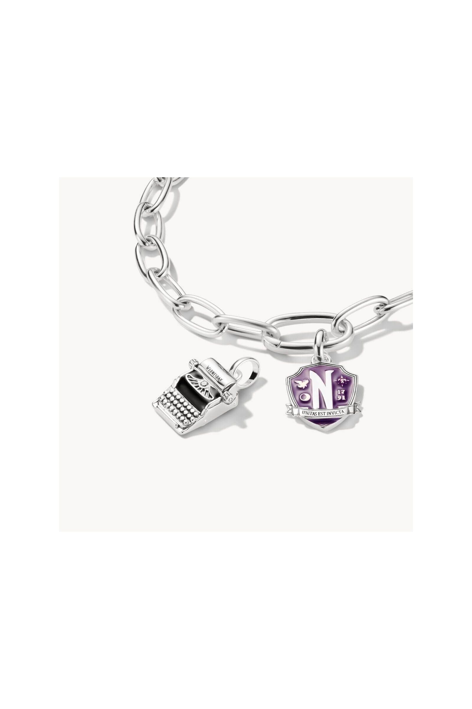 This blackened sterling silver Typewriter Charm Pendant, adorned with black enamel and a sparkling white cubic zirconia, embodies Wednesday's determination and sharp wit. Compatible with Connect Link and Charm Club jewelry, it expresses a unique passion for writing and self-expression.