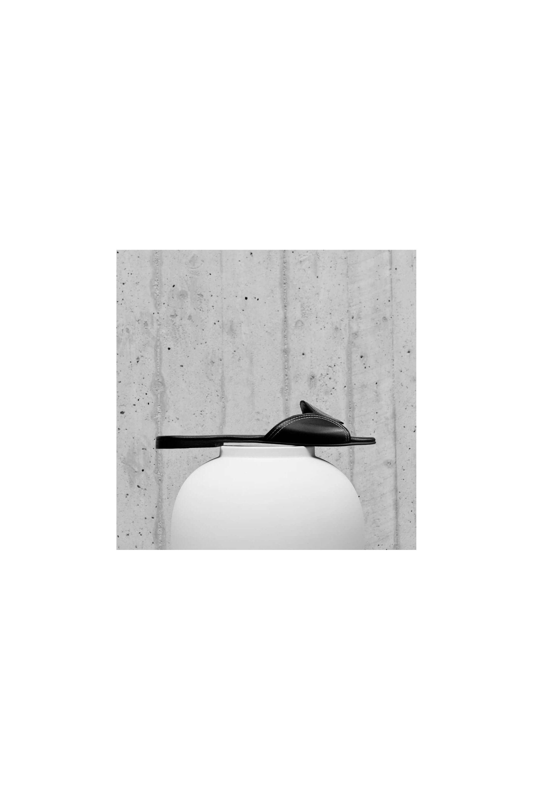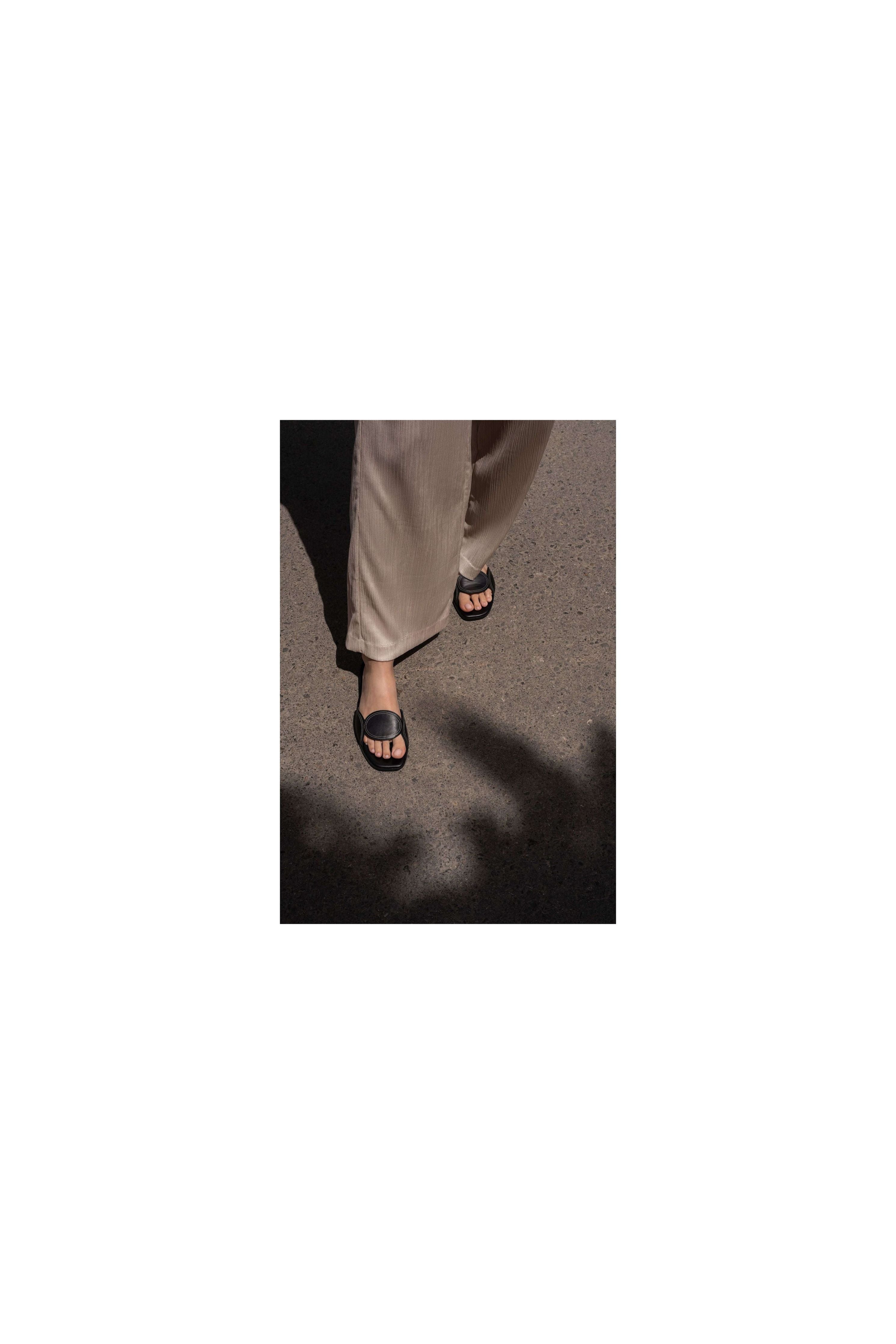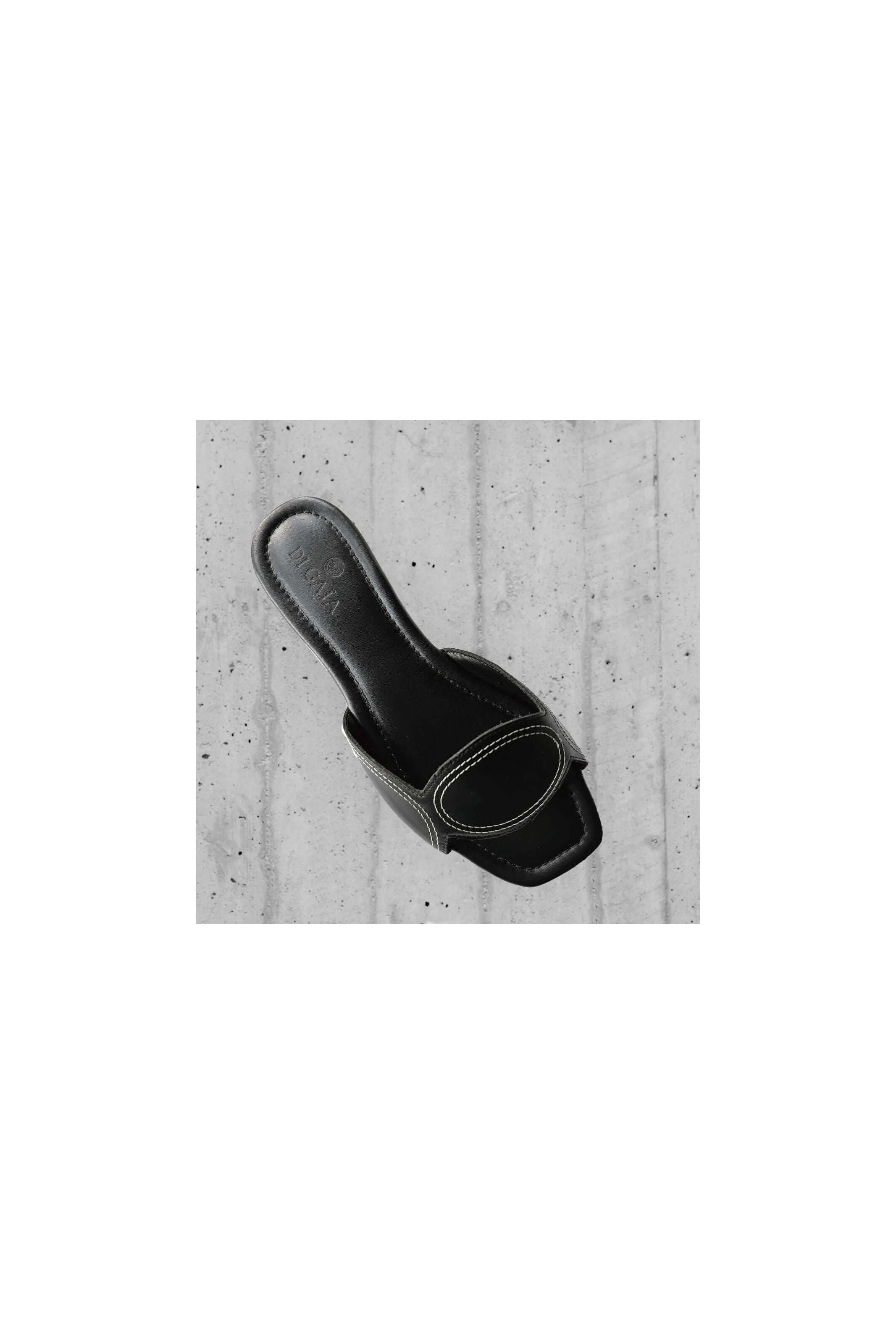 Dress up your feet in sleek style with Lucia slip-on sandals in smooth calf leather featuring elegant off-white double-stitching embroidery.