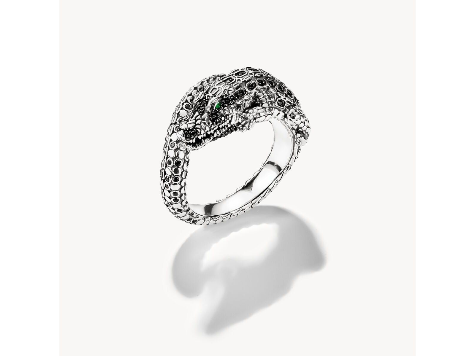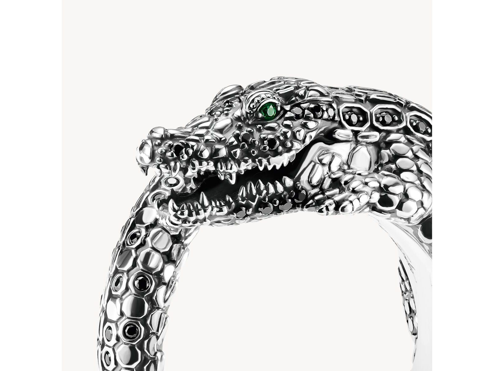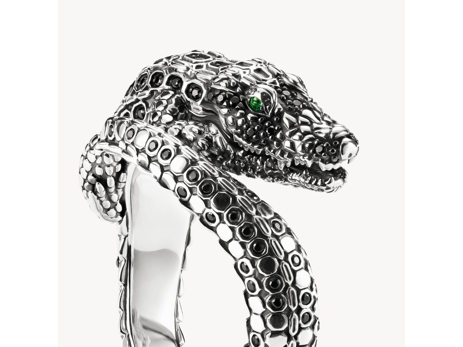 This blackened 925 sterling silver ring depicts a slithering crocodile in 3D, intricately engraved to reveal every detail of its scales and striking features. Hand-set with black zirconia and emerald green gemstones for its eyes, it combines boldness and elegance. Its delicately rounded band ensures optimal comfort for everyday wear. A unique piece of jewelry, perfect for enhancing your style with a wild and refined touch.
