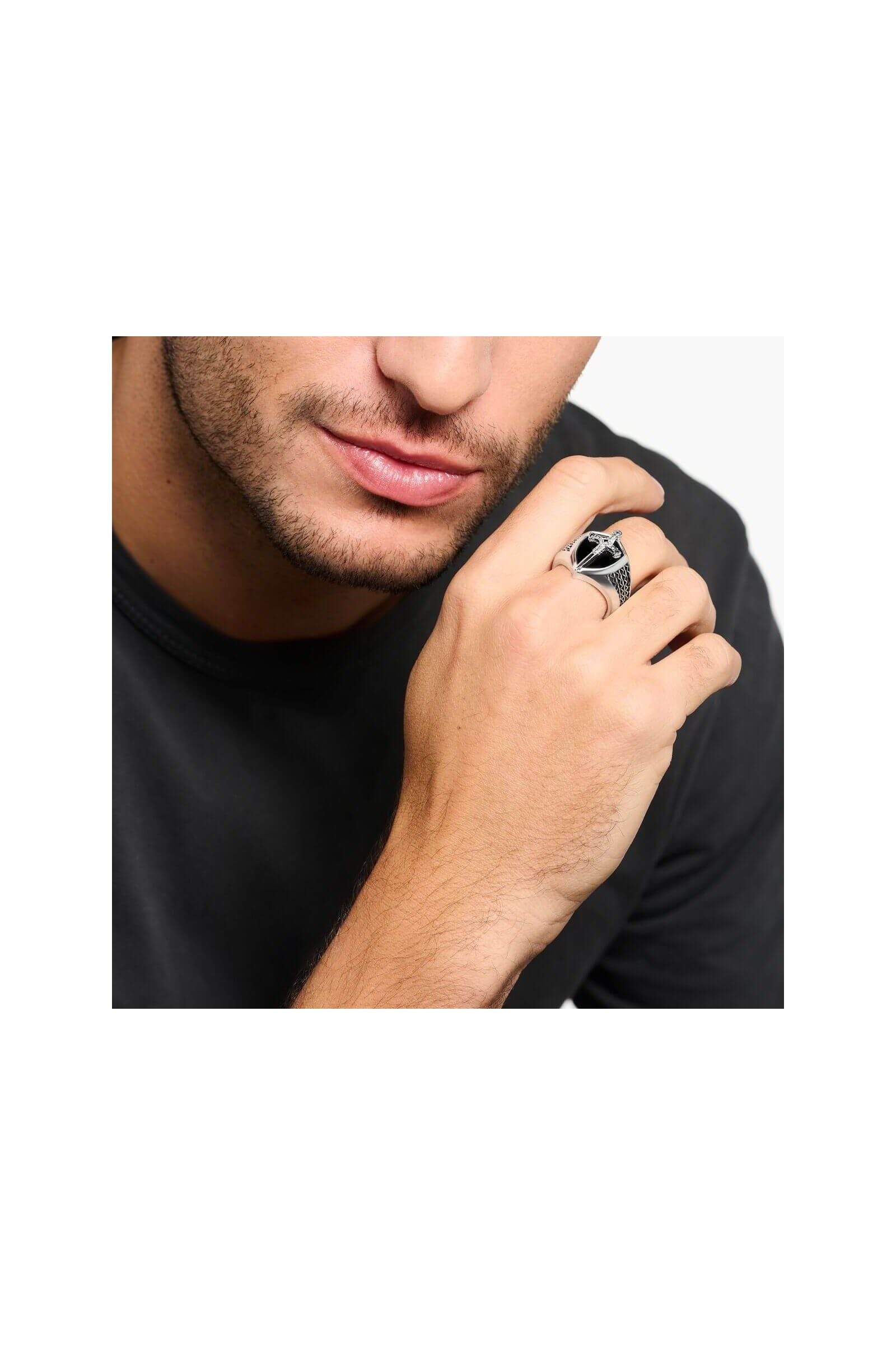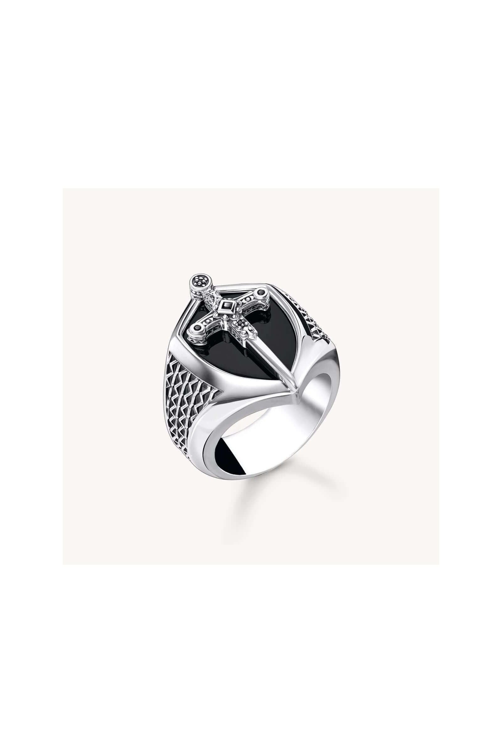 Discover this sword ring in blackened 925 sterling silver, a powerful and refined piece of jewelry by THOMAS SABO. Adorned with a subtle engraving and black zirconia on an onyx insert, it symbolizes strength and dignity. Perfect for asserting a unique style, this signet ring elegantly reinterprets a mythical legend, embodying the bold spirit of the Rebel at Heart collection. Available exclusively online and in our THOMAS SABO stores, this piece of jewelry embodies a charismatic and timeless look.