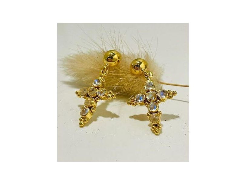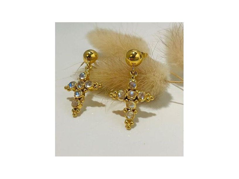 Small precious crosses in vermeil (18-carat gold-plated silver) set with rainbow moonstones with a thousand reflections mounted on studs with a diameter of 4 mm.
