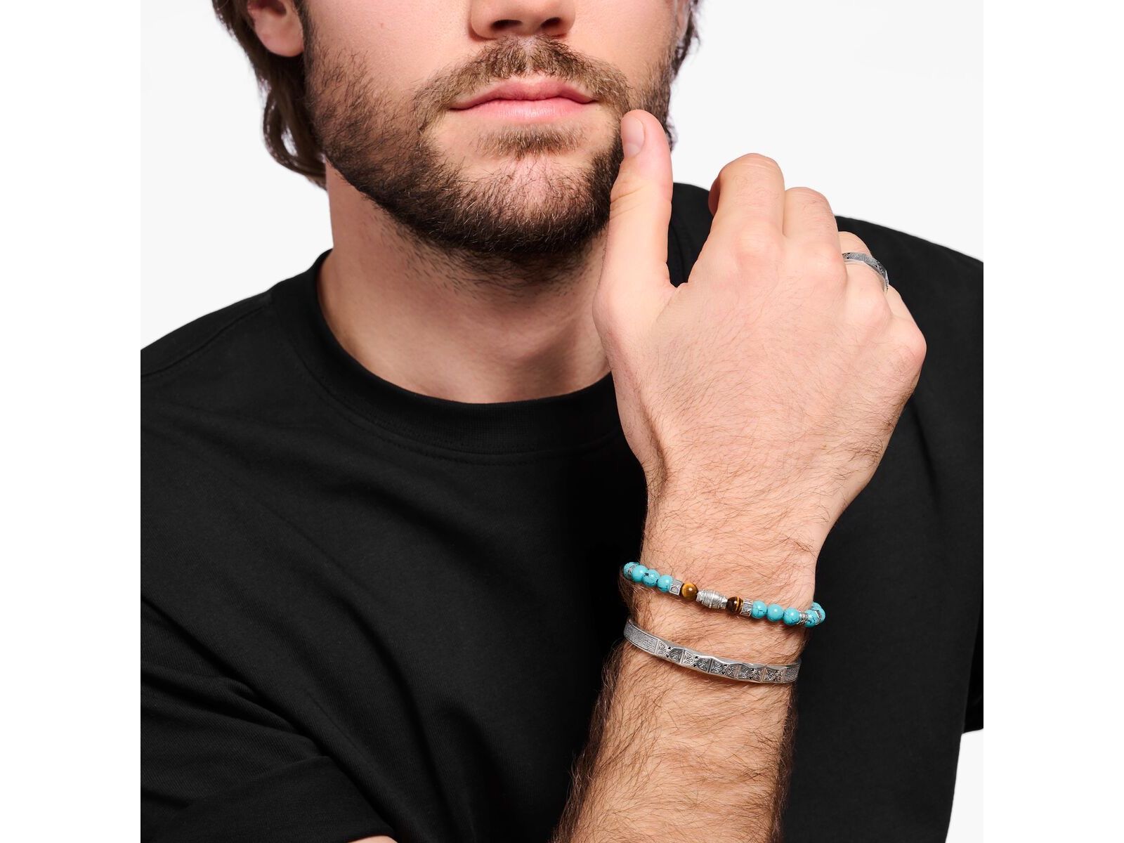 This men's bracelet combines elegance and symbolism with its polished imitation turquoise and tiger's eye beads, enhanced with blackened 925 sterling silver beads. Each bead features artistic engravings depicting a stylized hourglass and the winding path of life, reminding us of the importance of time passing. Available in three sizes (15.5, 17 and 19 cm), this unique piece brings a touch of positive energy and striking style to your wrist.