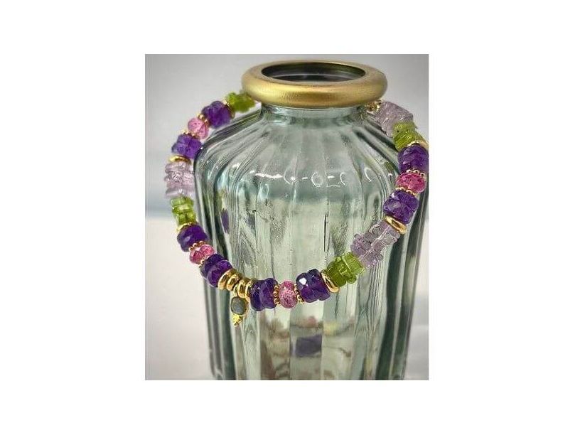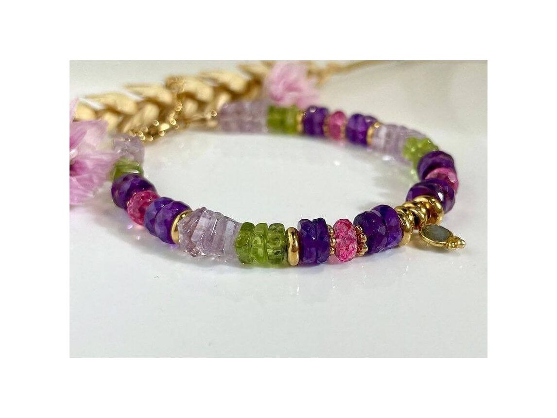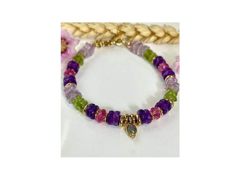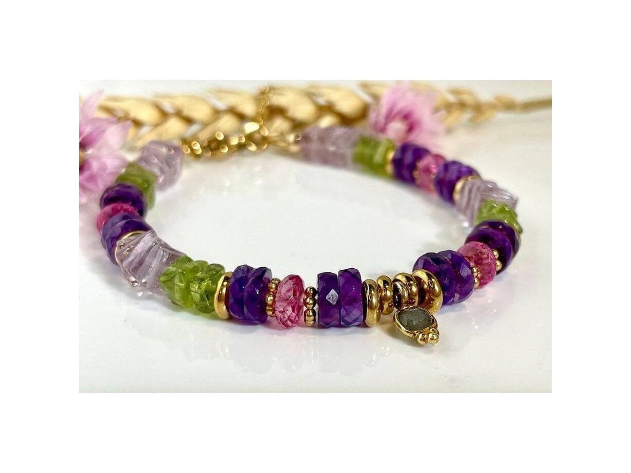 Experience adventure with the Corsica Travel Bracelet! This collection invites you to travel with its amethysts, peridots, topazes, and labradorite talisman. The gold-plated and gold-plated stainless steel finishes add a touch of elegance. Adjustable thanks to its extension chain, it can be stored in the fabric pouch provided.