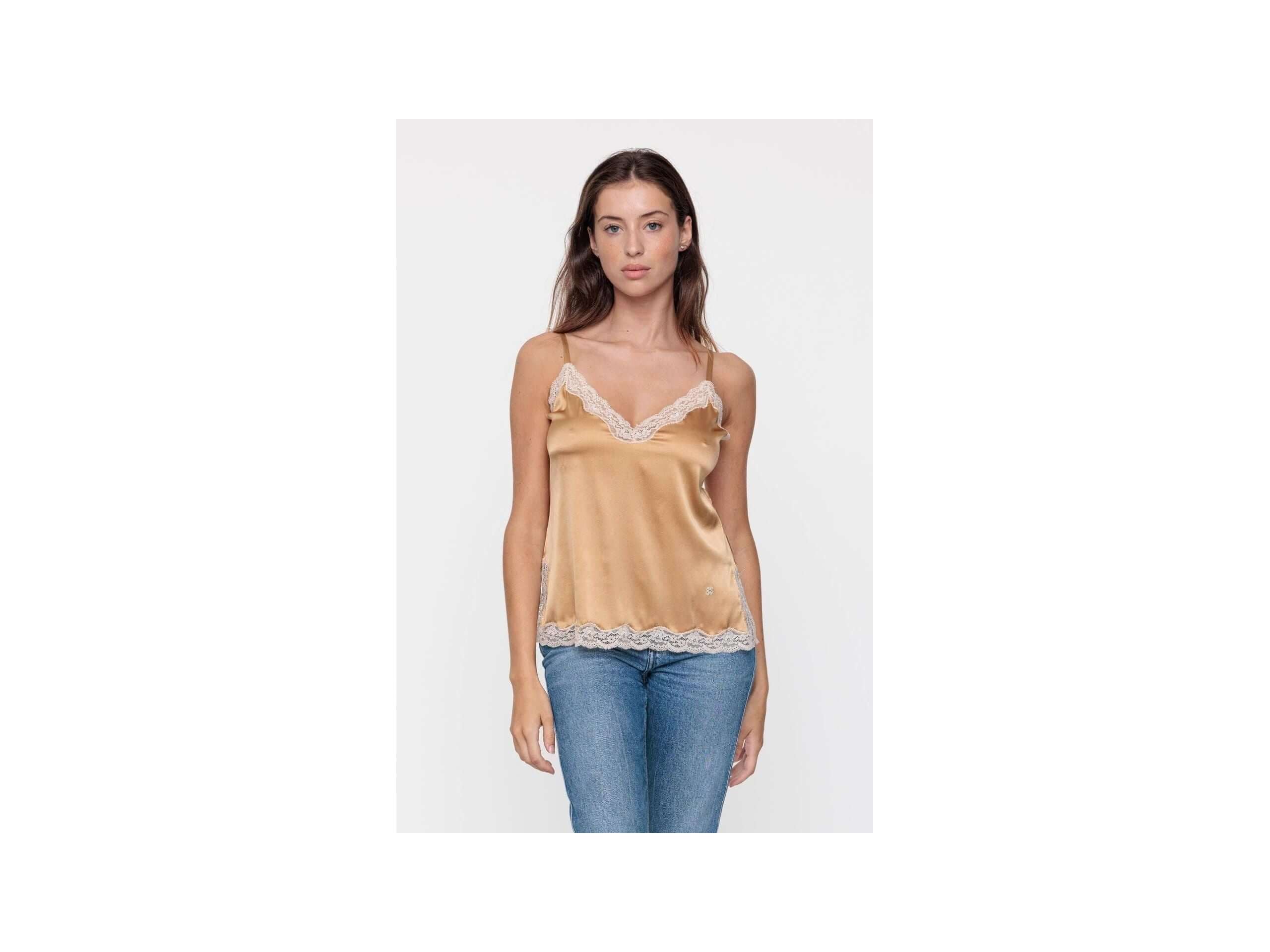 This cappuccino-colored stretch silk camisole is trimmed with cream-colored floral lace.