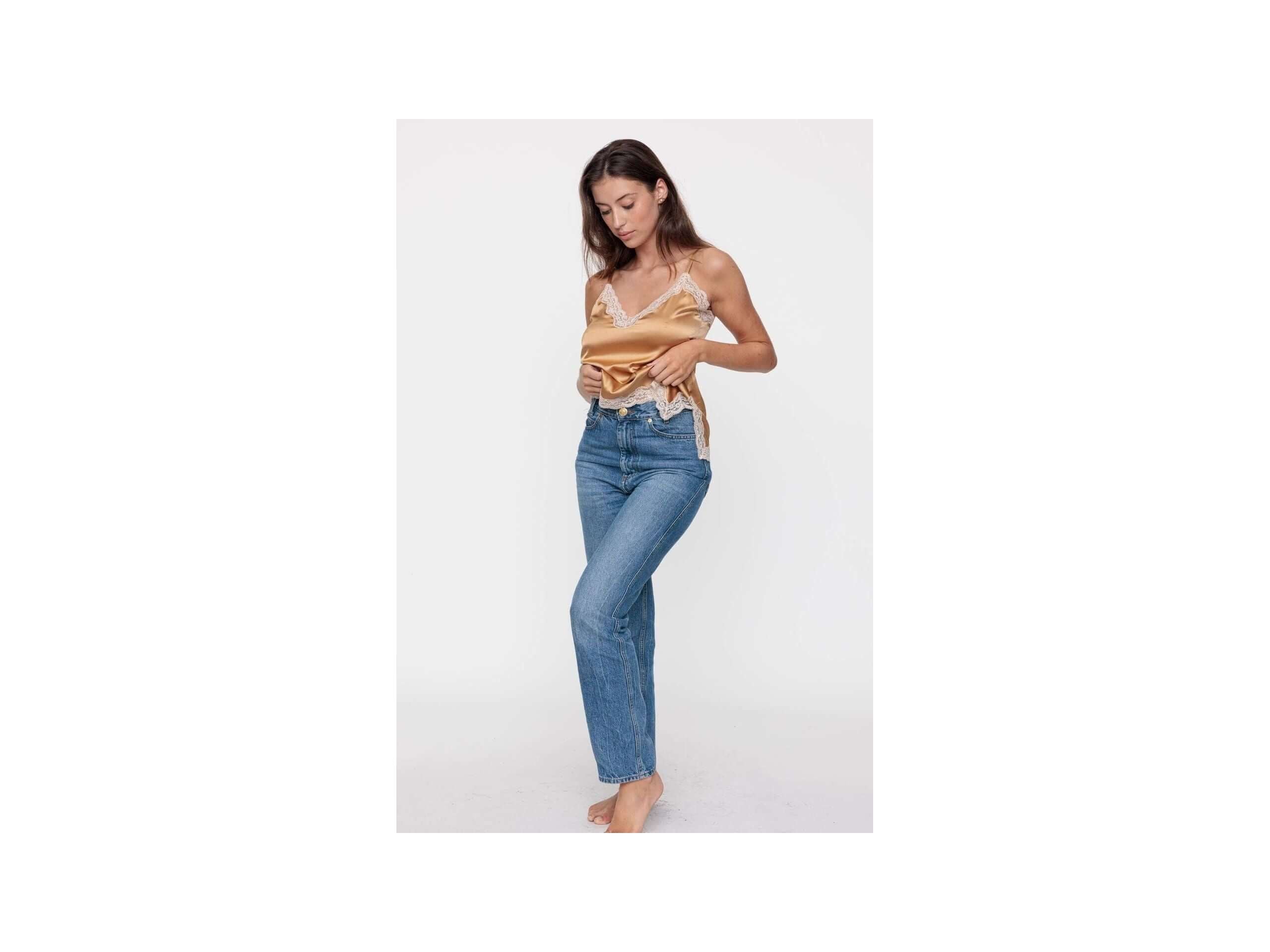 This is the Original, a copyrighted model, the iconic piece from Maison Vannina Vesperini, the basis of the Dessous-Dessus. The straps are adjustable. The V-neckline, upper back, and hem are trimmed with lace.