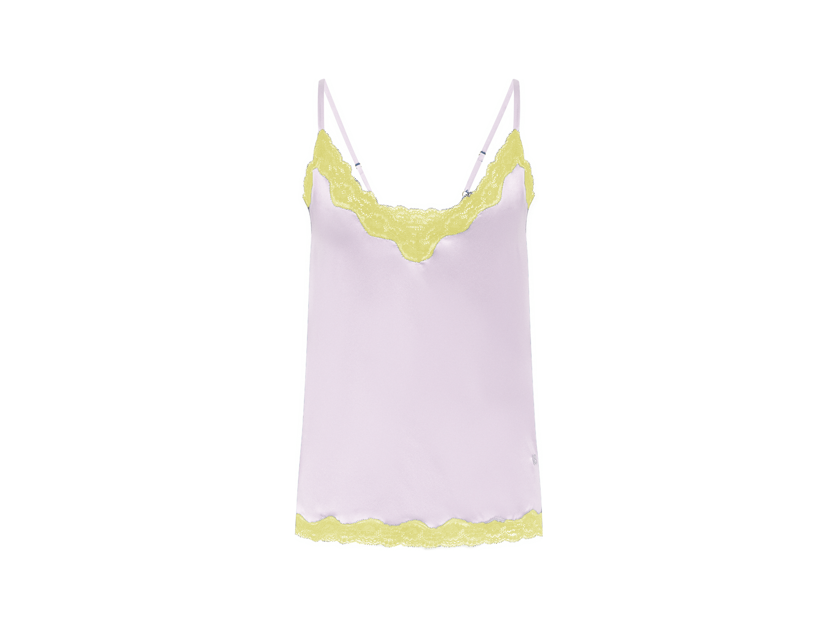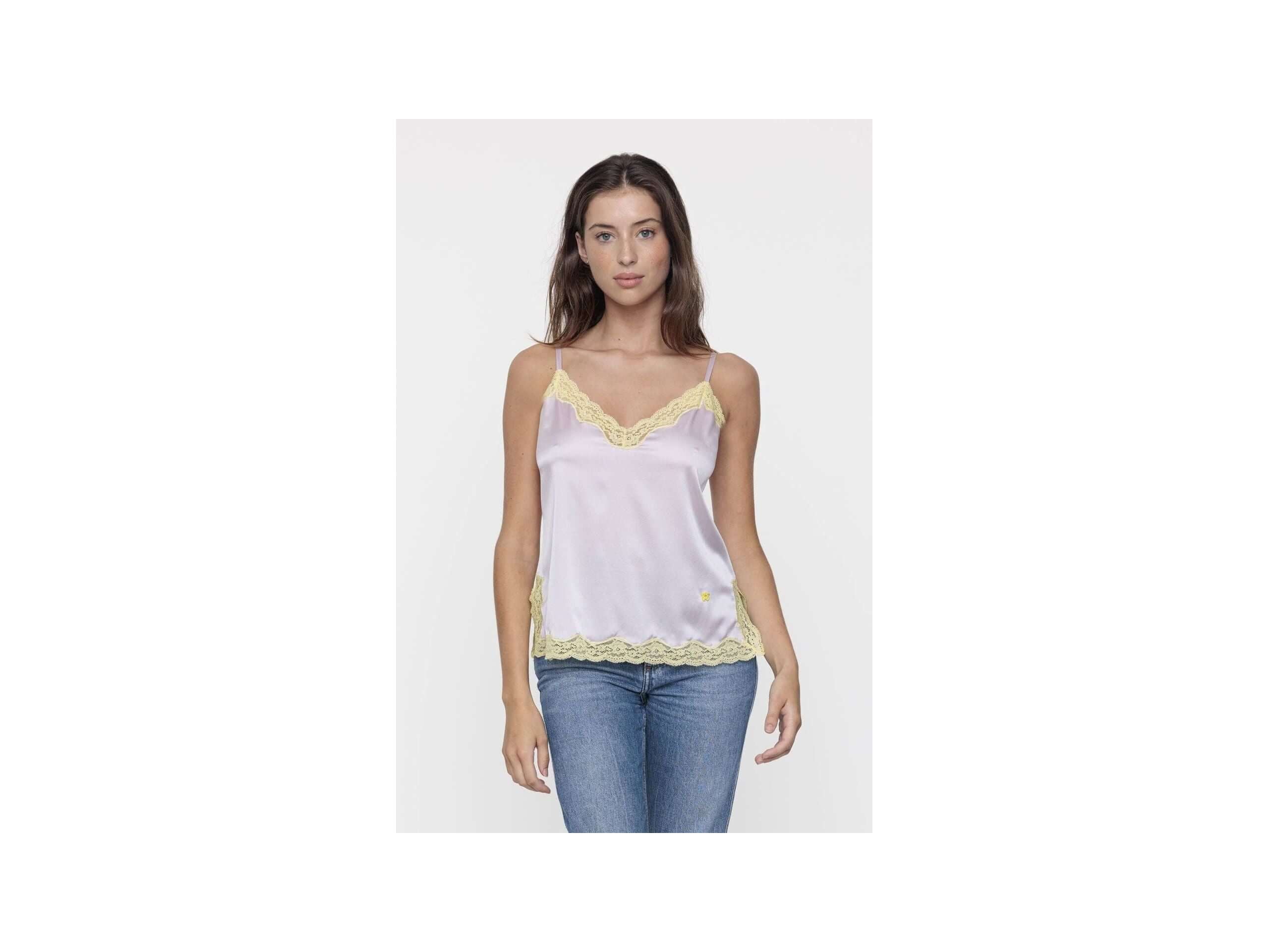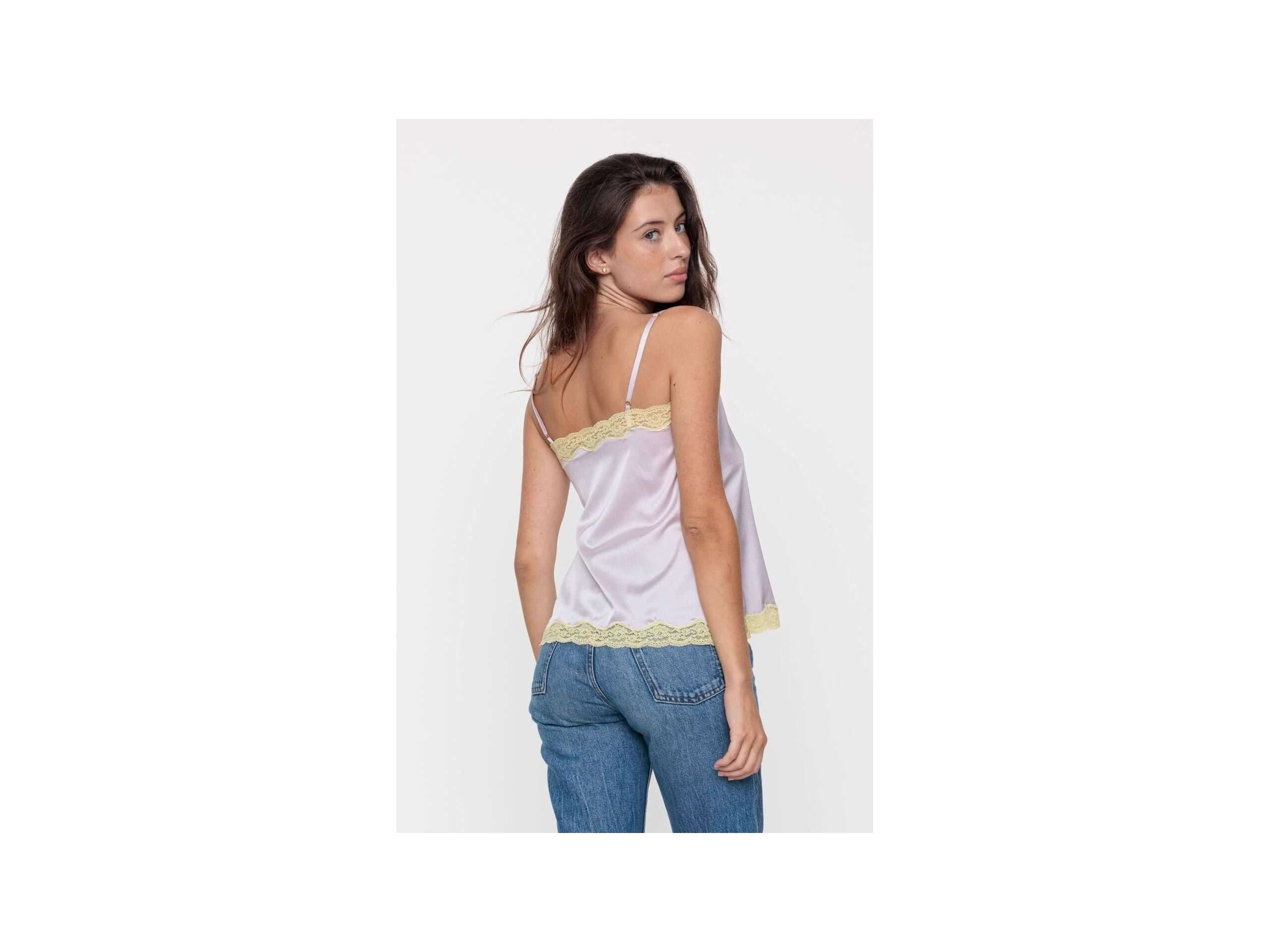 This lotus purple stretch silk camisole is edged with pale yellow floral lace.
