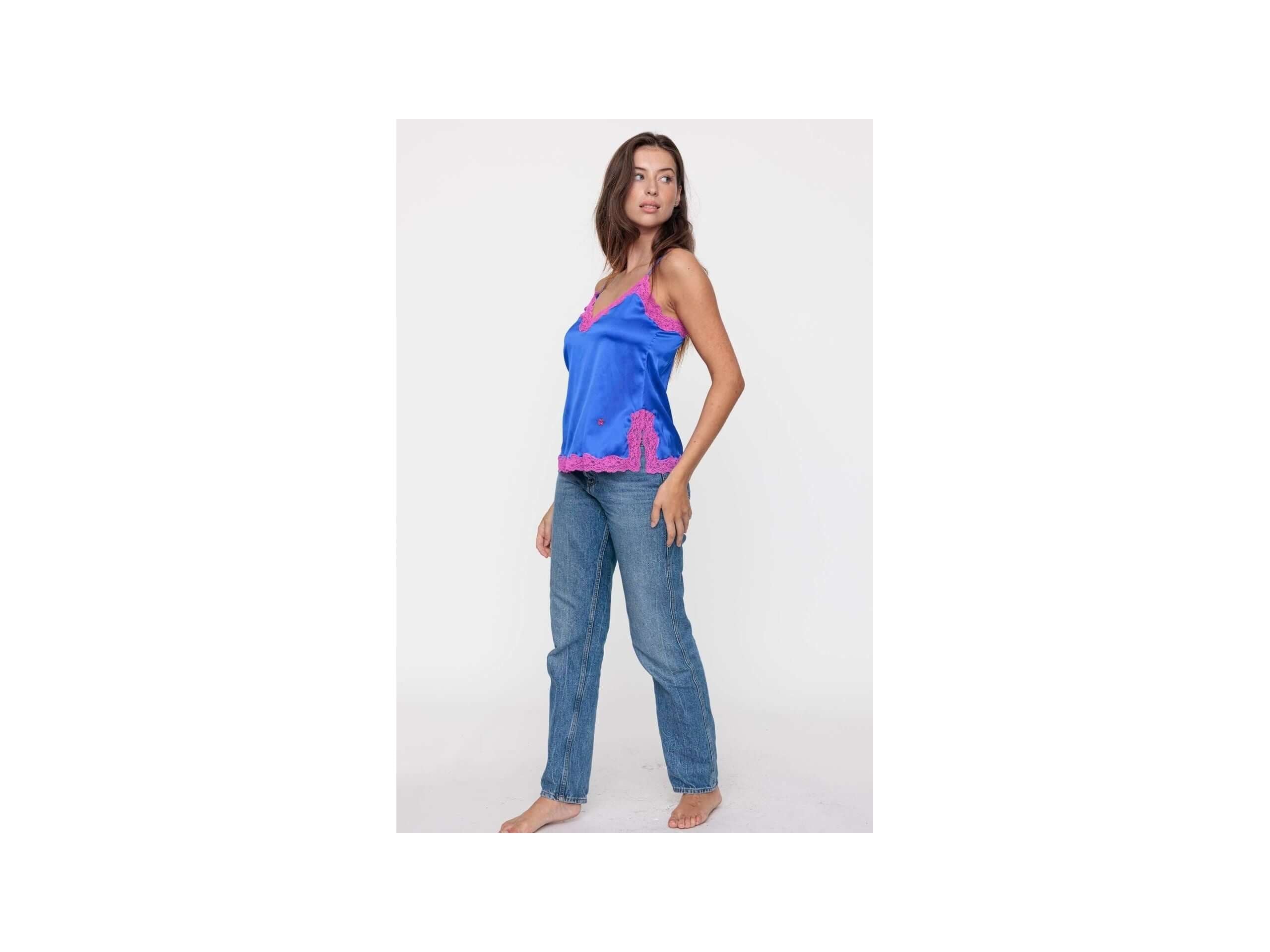 This electric blue stretch silk camisole is edged with pink floral lace.