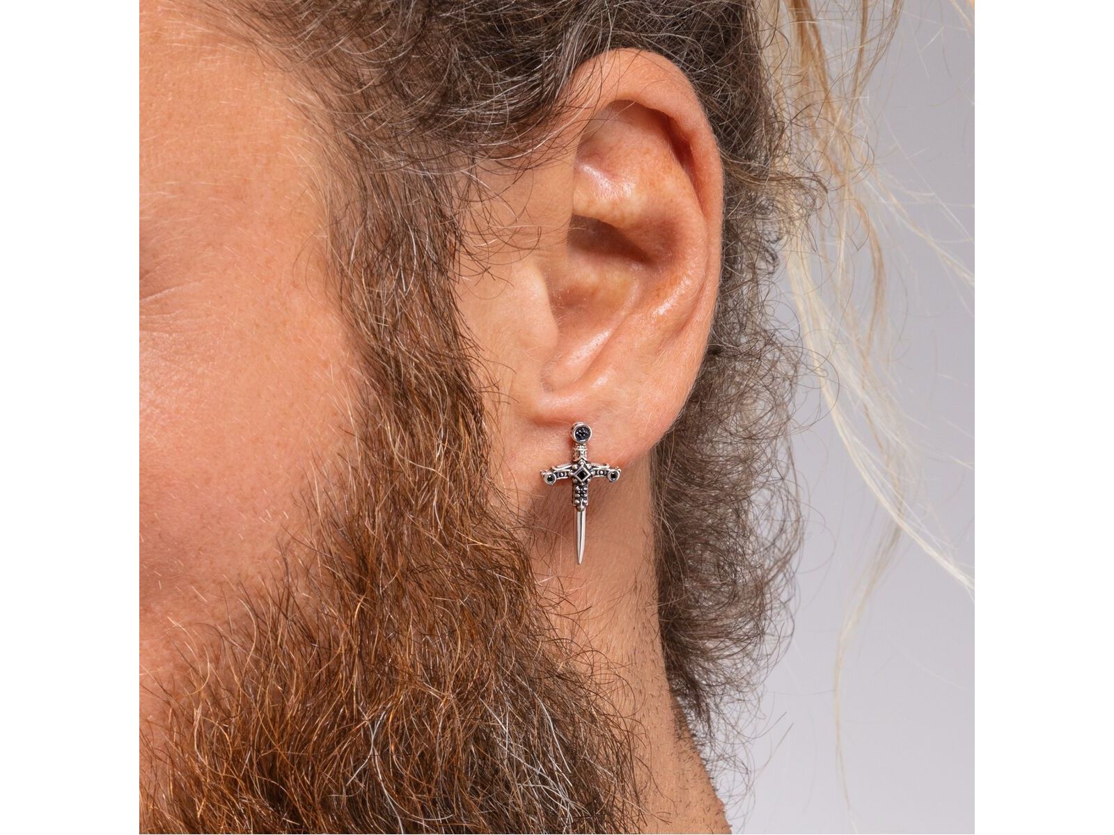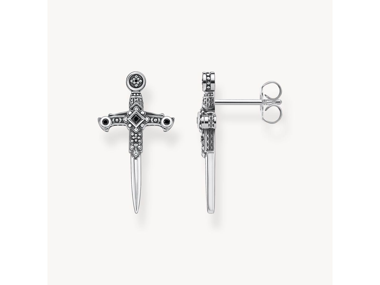 Make a statement with these sword-shaped stud earrings, crafted from blackened 925 sterling silver. Their three-dimensional details, enhanced by sparkling black cubic zirconia, add a touch of elegance and boldness. A unique piece of jewelry to embody your own legend every day.
