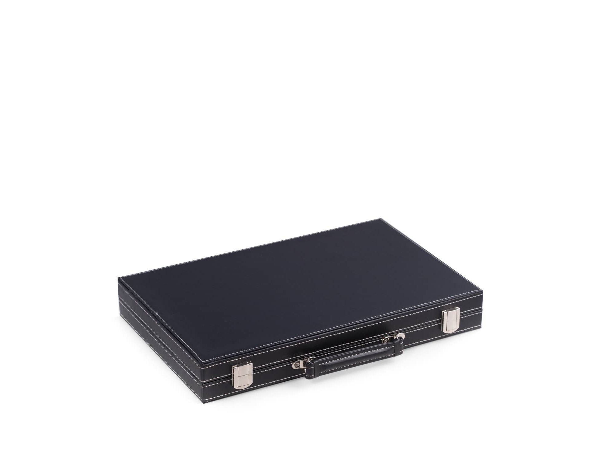 15" black leatherette backgammon set with chrome accents. Wooden playing pieces. Leather dice cups. Smooth felt lining.