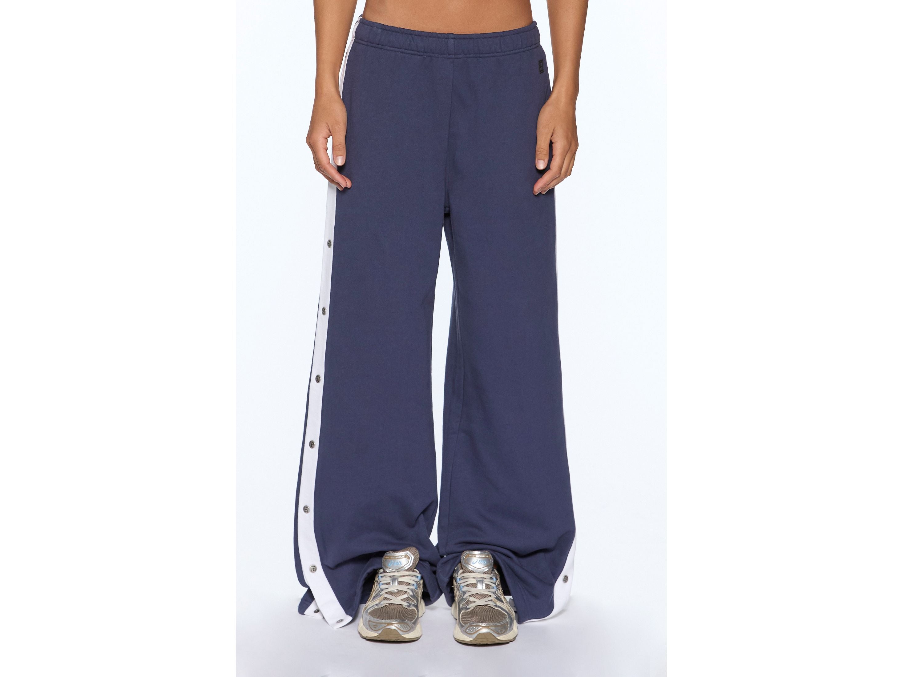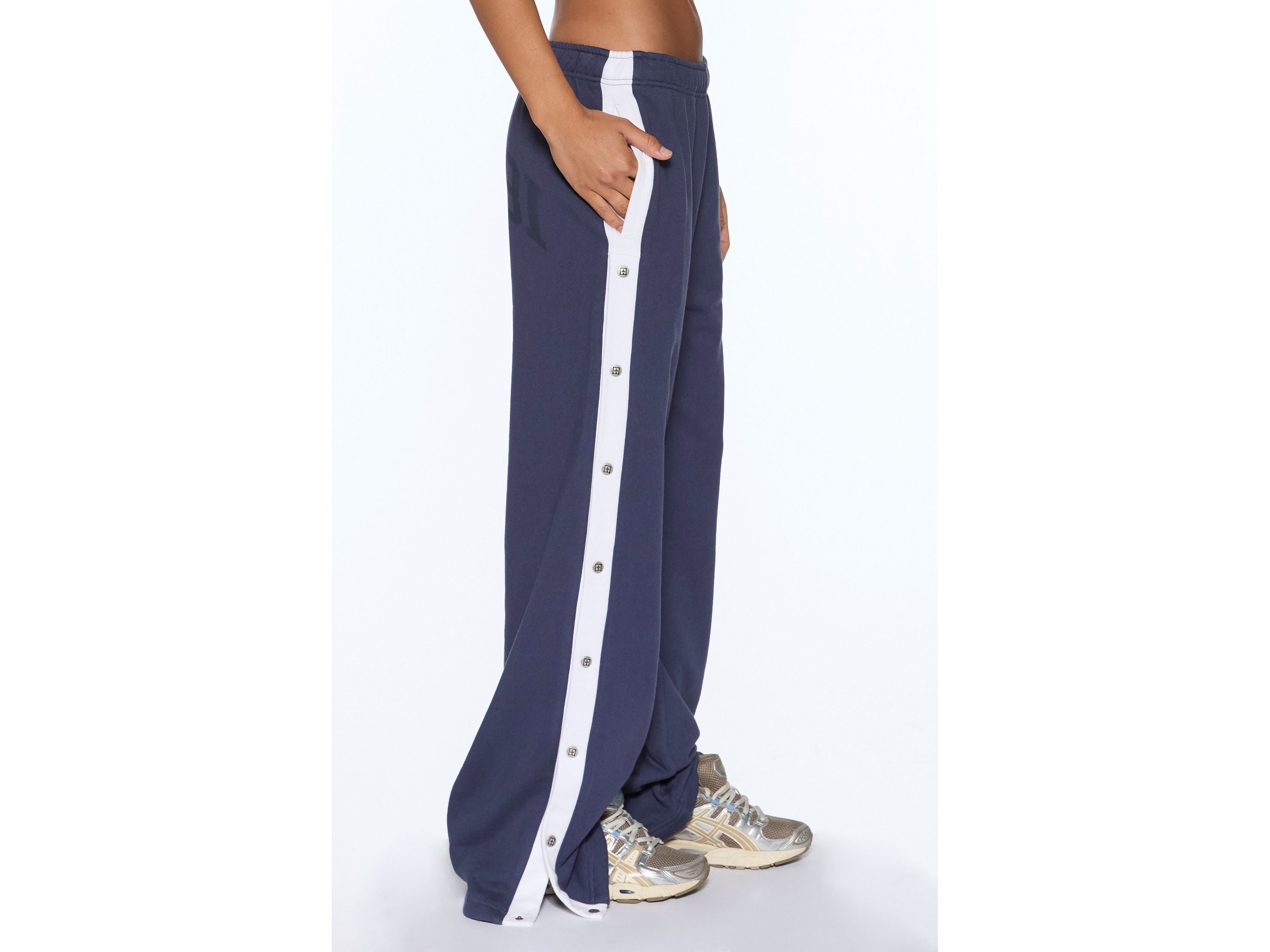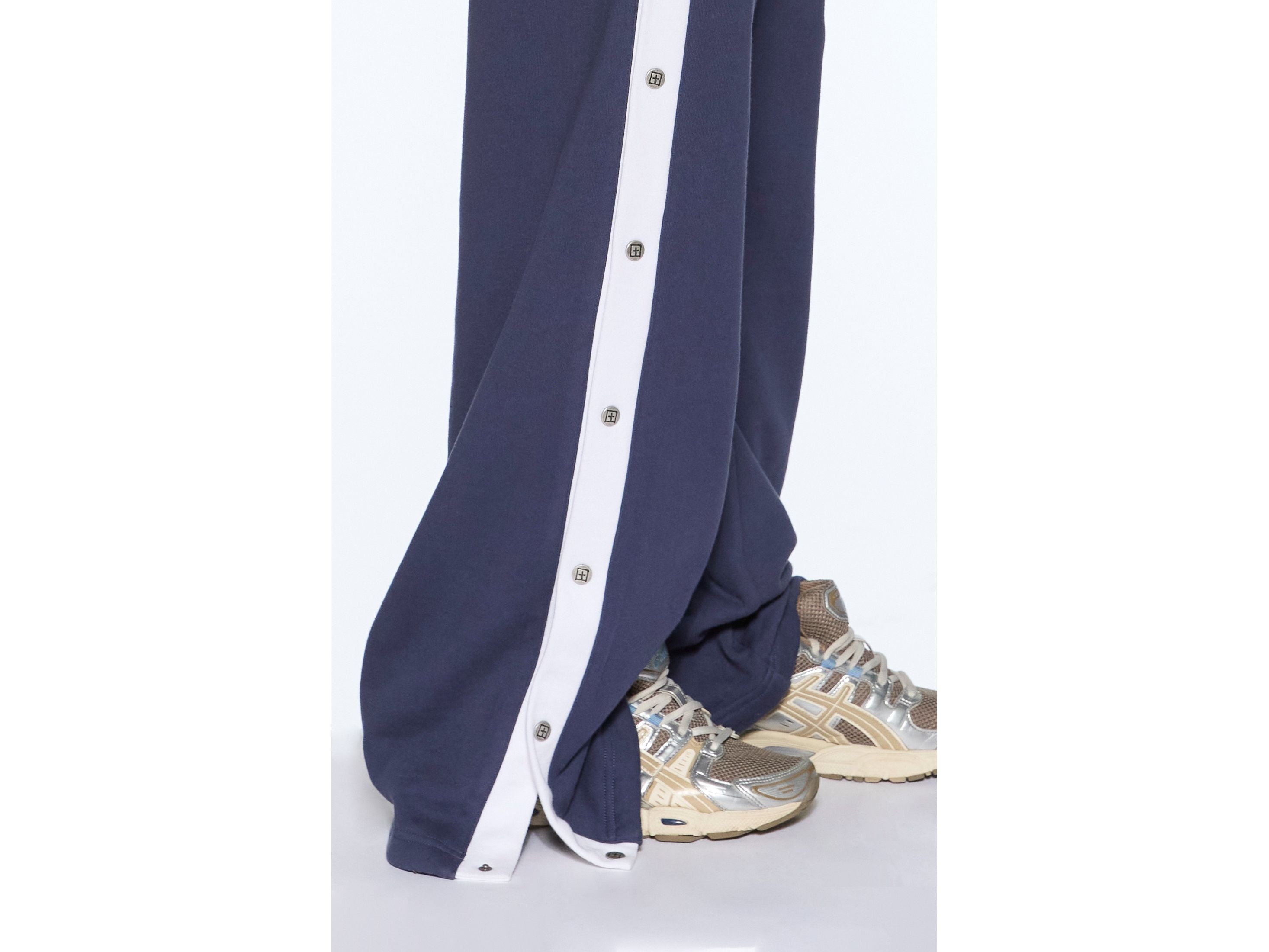 These wide-leg sweatpants, with an adjustable elastic waistband and drawstring, are designed to sit mid-rise. They feature a side panel with snap closure, inset welt pockets, and a filigree "Ksuib" patch with embroidered outline on the back. Crafted from midweight cotton fleece, this two-tone ink blue and white style features a T-box front print, as well as Ksubi 3x4 and T-box embroidery. Pair them with the Vintage White 99 Boyfriend Polo for a complete look.