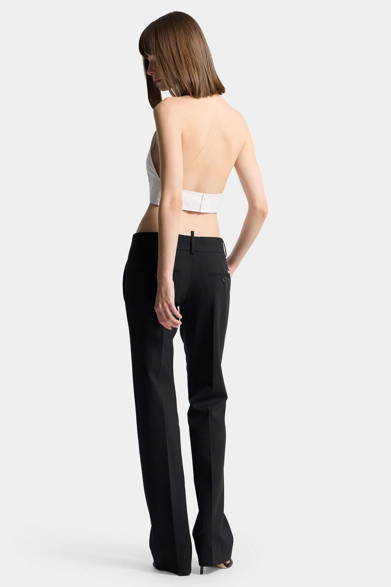 La silhouette intemporelle du cigarette trouve ici sa forme idéale : confectionné en laine peignée tropicale avec une légère élasticité, ce pantalon épouse la jambe avec élégance tout en offrant une liberté de mouvement subtile. Les plis marqués sur le devant soulignent sa finition raffinée et structurée. Associé à des talons aiguilles, il crée instantanément une ligne allongée et flatteuse. Fabrication italienne.