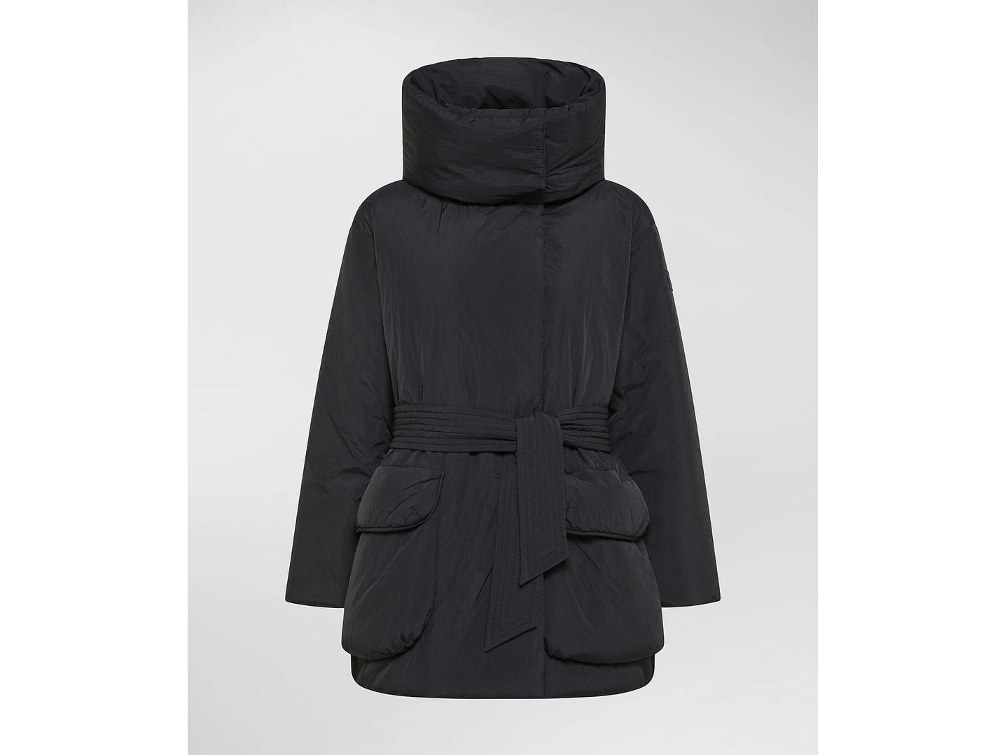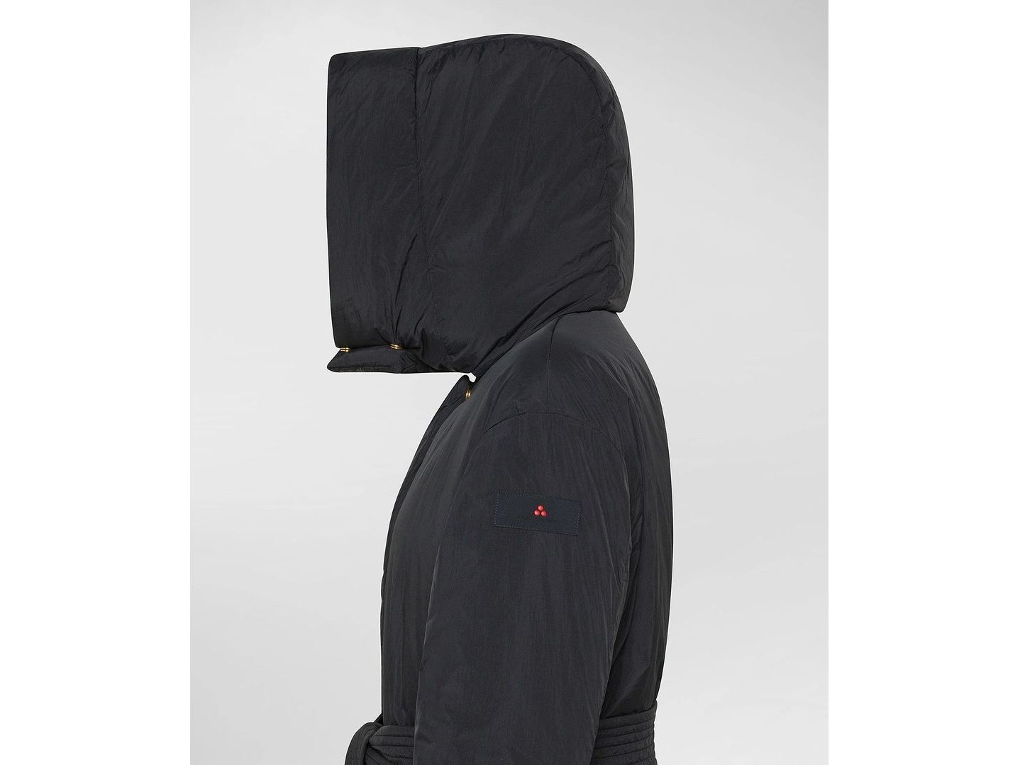 This ultra-lightweight nylon canvas parka boasts a unique crinkled look, achieved through a special dyeing and finishing process. Its soft texture and sophisticated matte finish reveal an understated elegance. With recycled synthetic padding, it offers long-lasting, environmentally friendly thermal comfort. Its minimalist cut with modern volumes, accentuated by a belt at the waist, hugs the body without weighing it down. The shirt collar transforms into an adjustable hood with snaps, while the large front pockets reinforce the cocoon-like feel. Water-repellent, it provides lightweight protection all winter long.