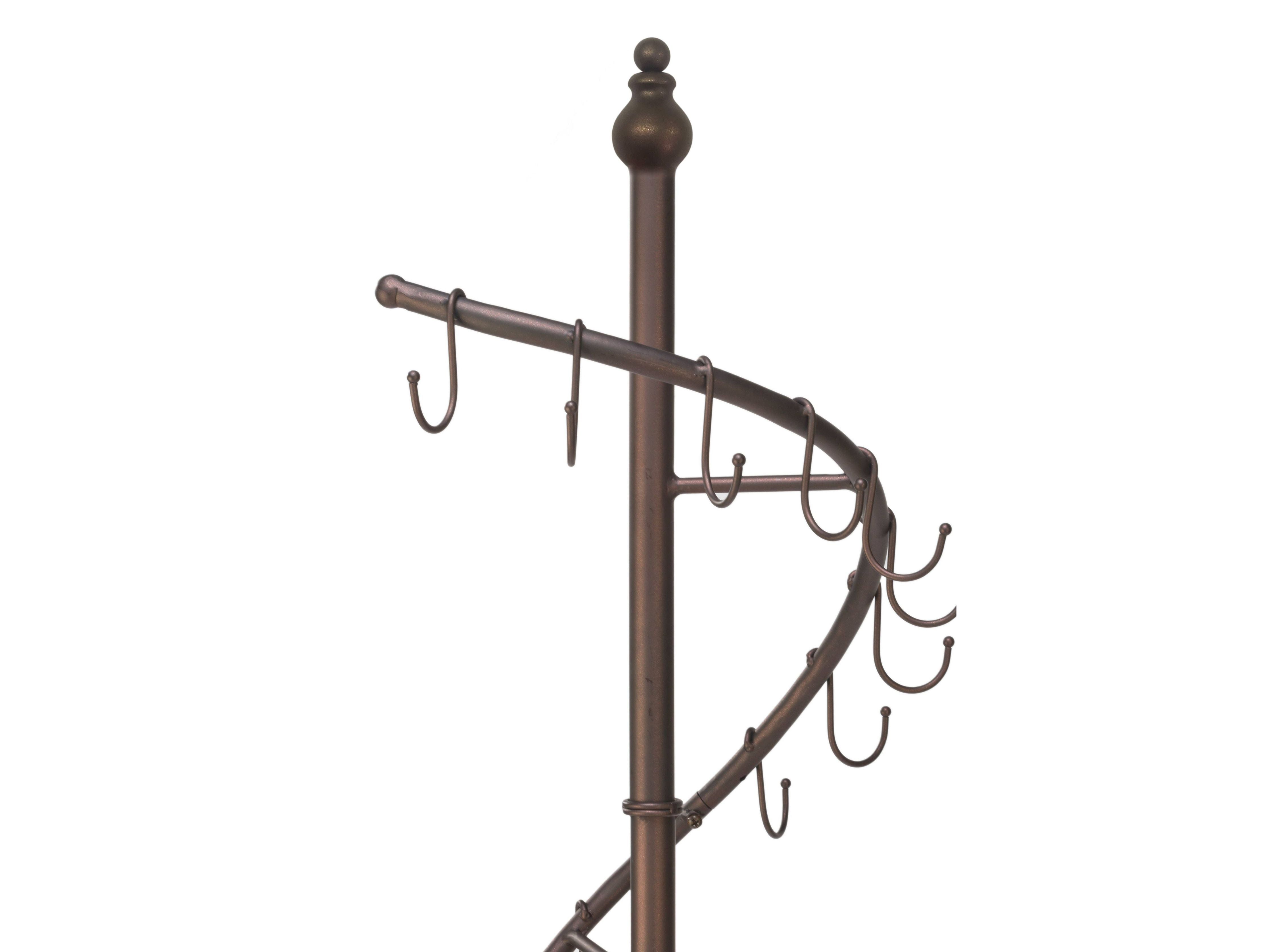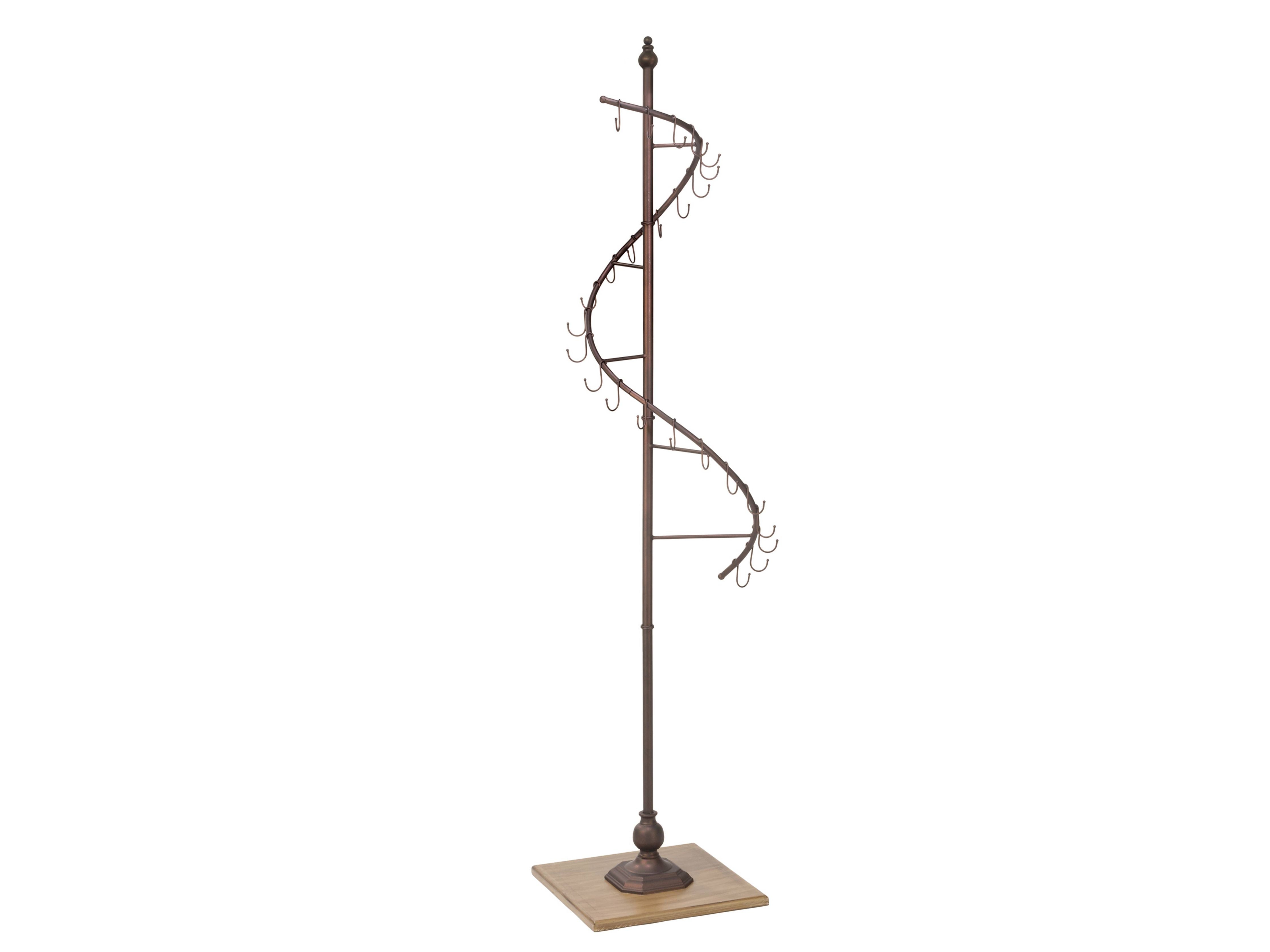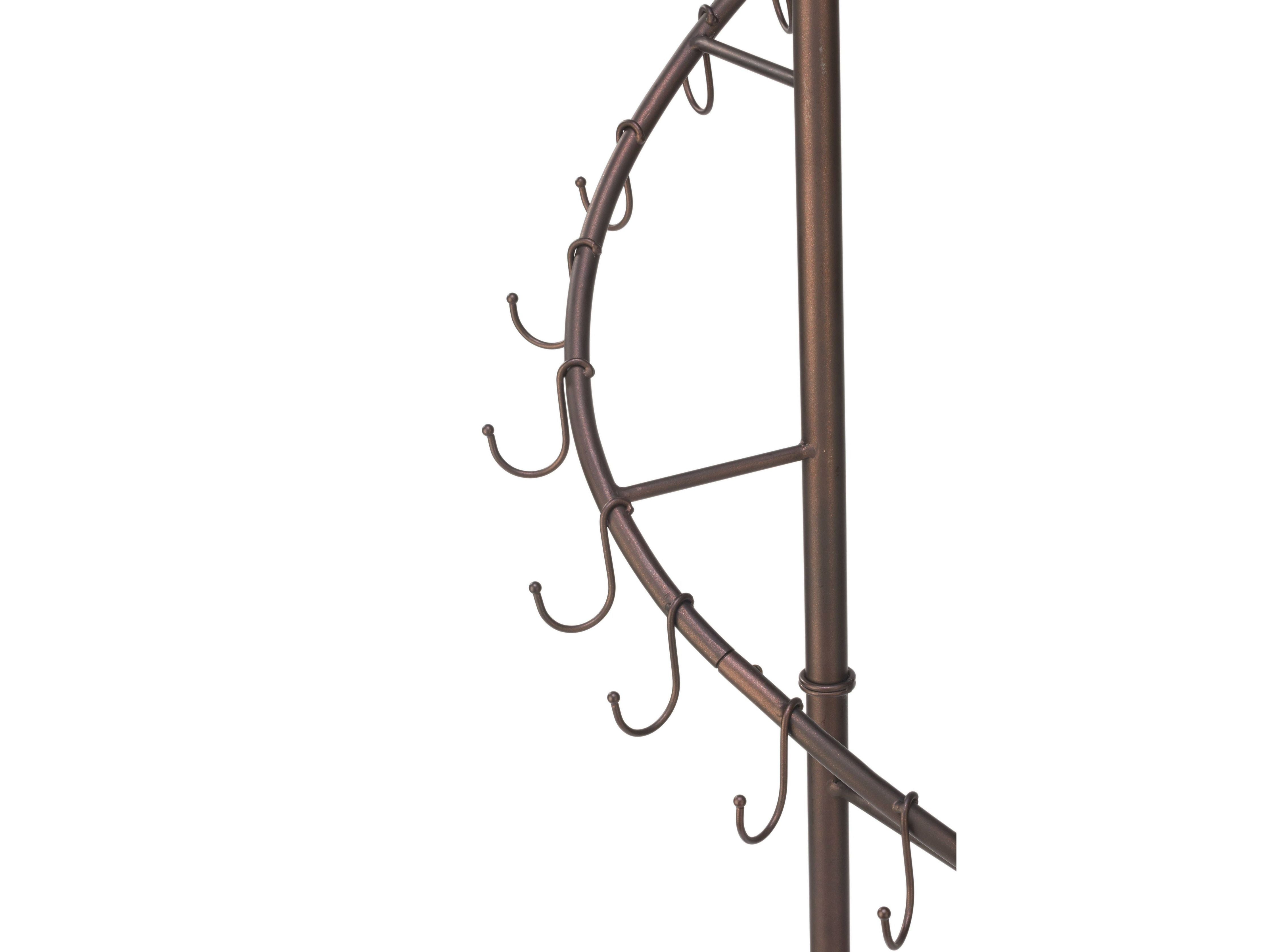 Organize scarves, handbags, belts, and more in your closet or bedroom with this bronze-colored rotating bag tree on a modern wooden base. This item features a wood veneer base and 17 hooks that can display more than one item depending on its size. With elegant and functional design details, this bag tree brings style to your display. Featuring a metal frame on a sturdy square wooden base. Height is not adjustable.