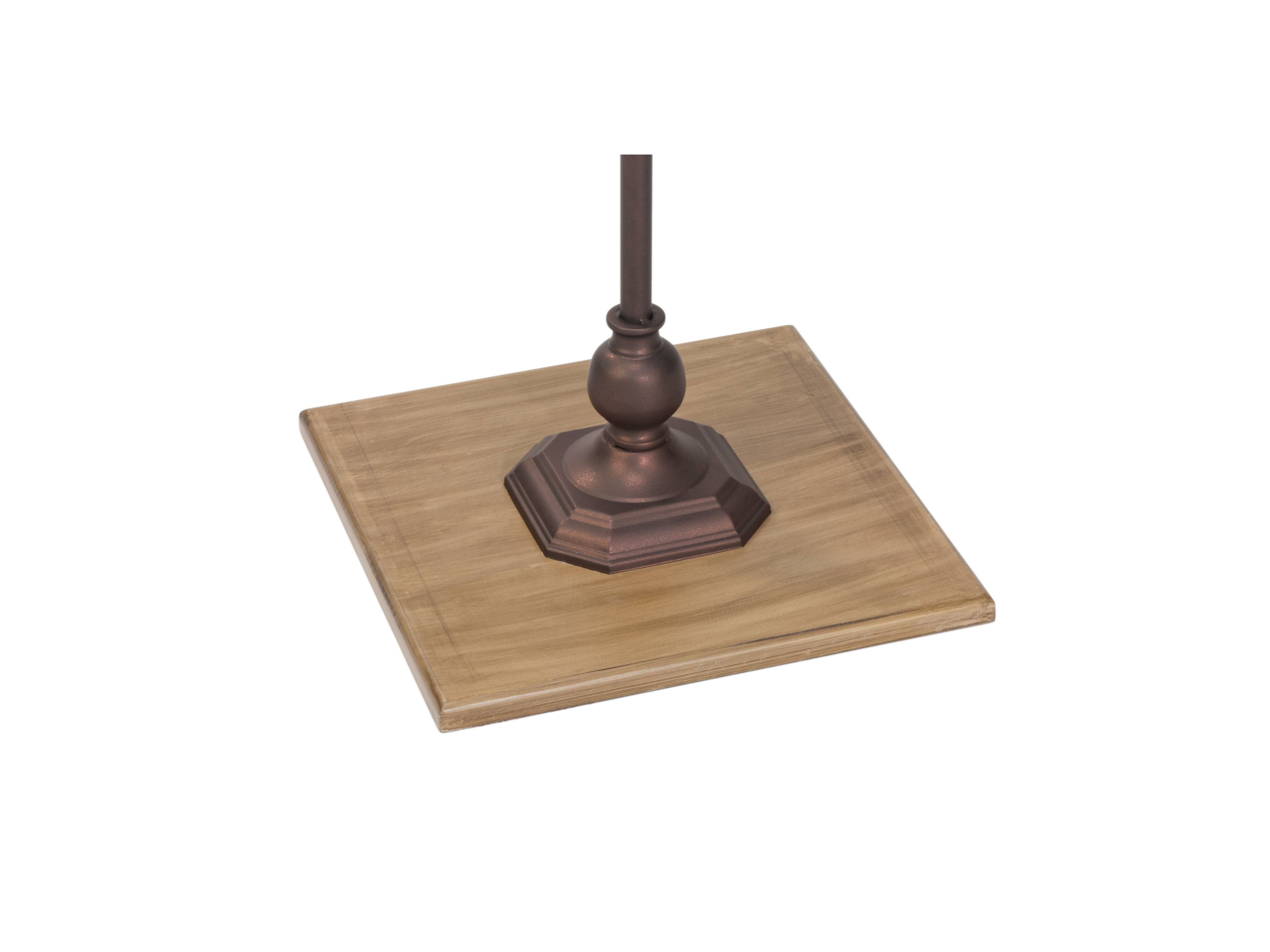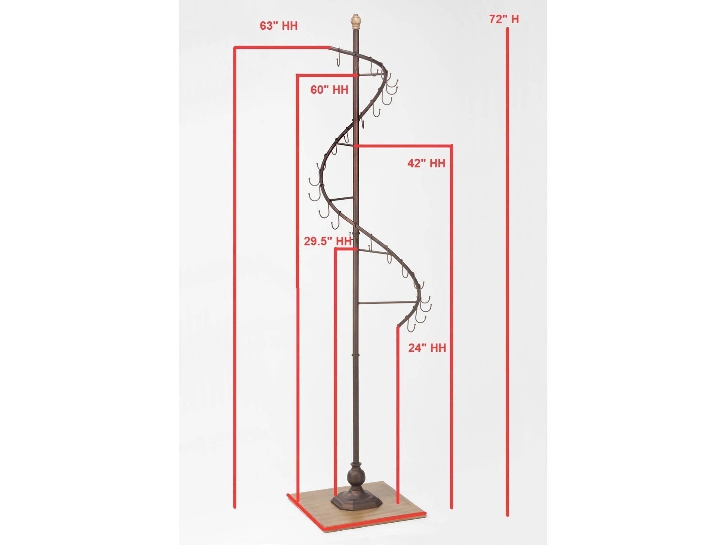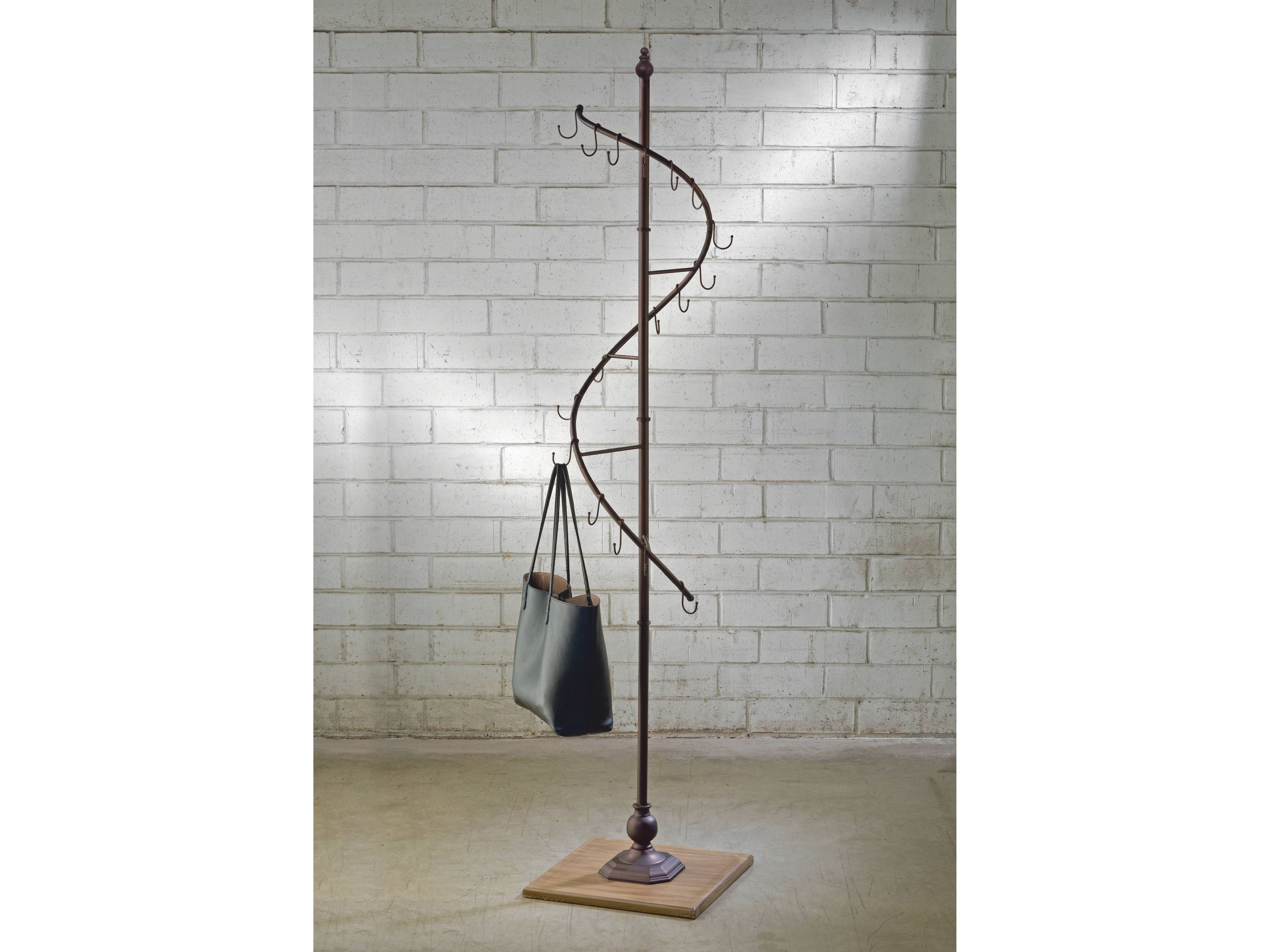 Organize scarves, handbags, belts, and more in your closet or bedroom with this bronze-colored rotating bag tree on a modern wooden base. This item features a wood veneer base and 17 hooks that can display more than one item depending on its size. With elegant and functional design details, this bag tree brings style to your display. Featuring a metal frame on a sturdy square wooden base. Height is not adjustable.