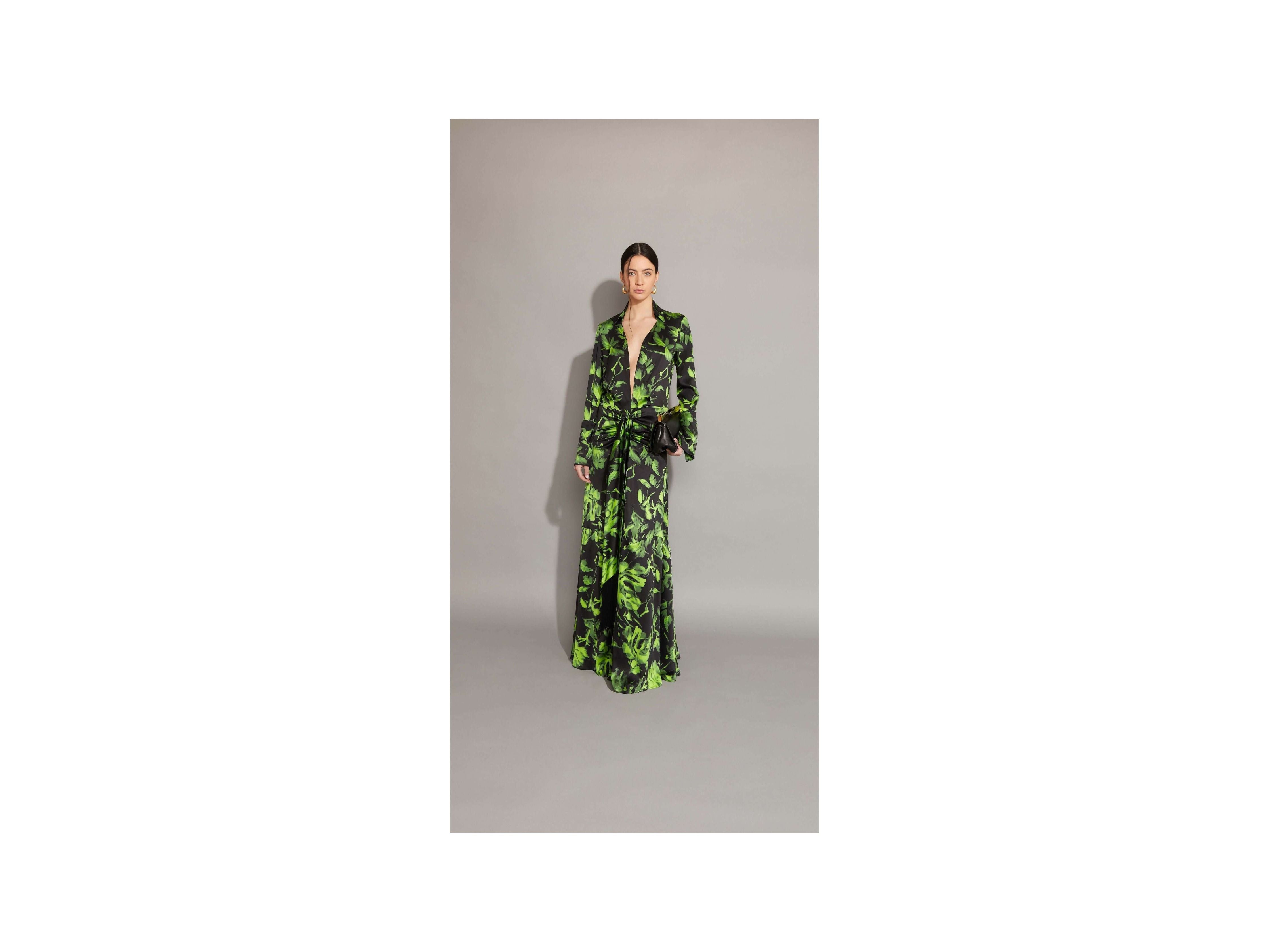Long fitted dress with shirt collar and neckline; large belt with fringed ends.