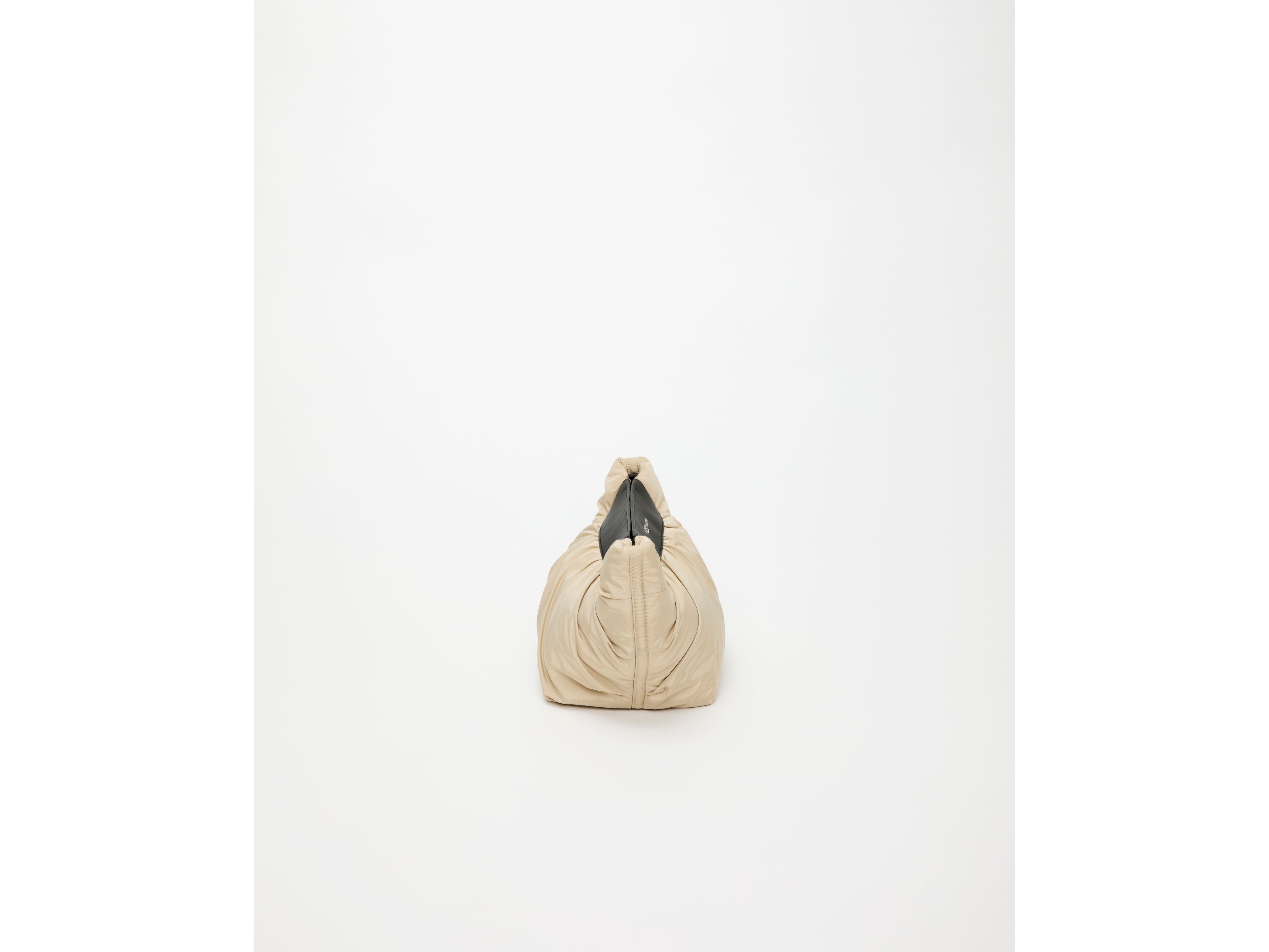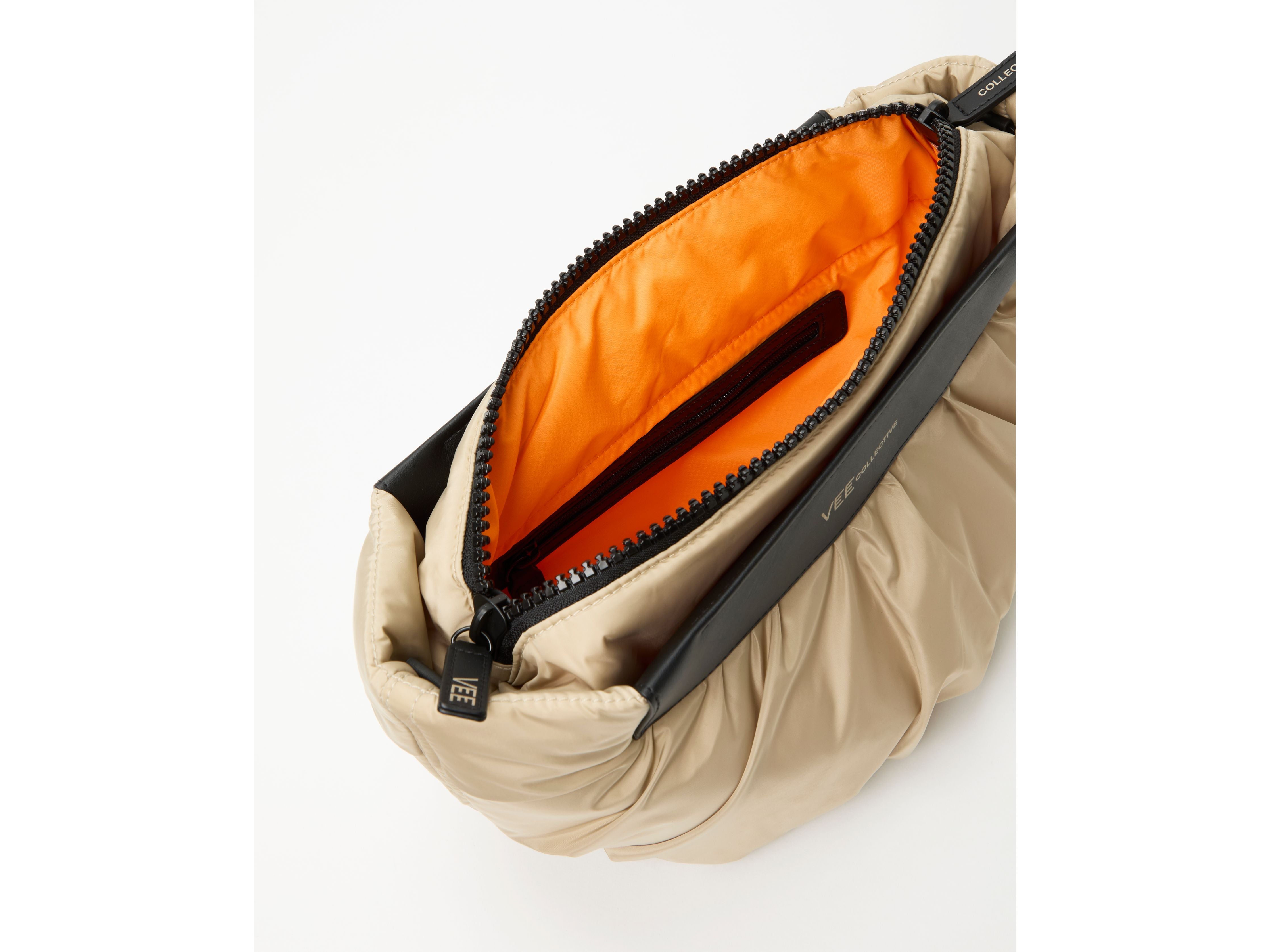 Inspired by vintage bomber jackets, the beige Caba Cluch bag combines boldness and modernity with its elegant proportions and refined gathers. Versatile, it can be carried by hand or across the body thanks to its removable strap, perfect for everyday use. Its orange interior lining adds a pop of color, while its zippered and mesh compartments make it easy to organize your phone, tablet, and other essentials. Lightweight and secure thanks to its magnetic closure, this bag combines style and practicality with elegance.