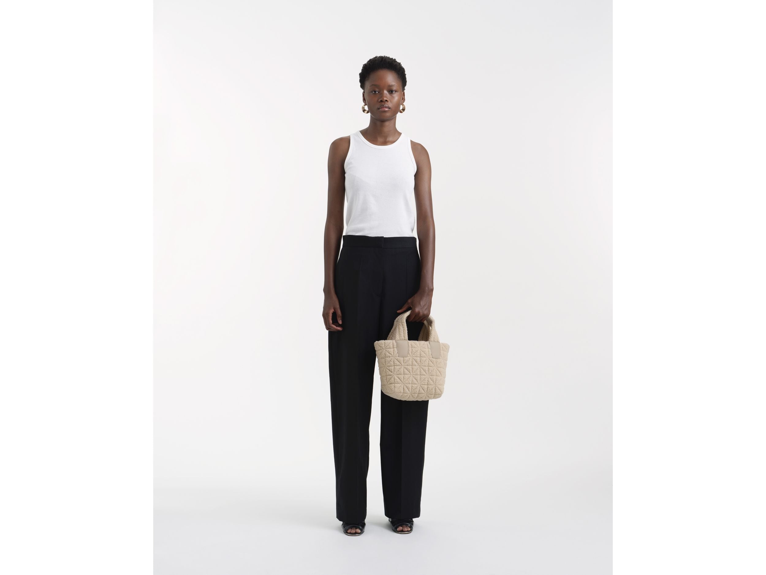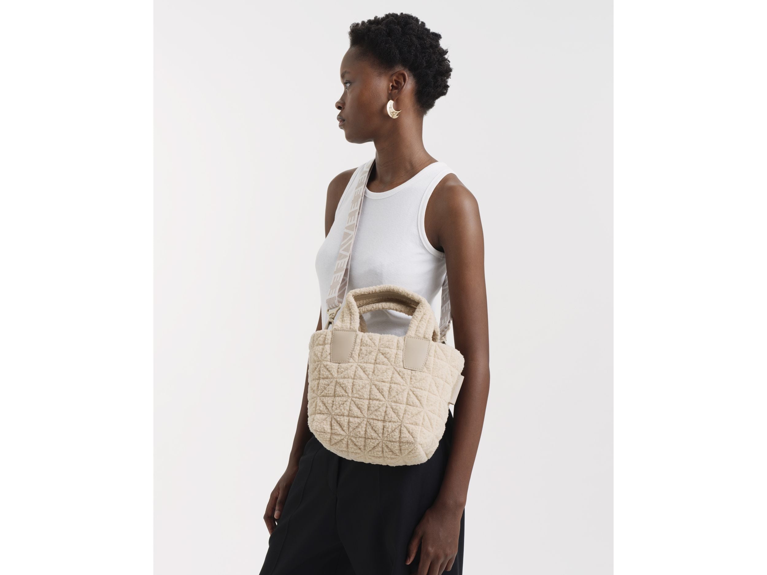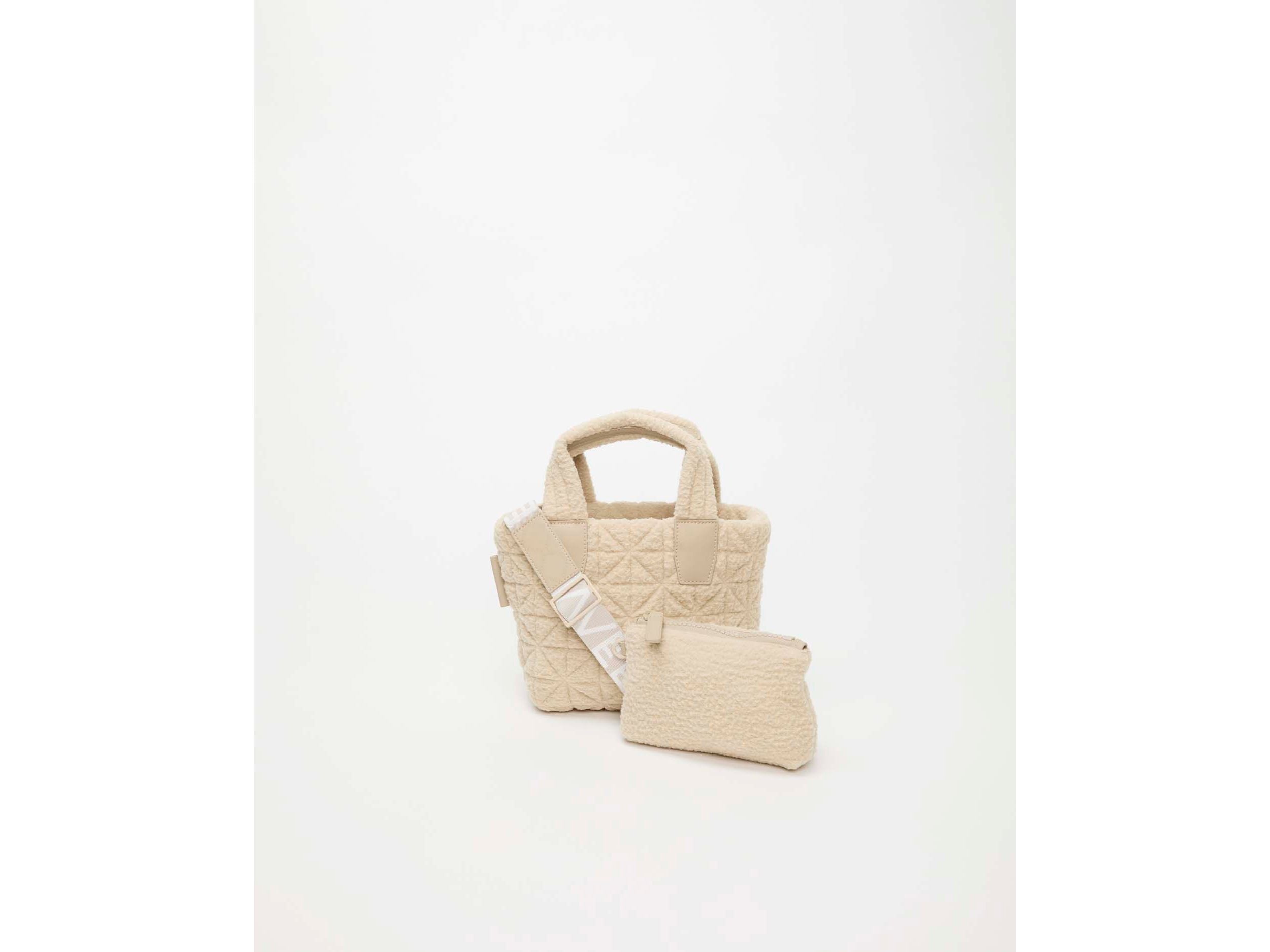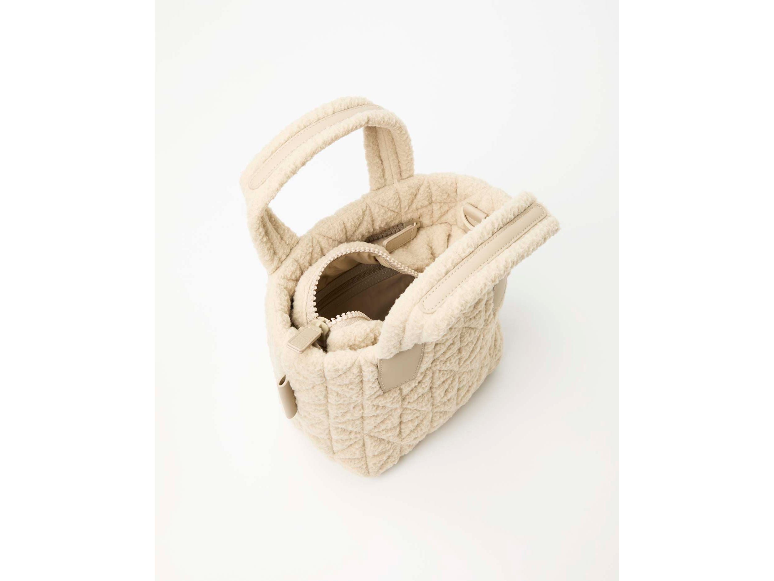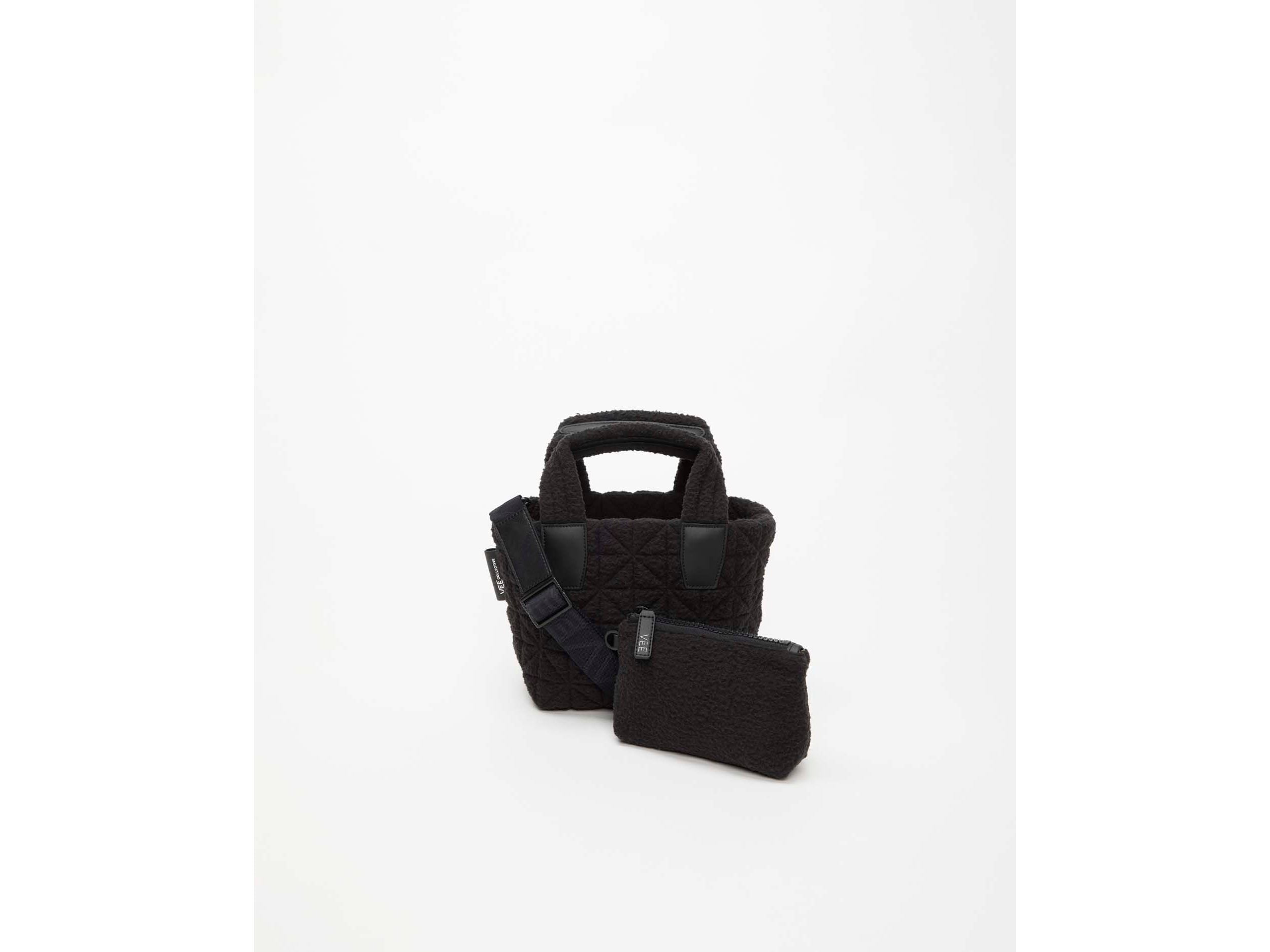 The Vee Tote Mini Bag, designed with a soft, modern sherpa detail, combines style and practicality. Its tanned leather-colored interior lining includes multiple compartments for organizing phones, tablets, and accessories. Lightweight and compact, this versatile bag includes a separate nylon pouch and a removable shoulder strap, ideal for comfortable everyday wear. A perfect choice for those who want to combine fashion and functionality on every outing.
