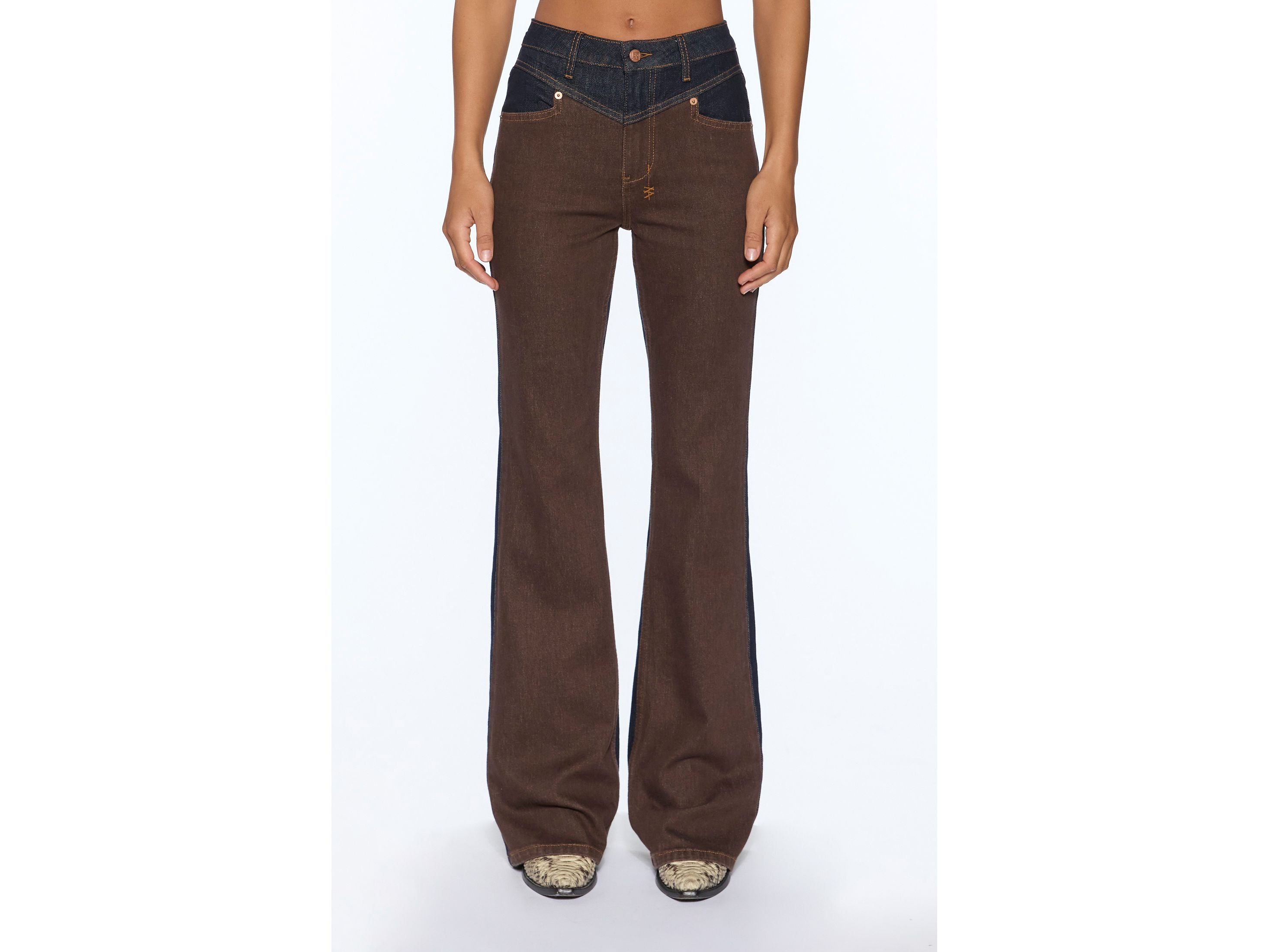 Mid-rise, full-length bootcut jeans. Made from comfortable stretch denim, combining quality washed raw denim with patchwork overdyed brown denim. They feature a classic five-pocket silhouette, signature Ksubi anti-tarnish buttons, and T-box and 3x4 embroidery. A removable label adorns the back pocket. Pair them with the Saddle Brown Slim Trucker for a complete look.