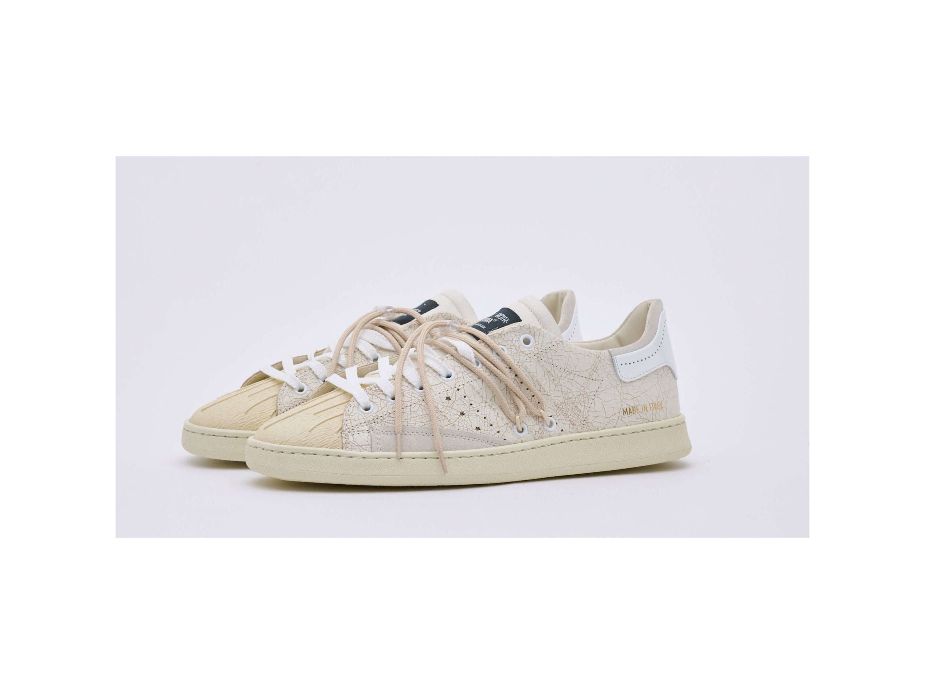 The Stripeless Ultimate Dual Atari Sneakers in Antique White/Ivory combine the spirit of 1980s tennis shoes with the energy of hip-hop for a bold, contemporary style. Made in Italy from premium leather, they feature a unique Dual System lacing that extends to the sole, providing exceptional comfort. The textured toe cap and "Stripeless" hot stamping demonstrate meticulous craftsmanship. With their durable rubber sole, these sneakers embody the perfect blend of style, quality, and originality.